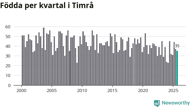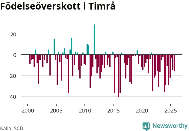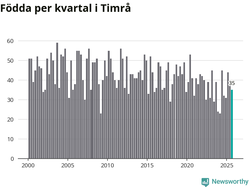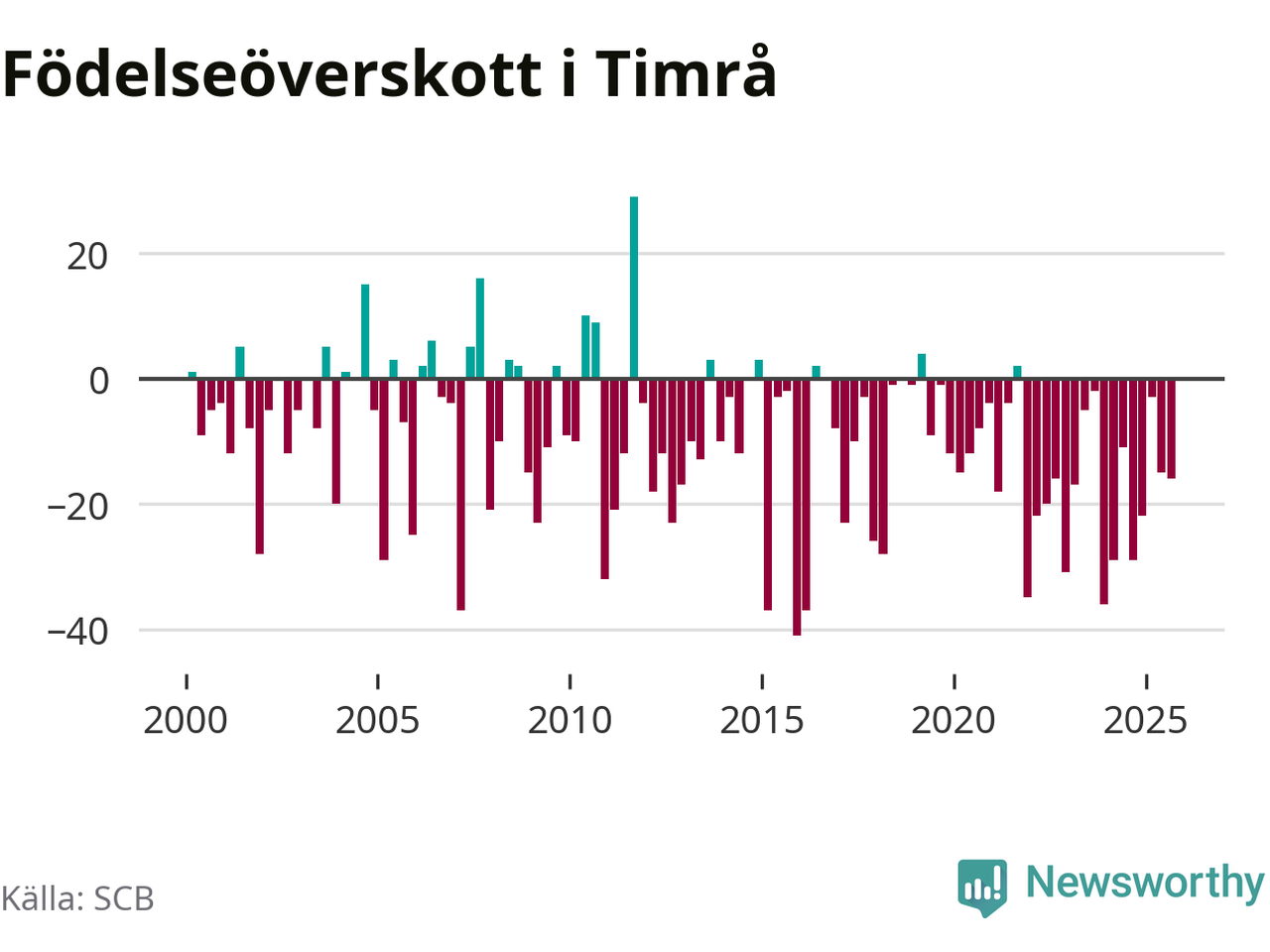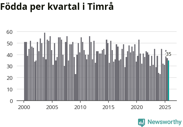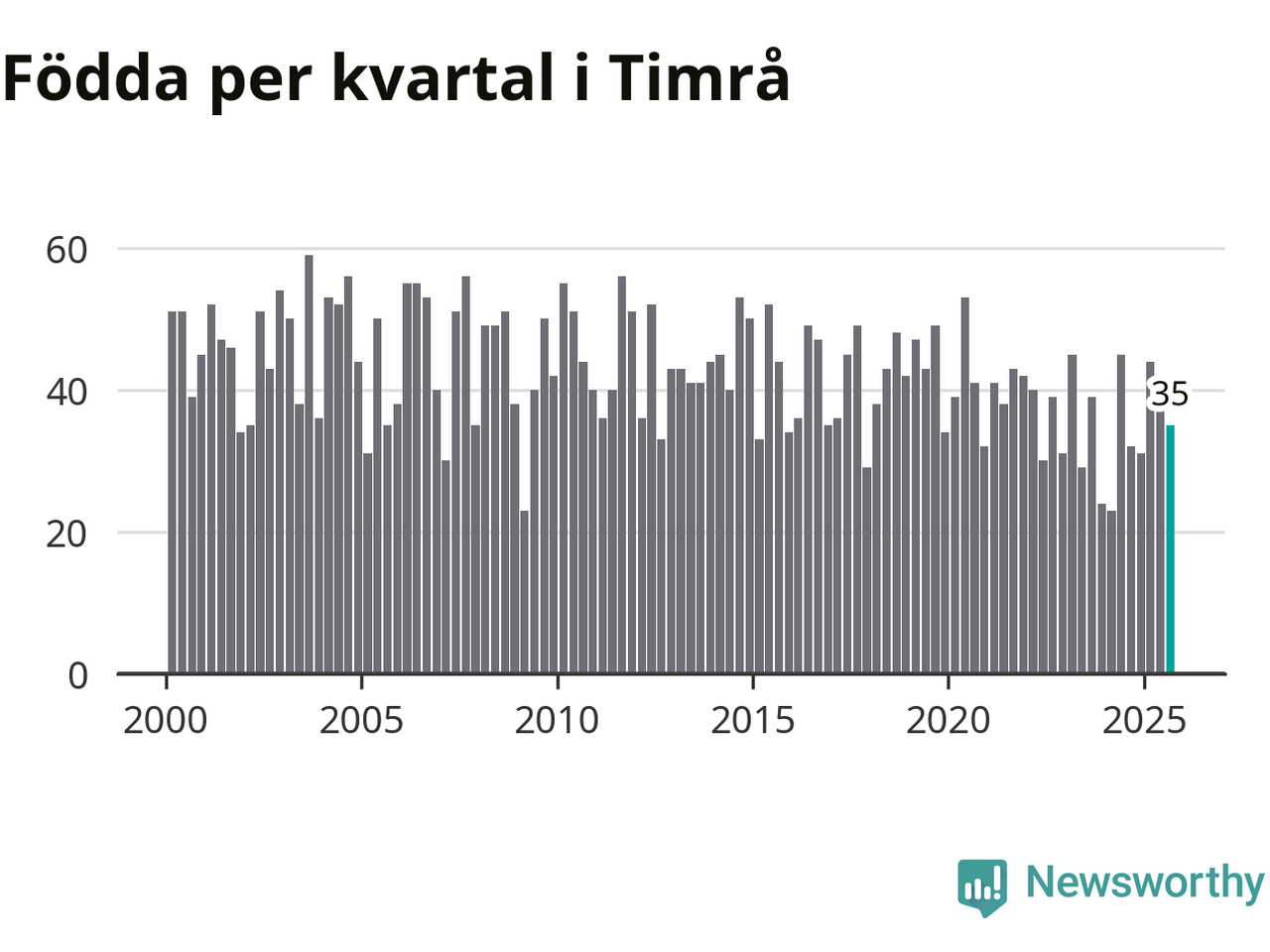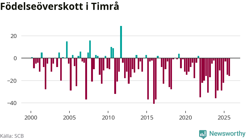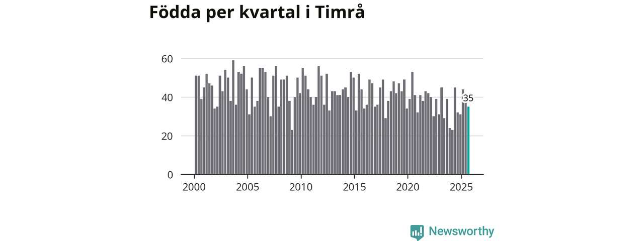 Enligt SCB:s siffror föddes 35 barn i Timrå under det senaste kvartalet. Samtidigt avled 51 personer. Timrå hade alltså ett negativt födelsenetto, vilket kommunen historiskt sett nästan alltid har haft.
