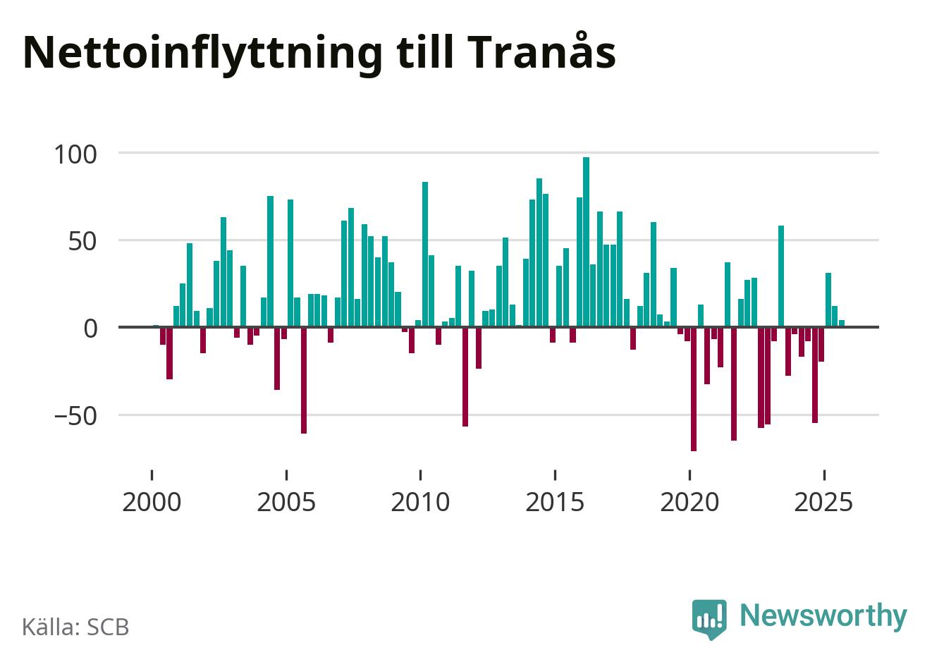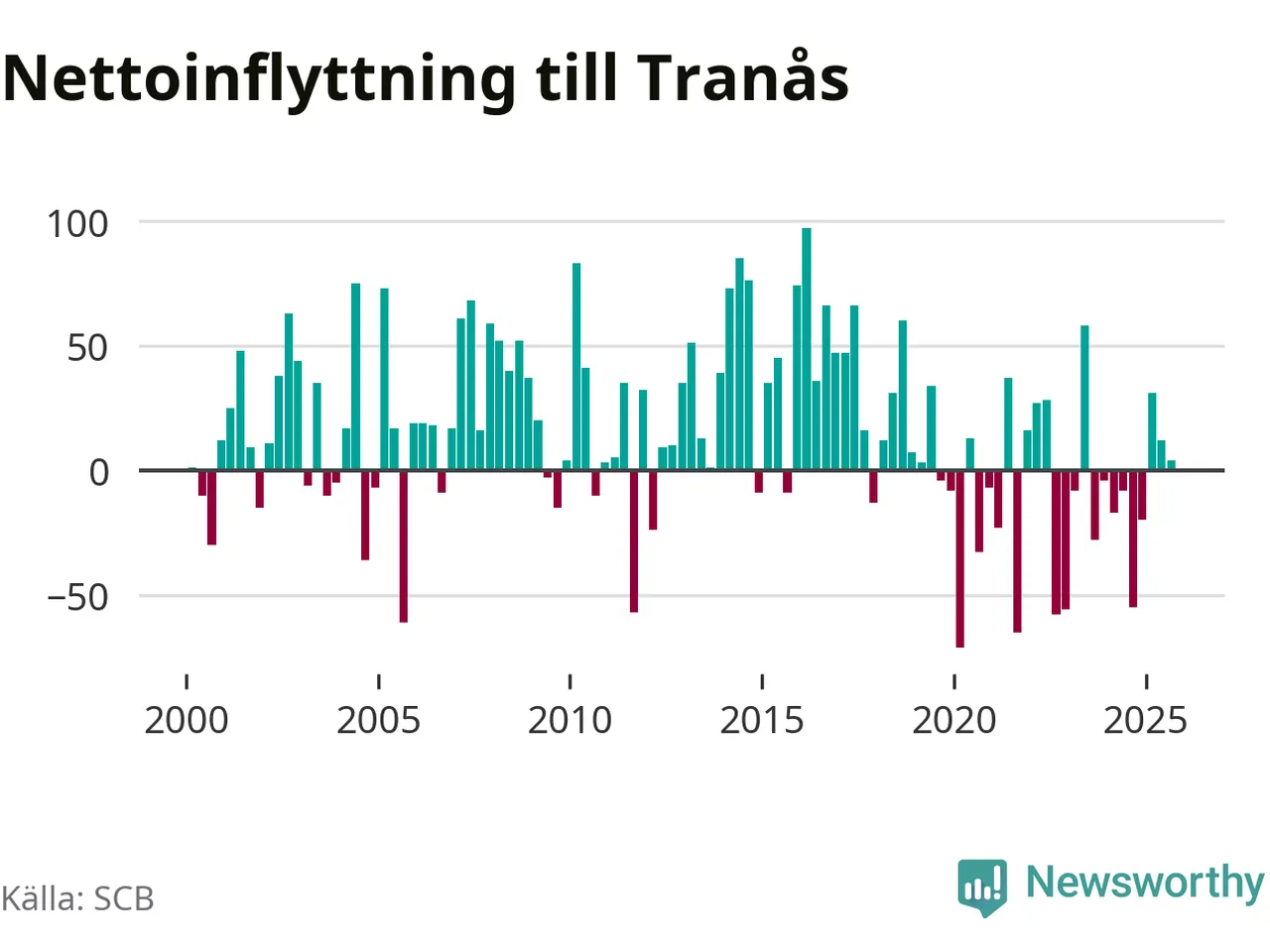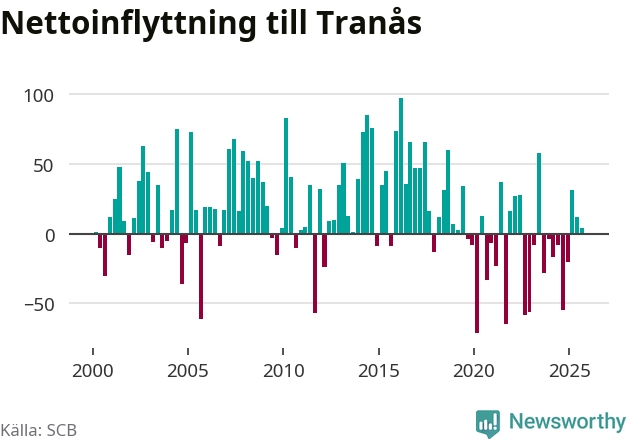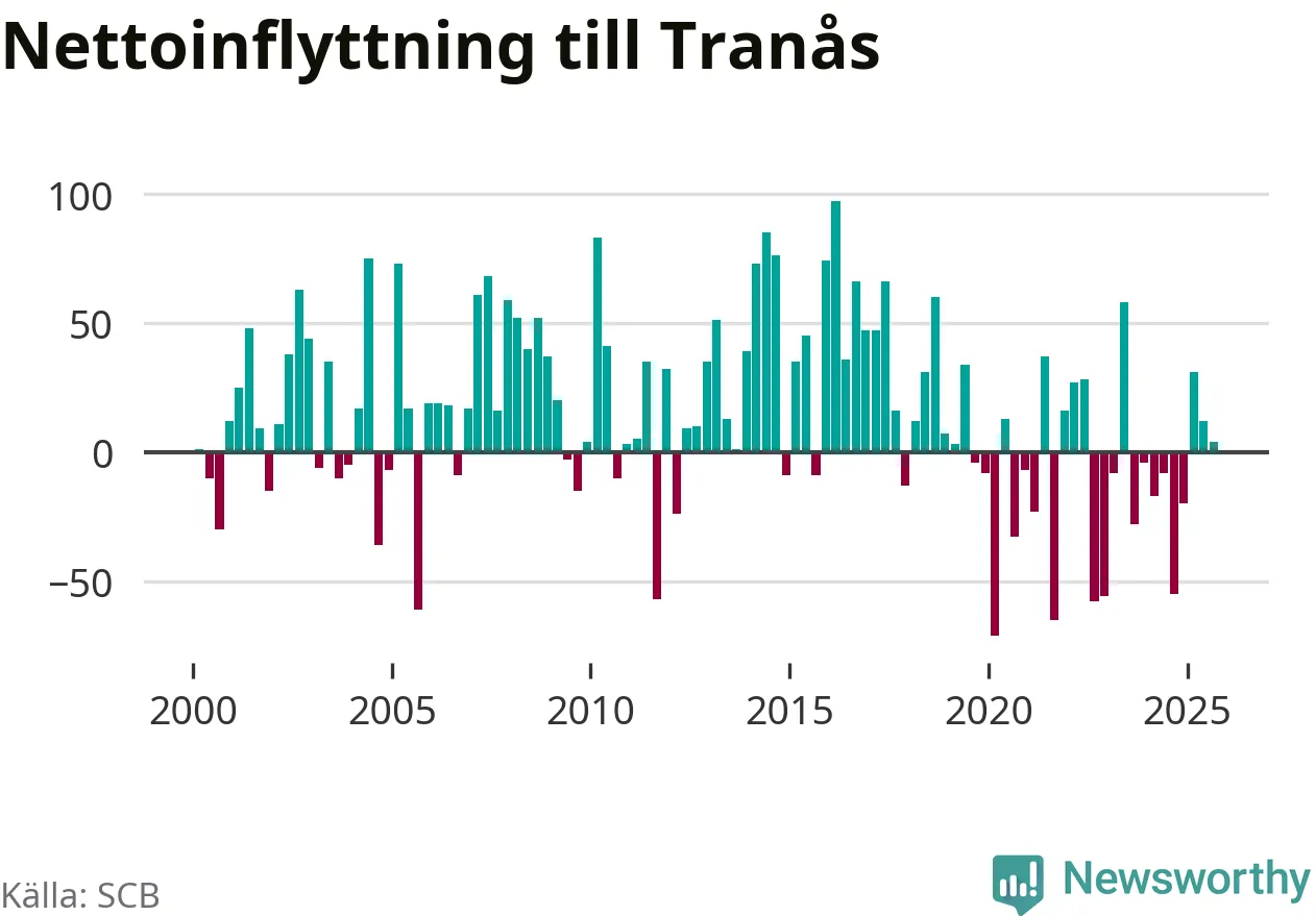 Under tredje kvartalet 2025 flyttade 272 personer till kommunen medan 268 personer flyttade därifrån. Skillnaden mellan antalet in- och utflyttade är så liten att den lika gärna kan bero på SCB:s slumpmässiga brus. Sedan seklets början har Tranås haft ungefär lika många kvartal med positivt flyttnetto som negativt.