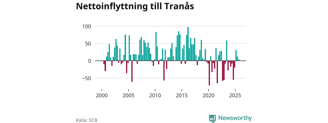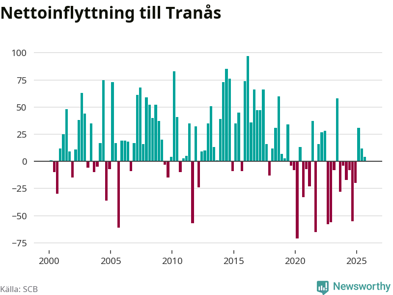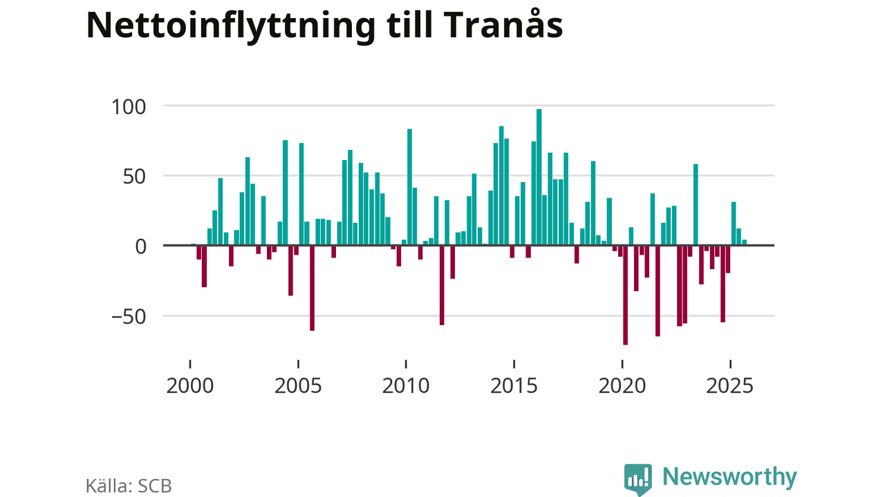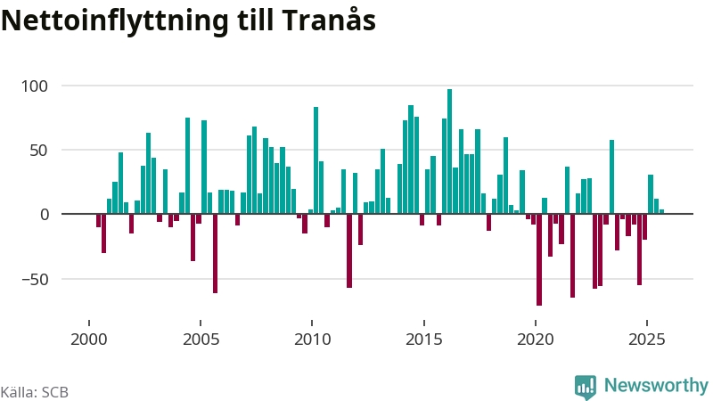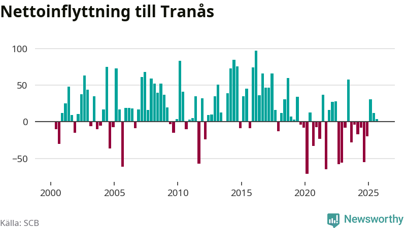 Under tredje kvartalet 2025 flyttade 272 personer till kommunen medan 268 personer flyttade därifrån. Skillnaden mellan antalet in- och utflyttade är så liten att den lika gärna kan bero på SCB:s slumpmässiga brus. Sedan seklets början har Tranås haft ungefär lika många kvartal med positivt flyttnetto som negativt.