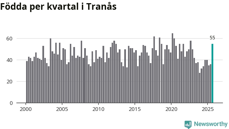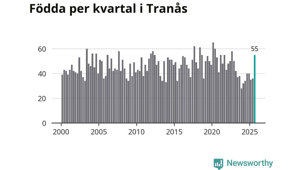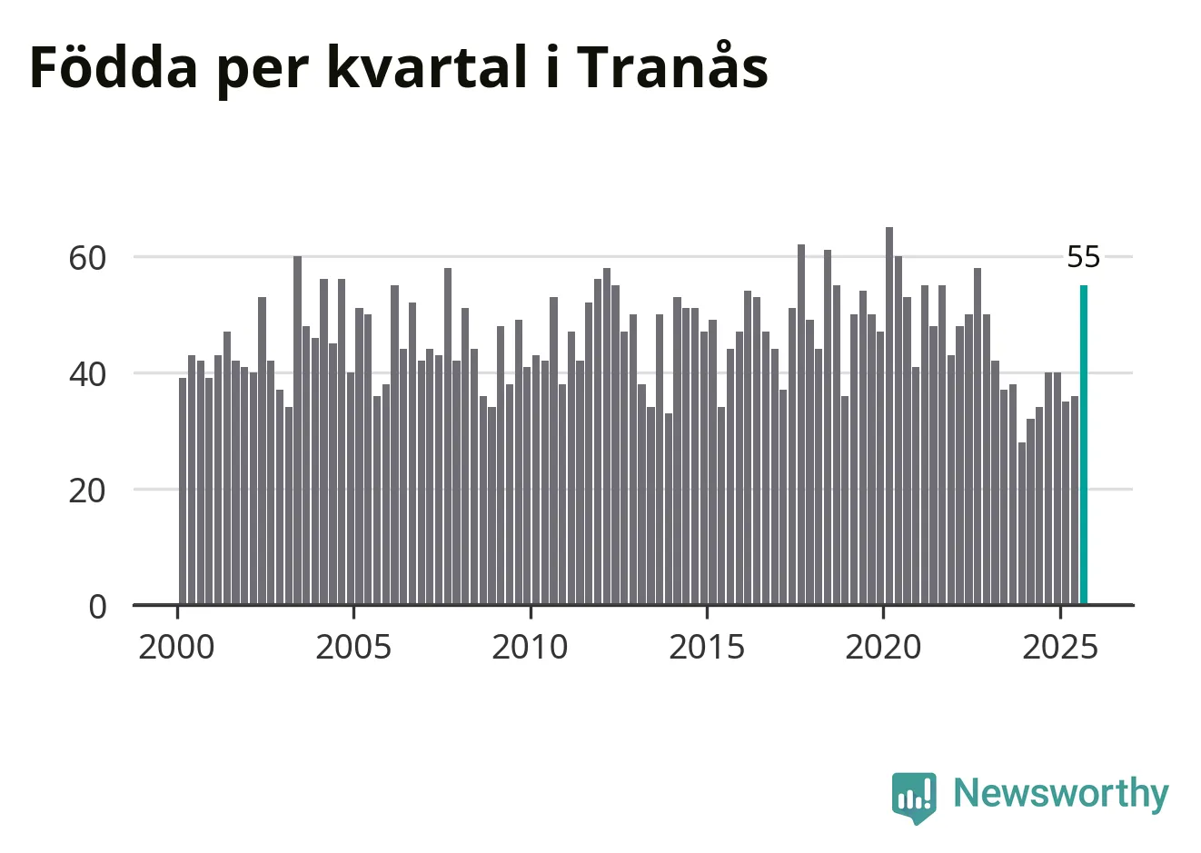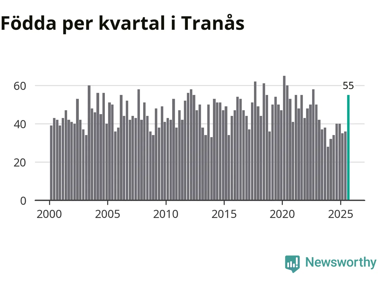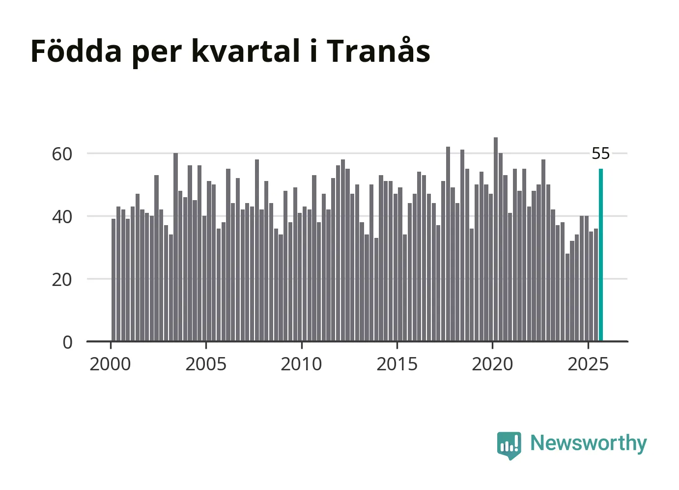 Under det tredje kvartalet 2025 föddes 55 barn i Tranås kommun. Samtidigt avled 36 personer. Det är första gången sedan första kvartalet 2023 som kommunen har ett positivt födelsenetto.
