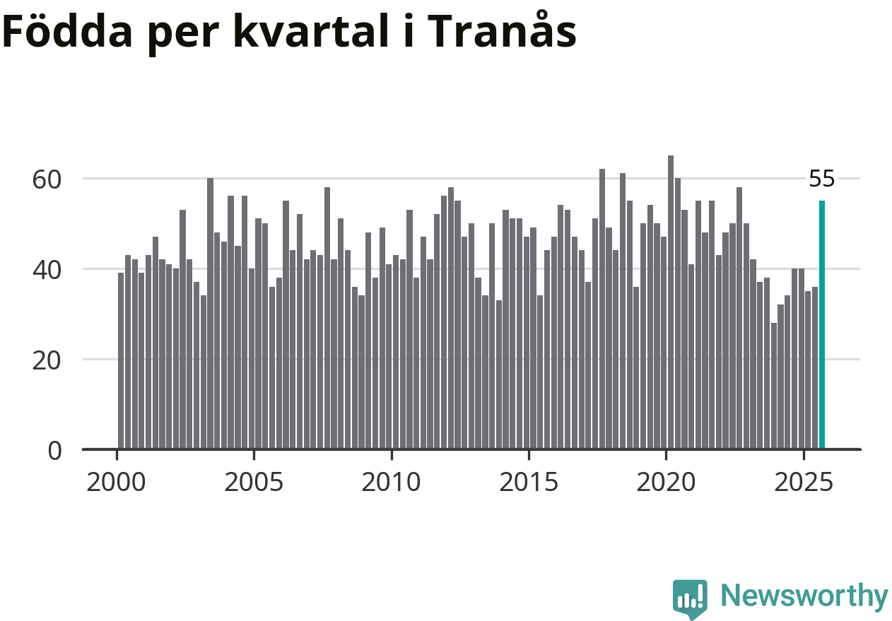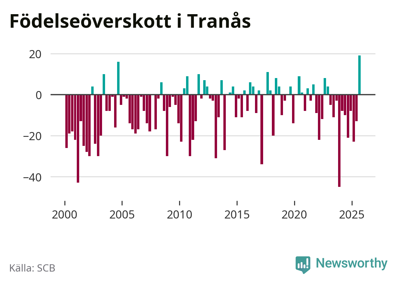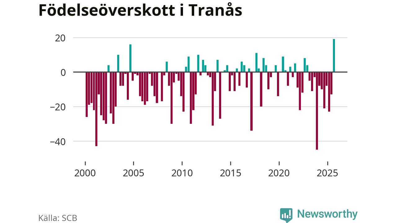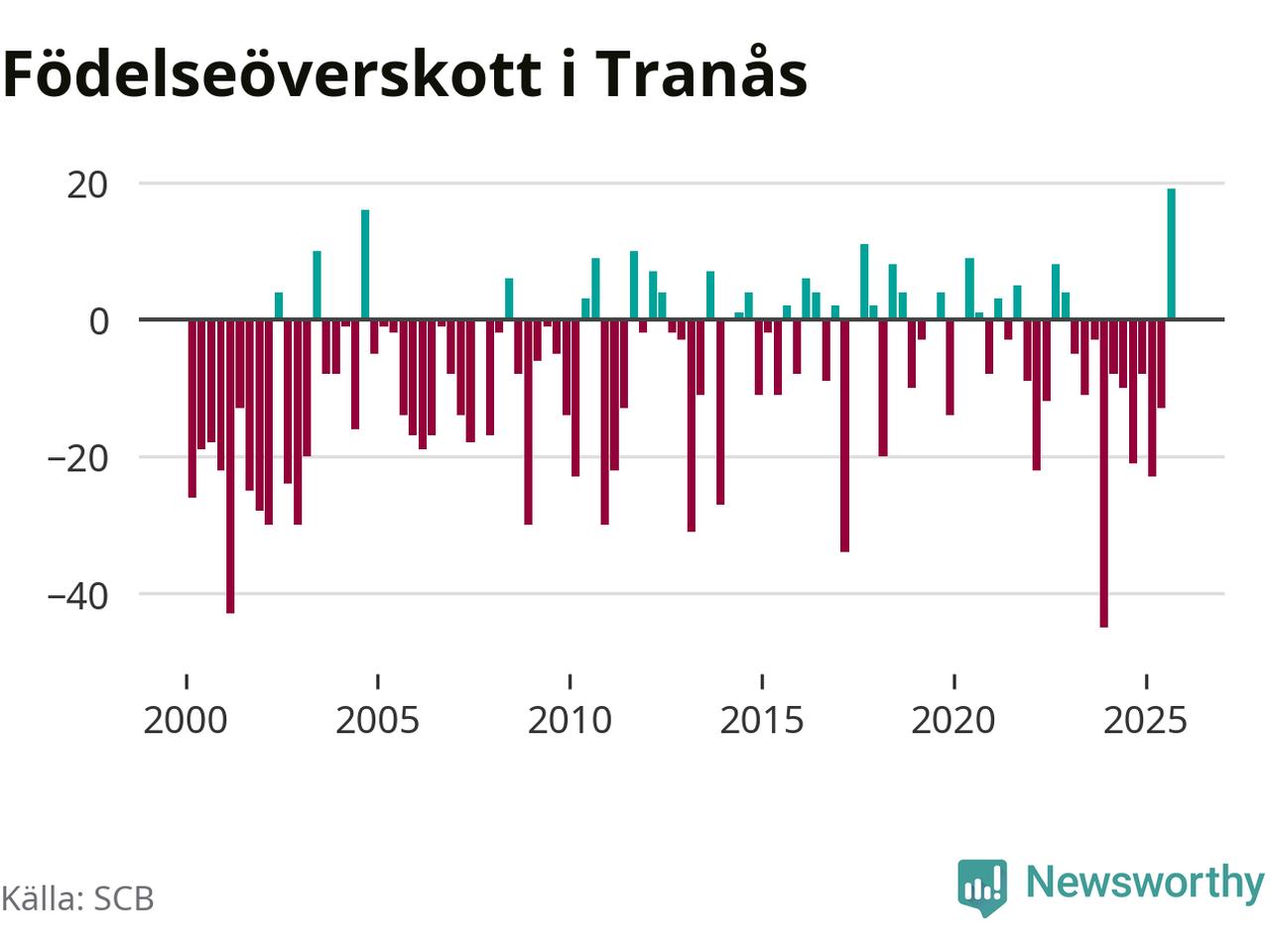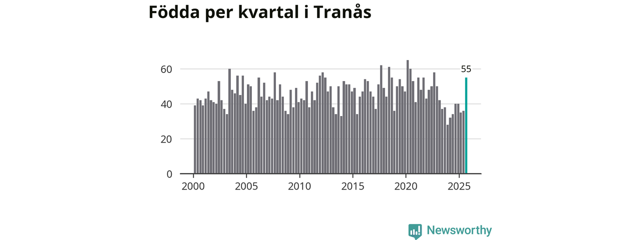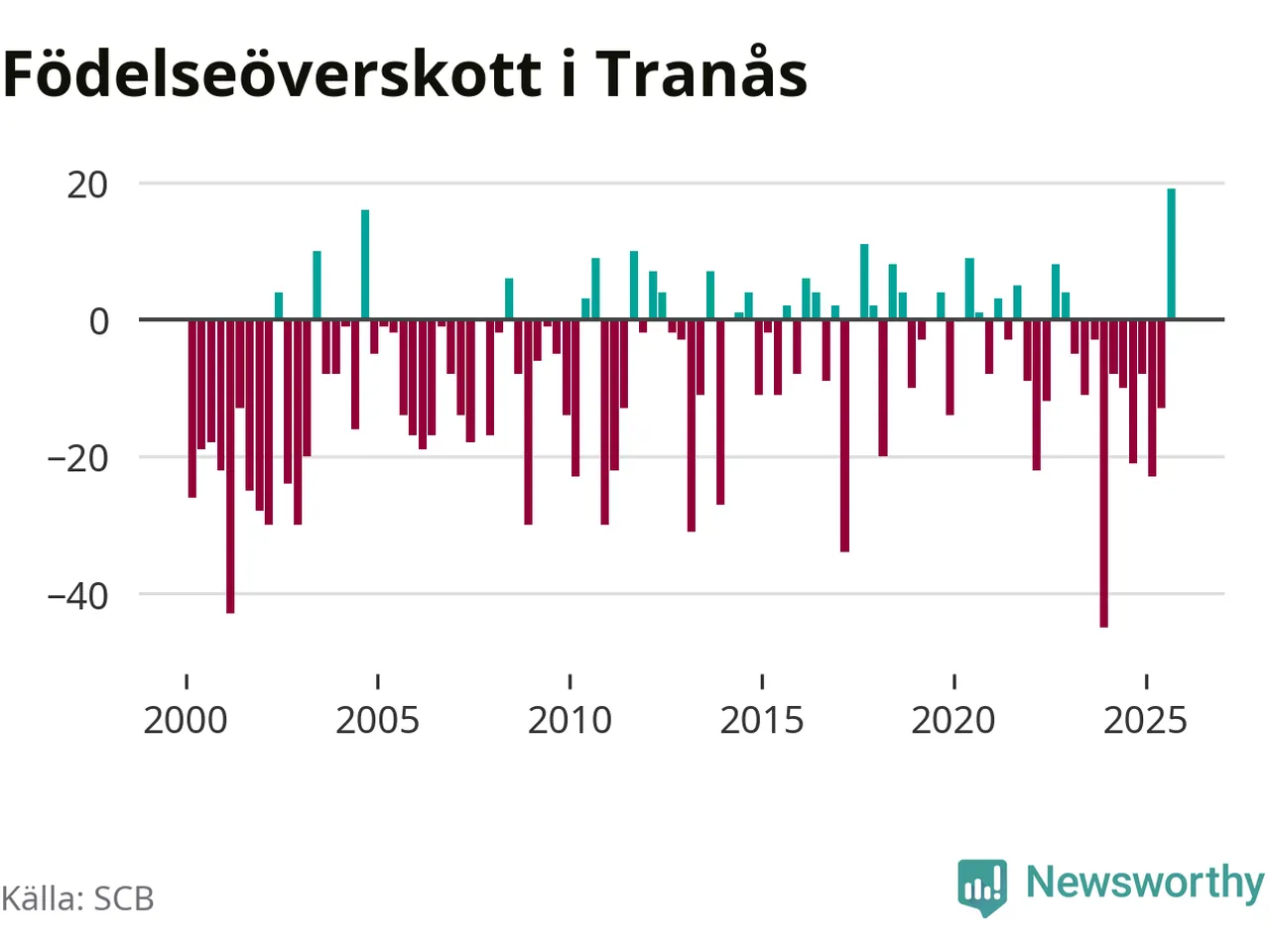 Under det tredje kvartalet 2025 föddes 55 barn i Tranås kommun. Samtidigt avled 36 personer. Det är första gången sedan första kvartalet 2023 som kommunen har ett positivt födelsenetto.