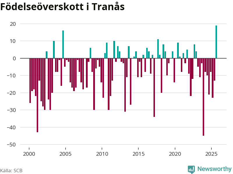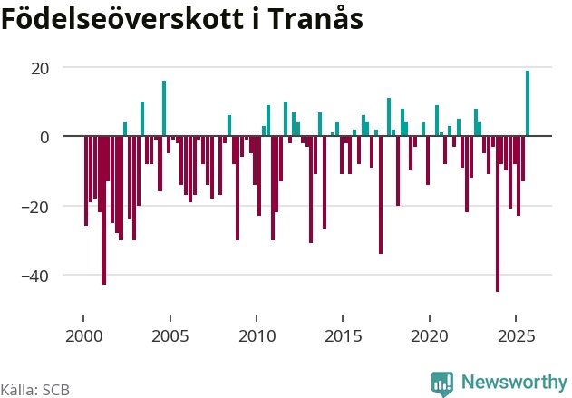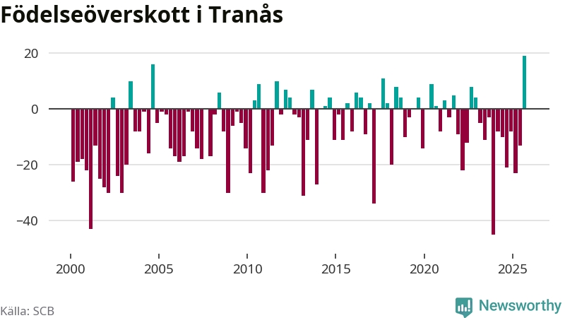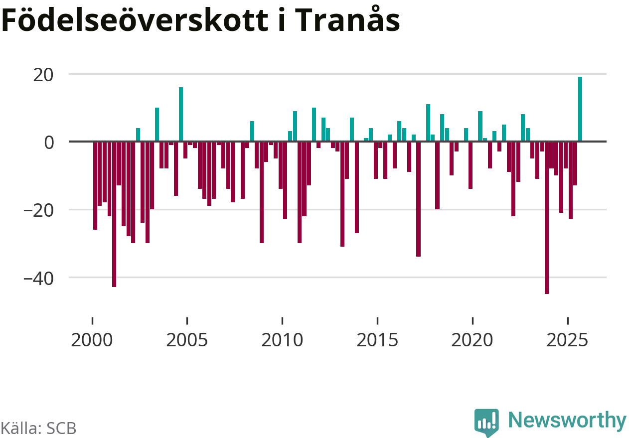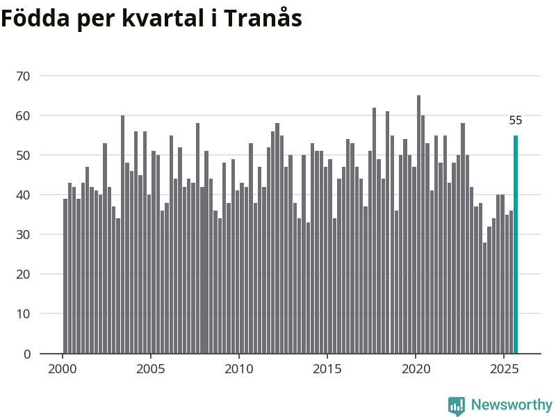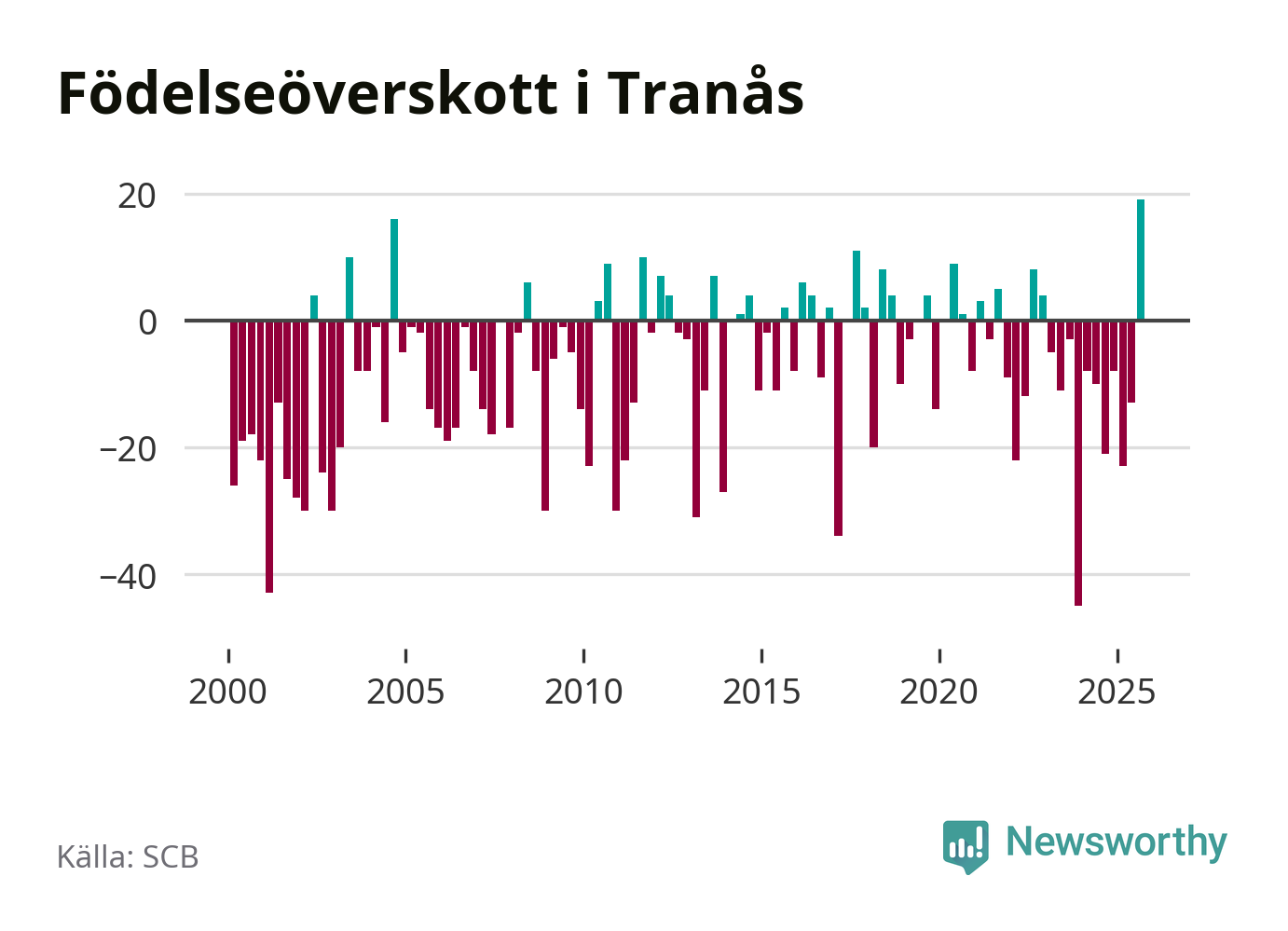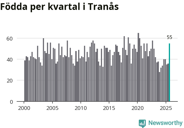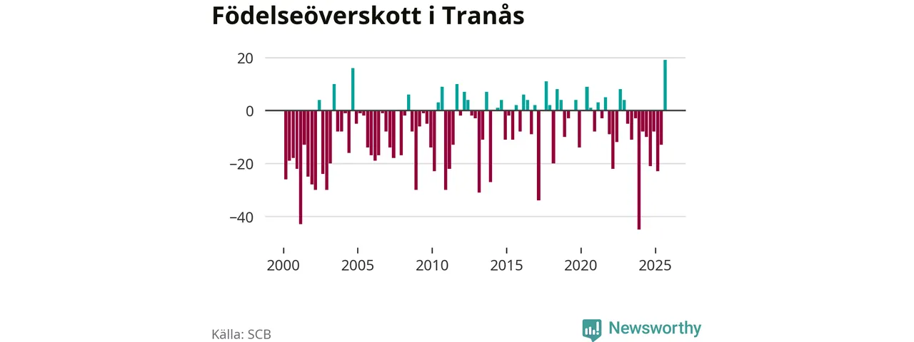 Under det tredje kvartalet 2025 föddes 55 barn i Tranås kommun. Samtidigt avled 36 personer. Det är första gången sedan första kvartalet 2023 som kommunen har ett positivt födelsenetto.
