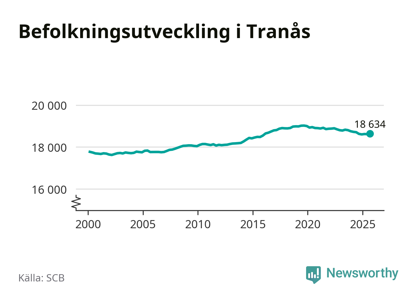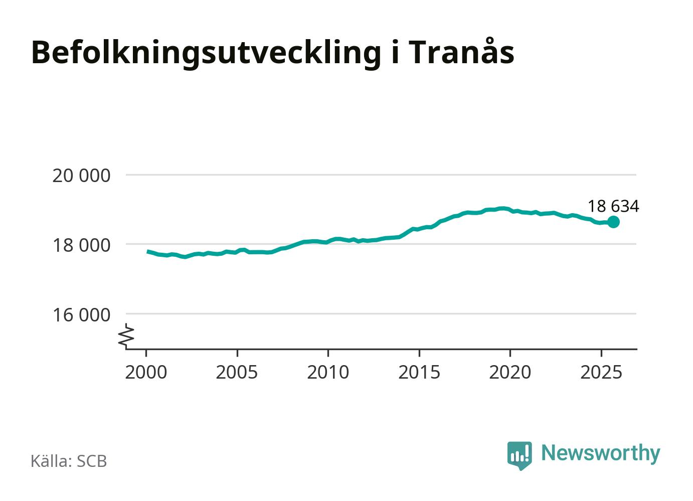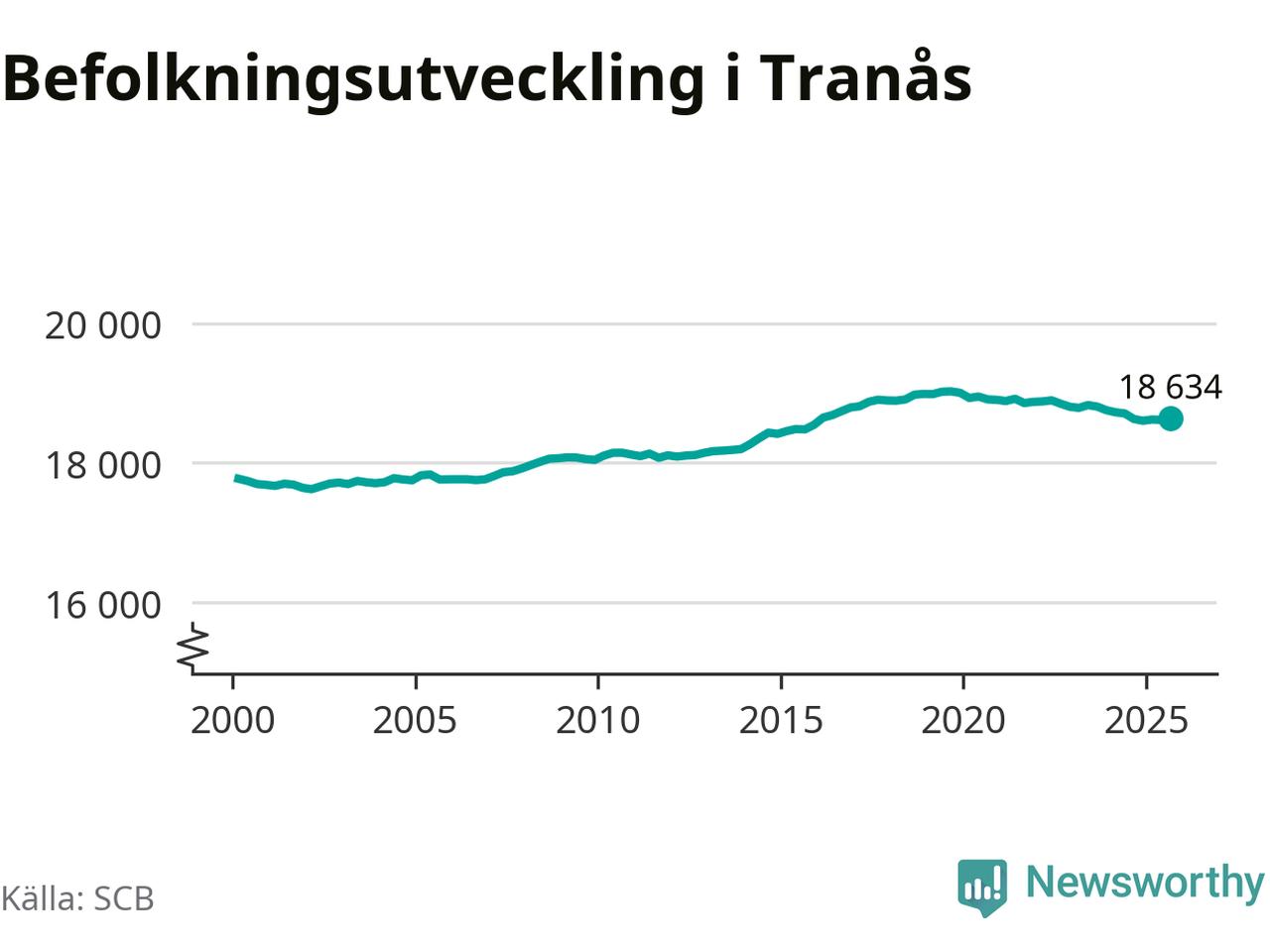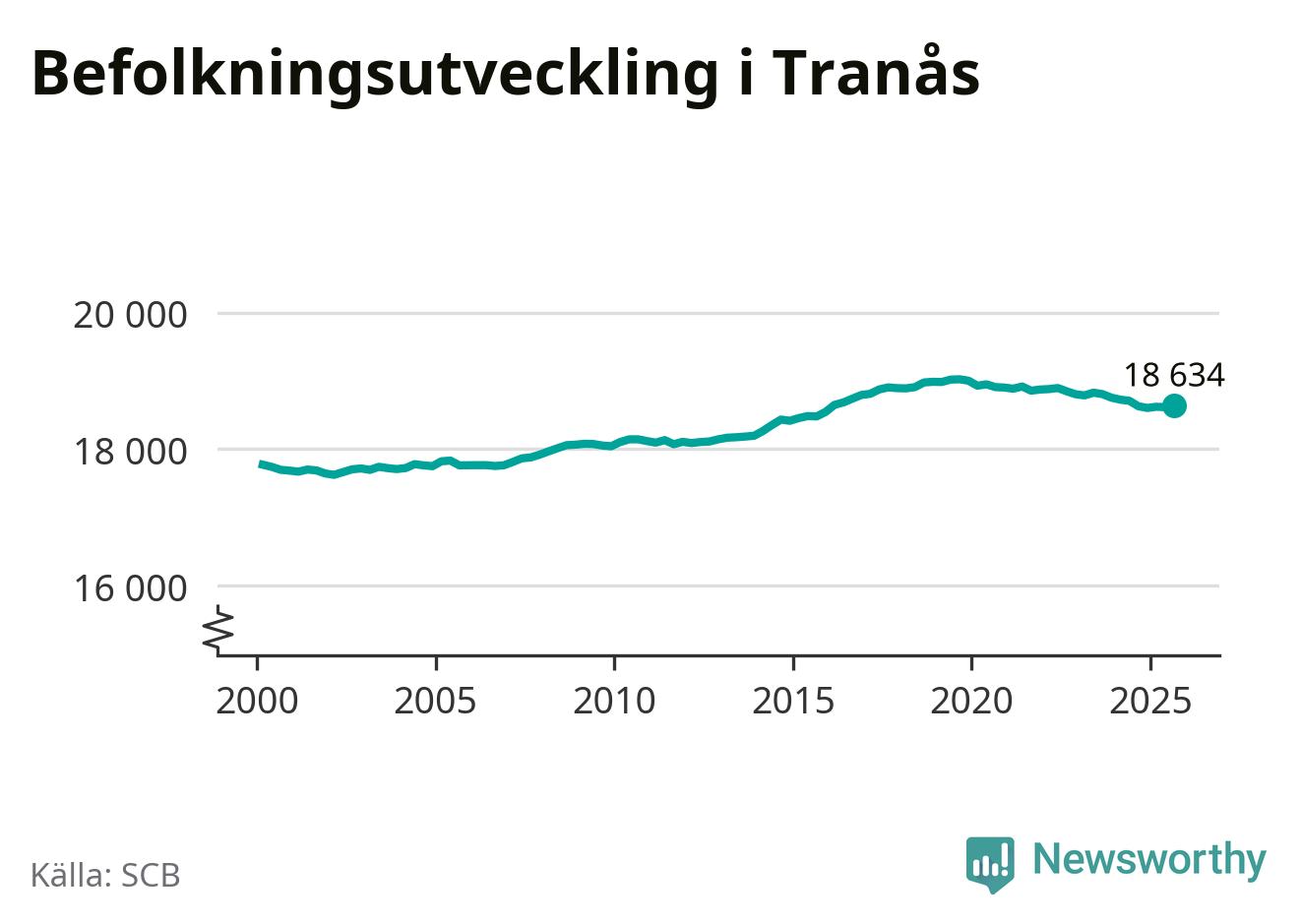 Jämfört med ett år sedan är befolkningen i princip lika stor i Tranås. Sedan millennieskiftet har folkmängden ökat med runt 860 personer, eller 5 procent.