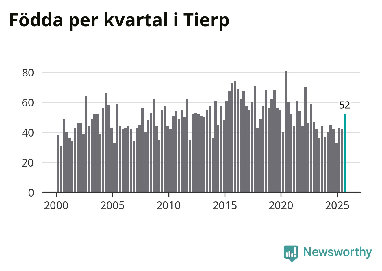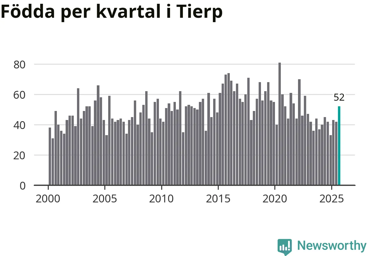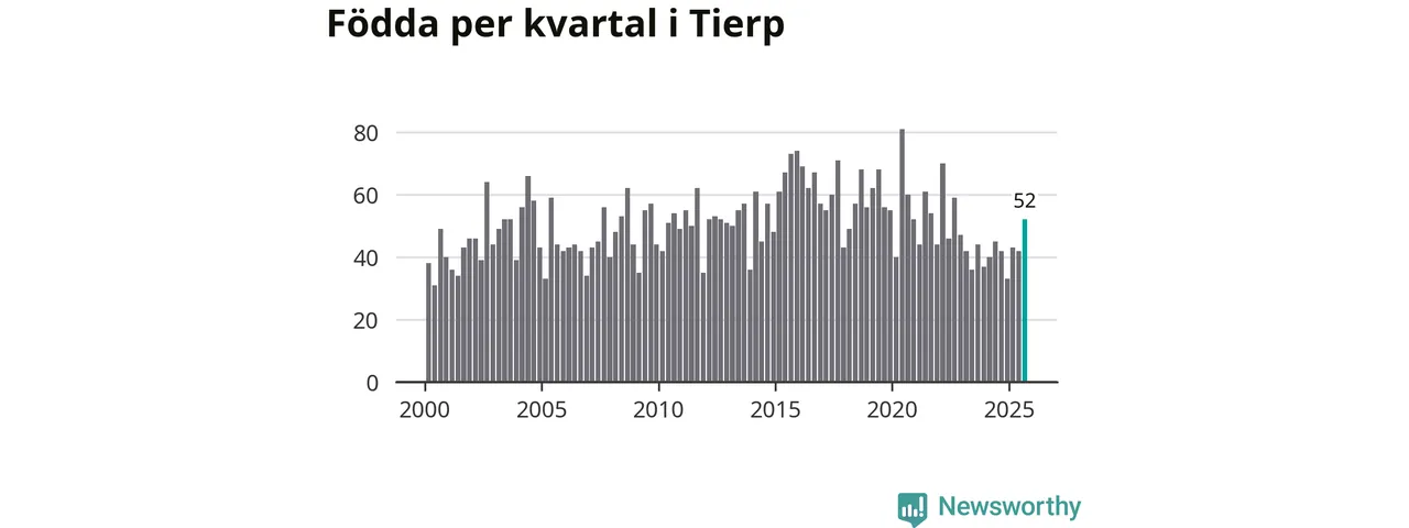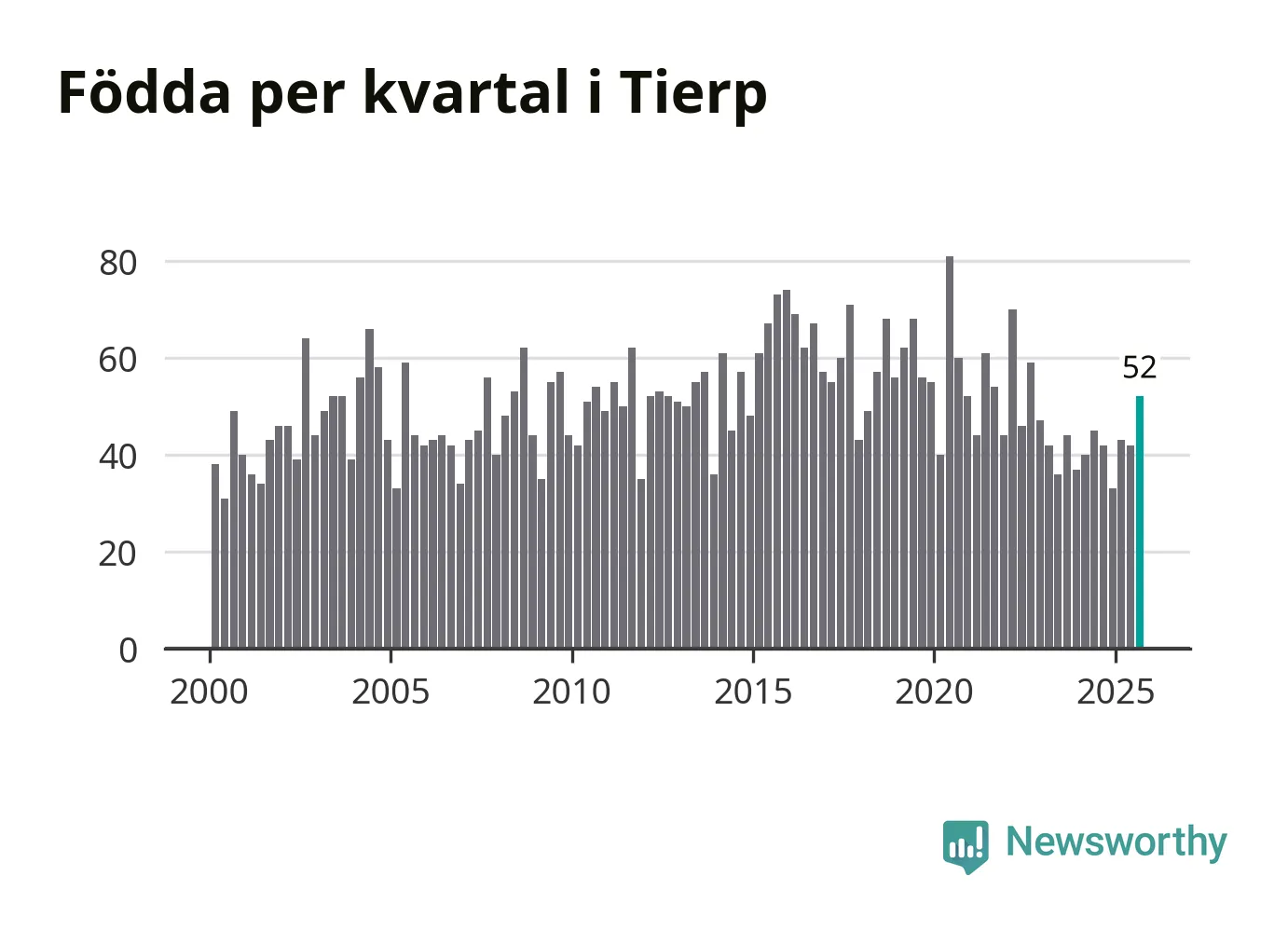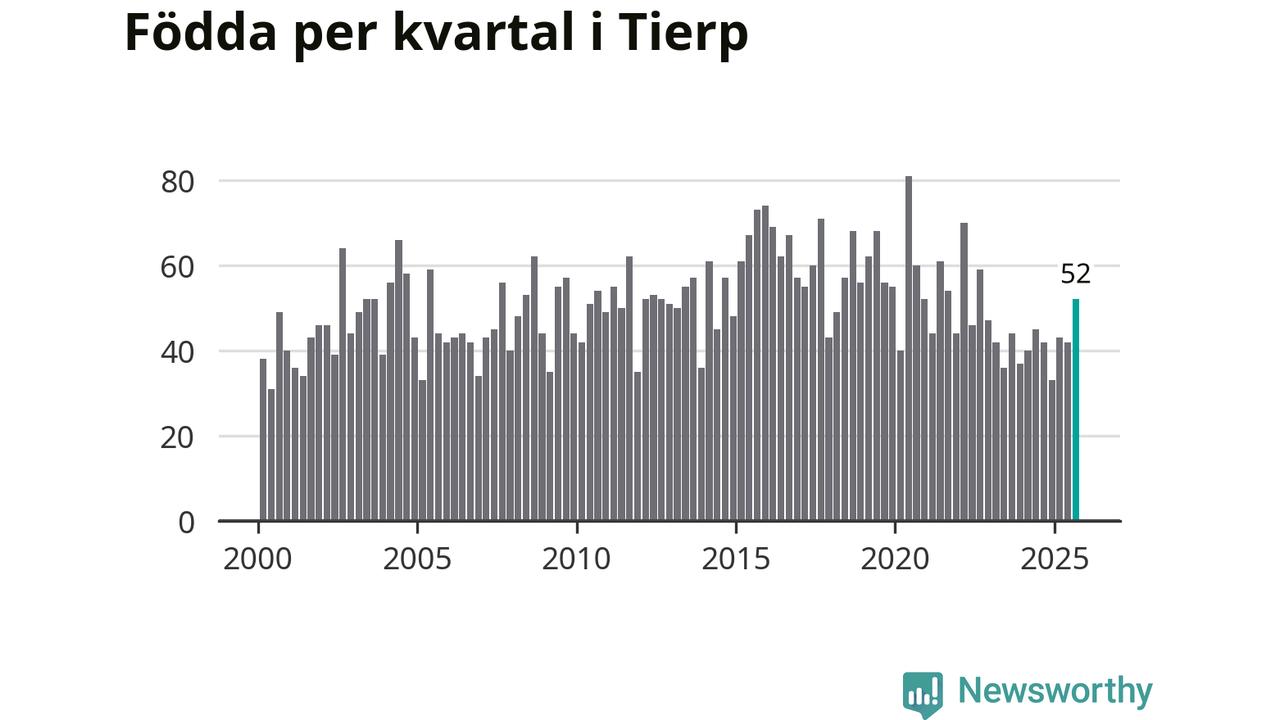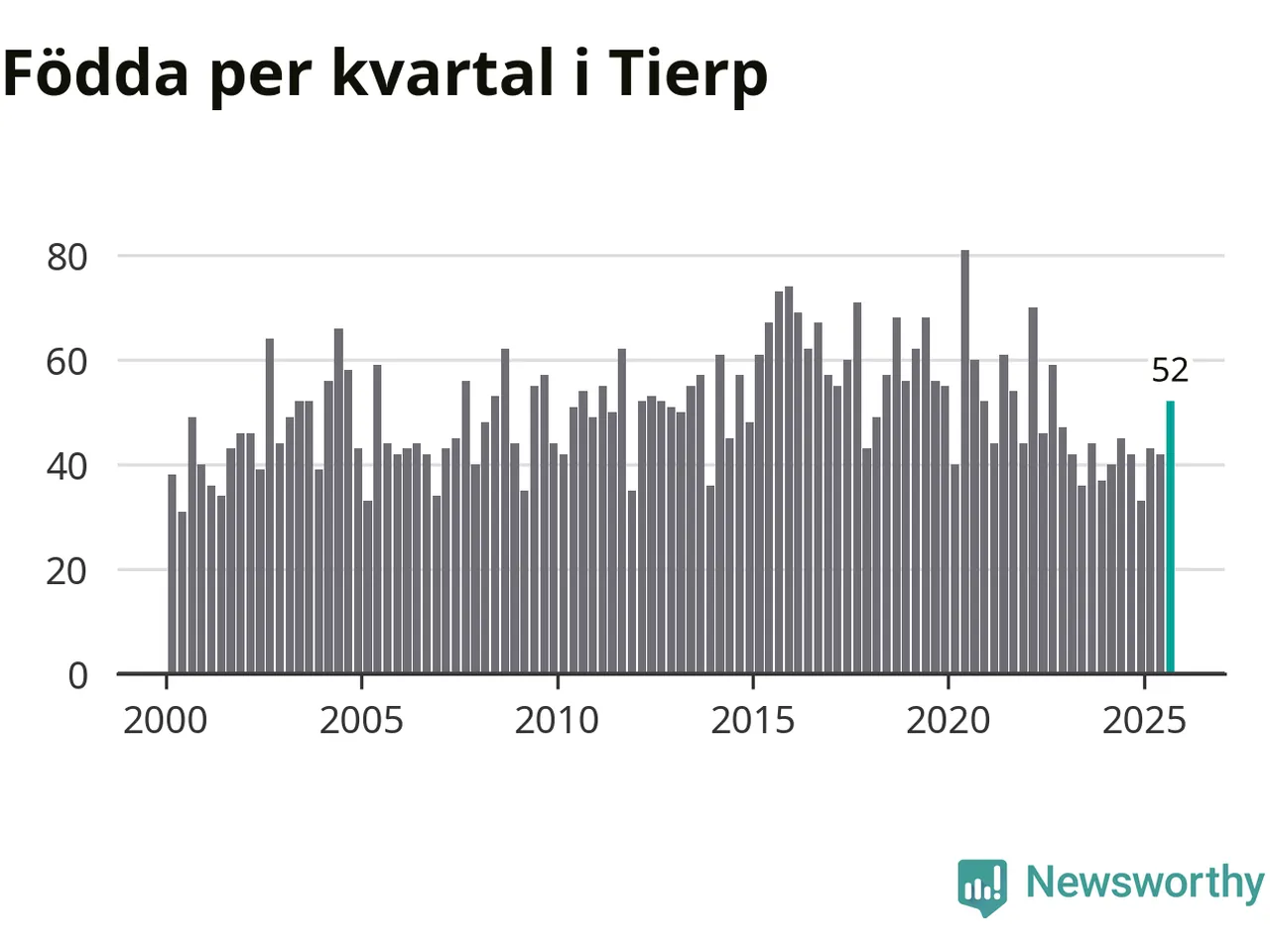 Enligt SCB:s siffror föddes 52 barn i Tierp under det senaste kvartalet. Samtidigt avled 68 personer. Tierp hade alltså ett negativt födelsenetto, vilket kommunen historiskt sett oftast har haft.