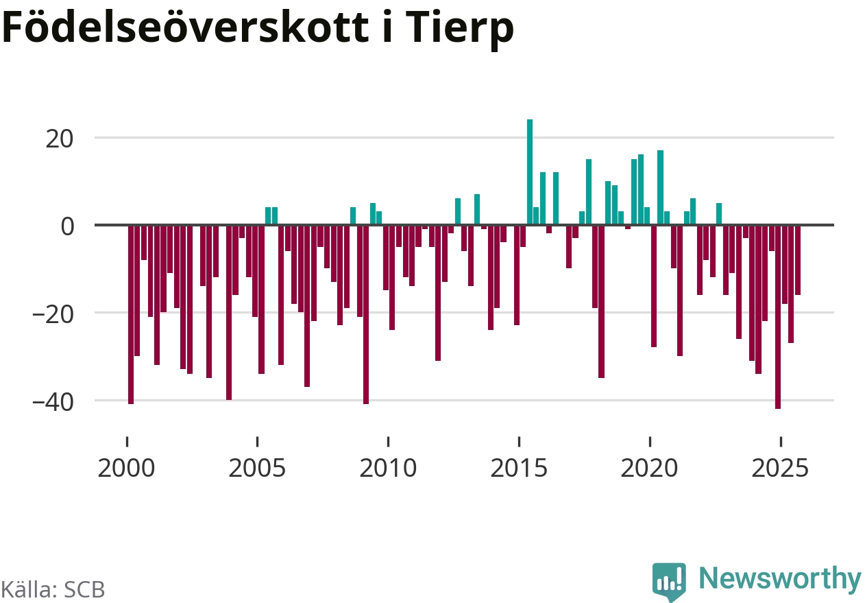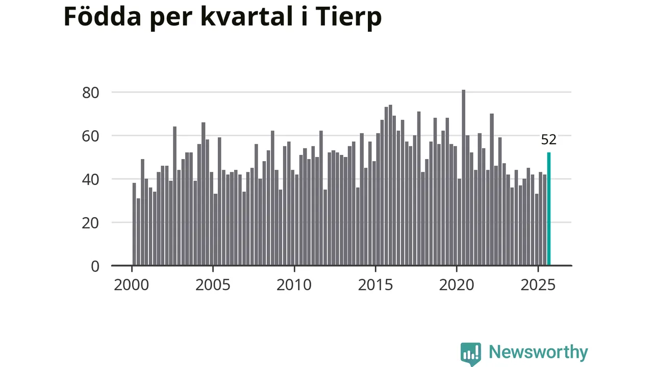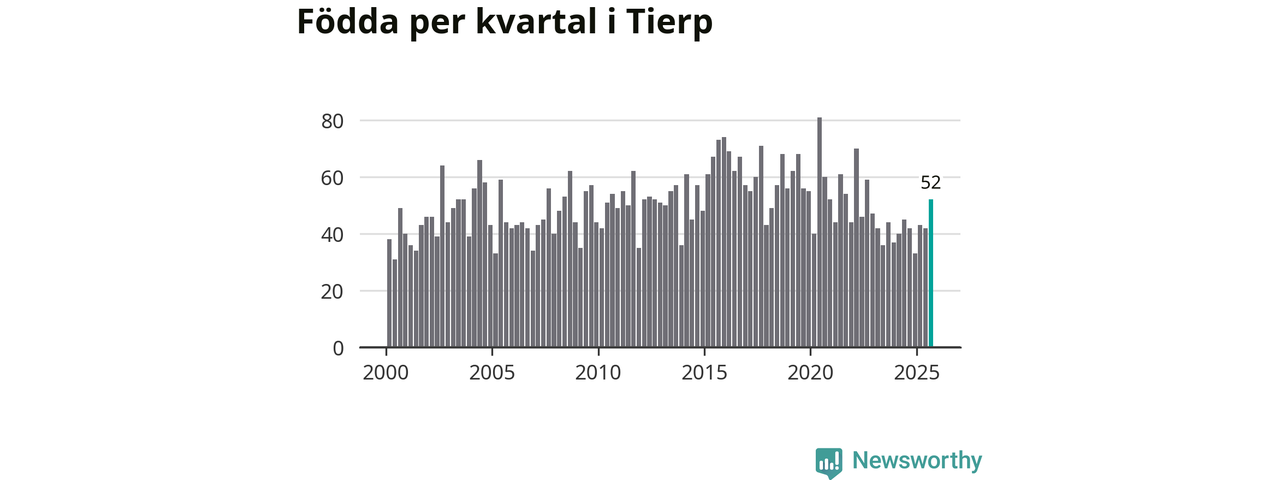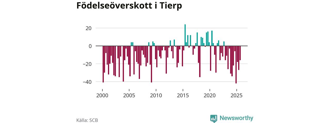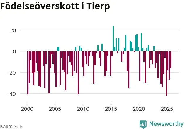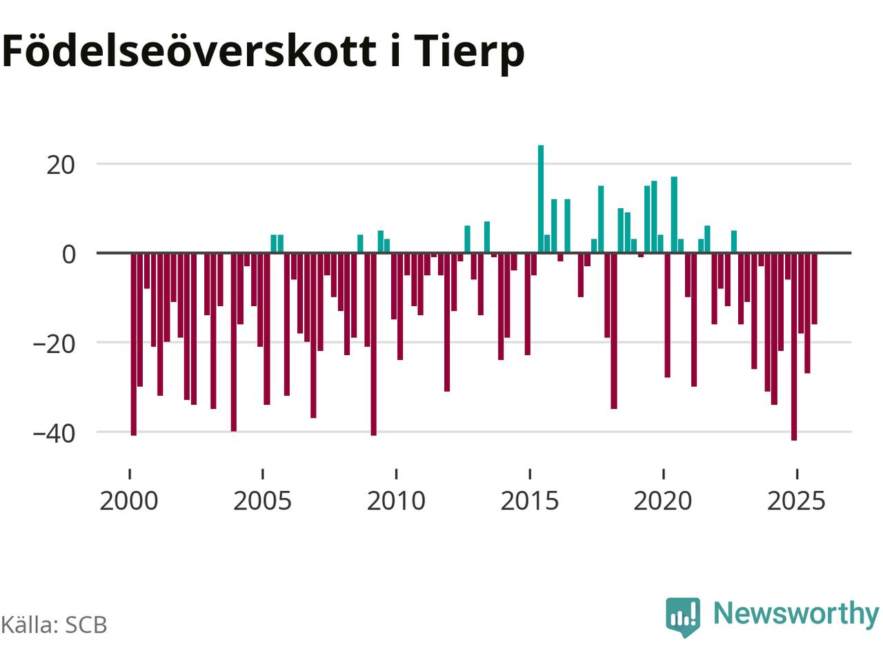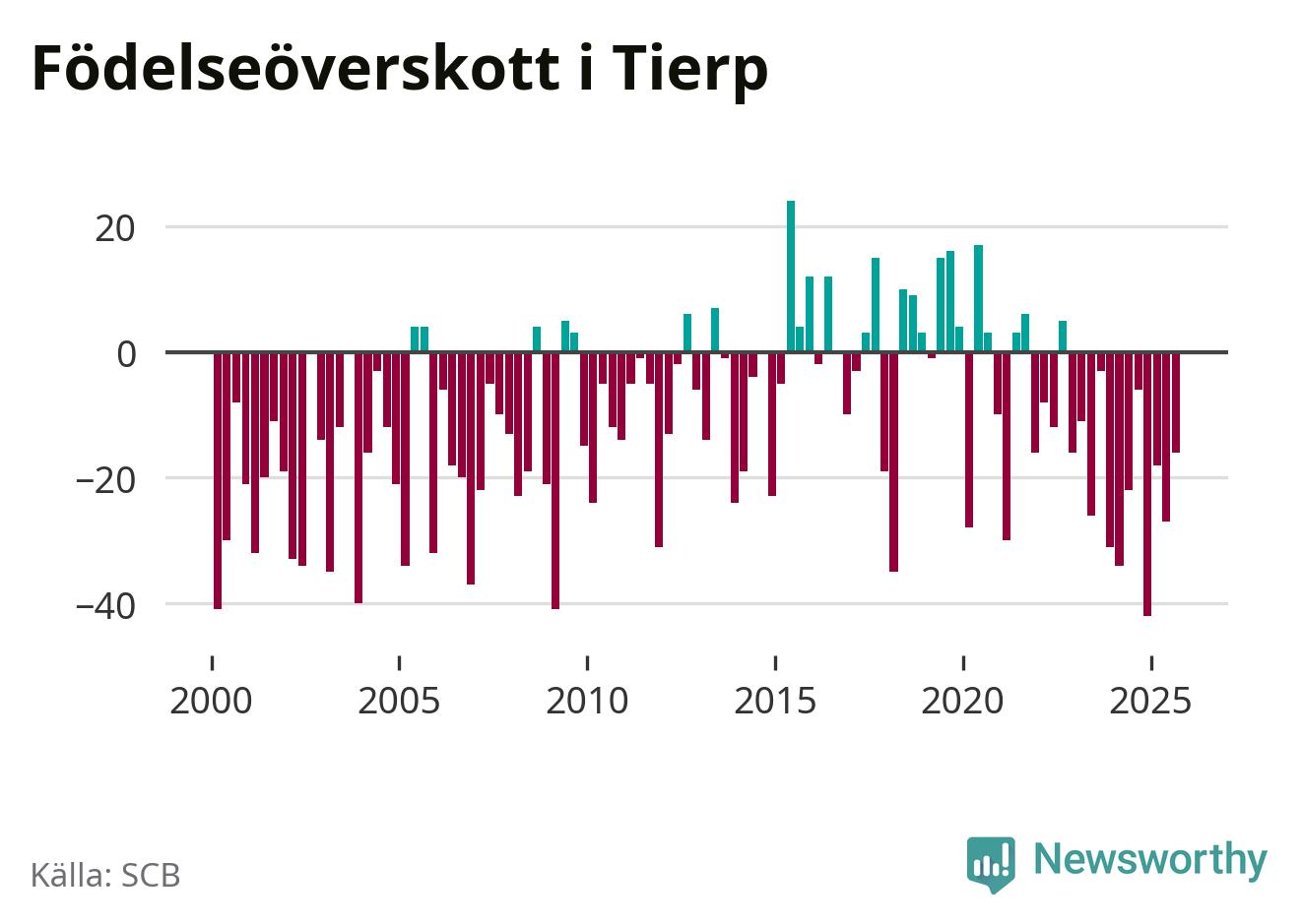 Enligt SCB:s siffror föddes 52 barn i Tierp under det senaste kvartalet. Samtidigt avled 68 personer. Tierp hade alltså ett negativt födelsenetto, vilket kommunen historiskt sett oftast har haft.