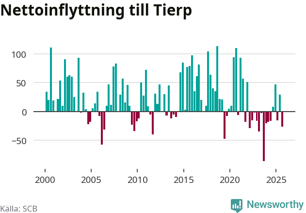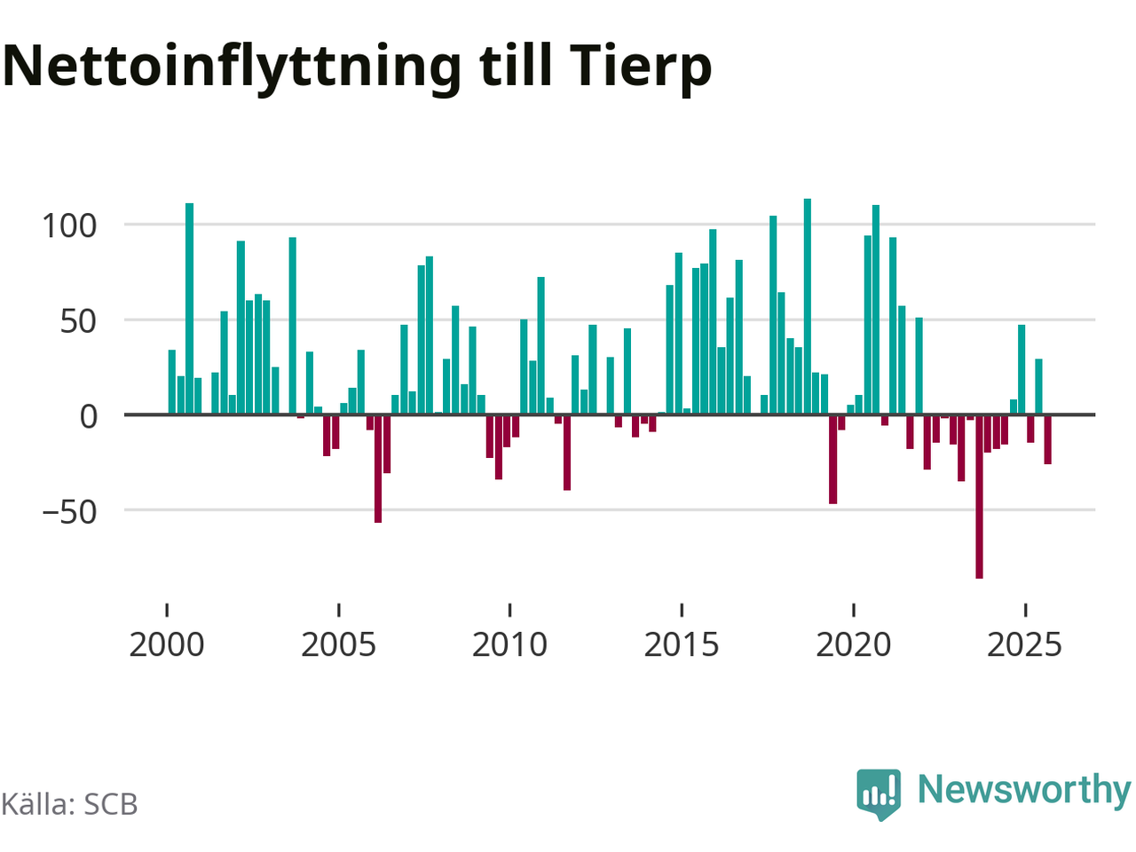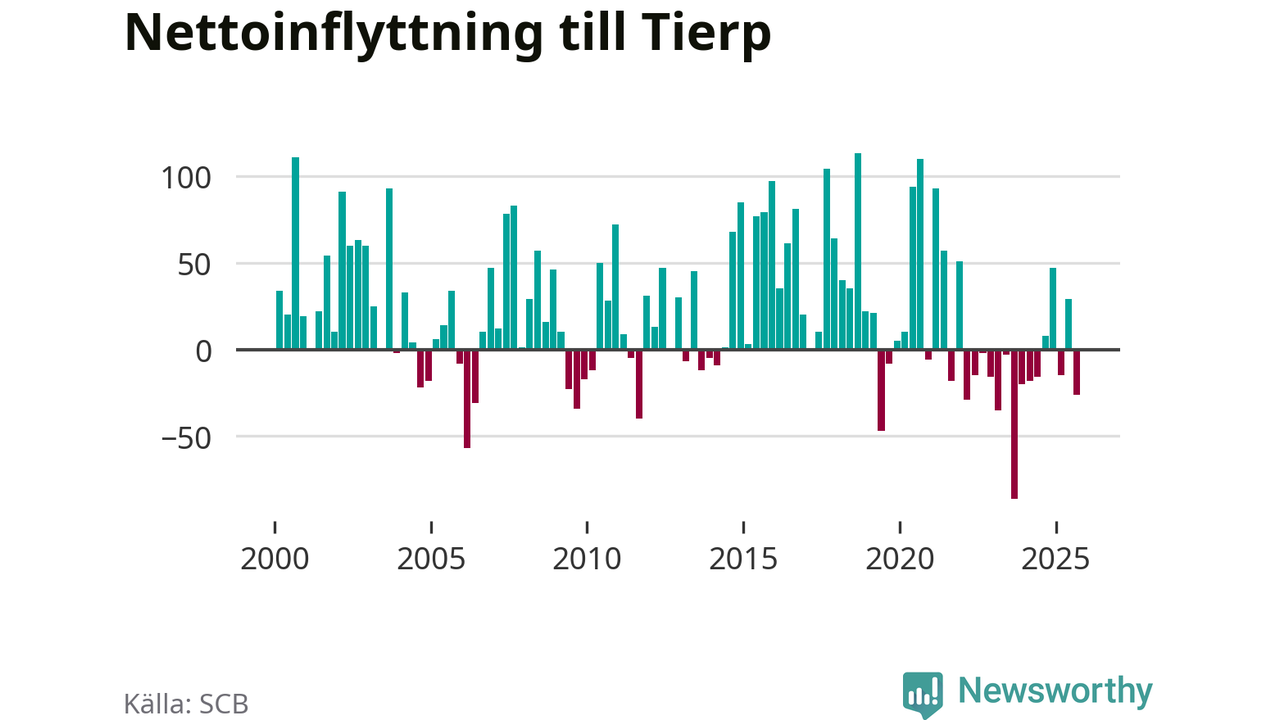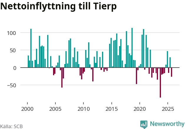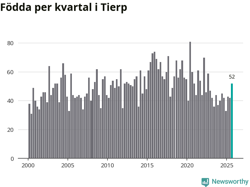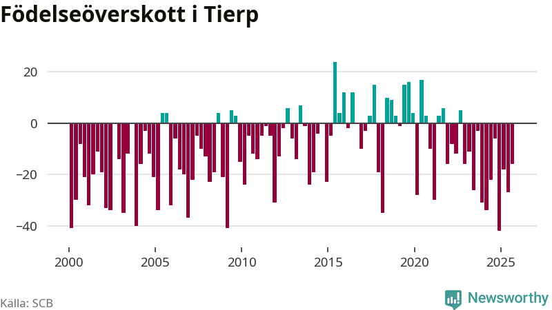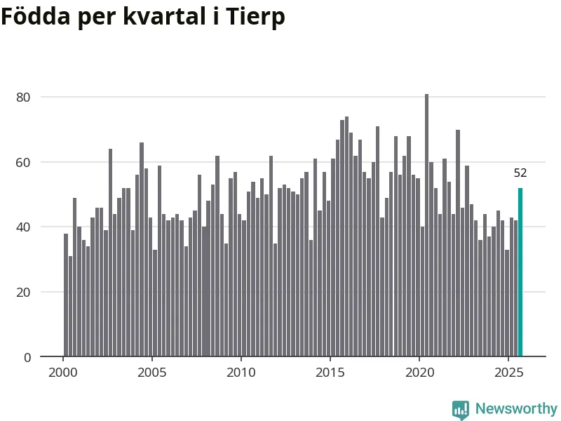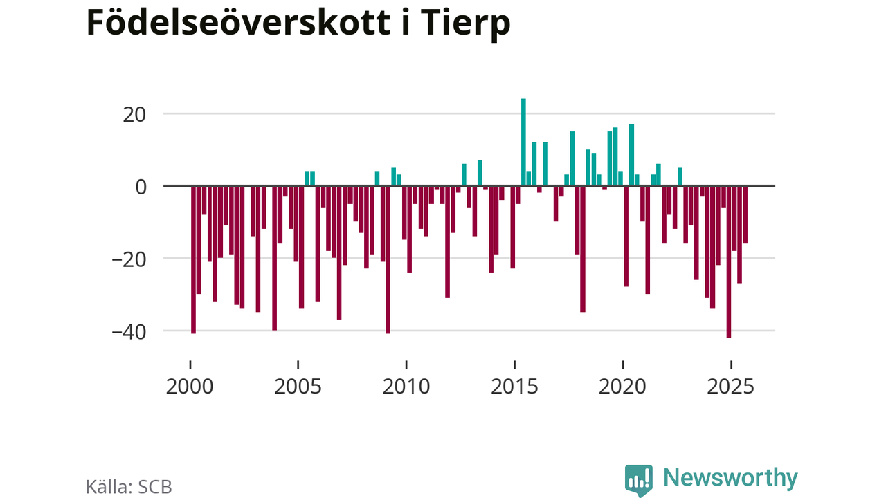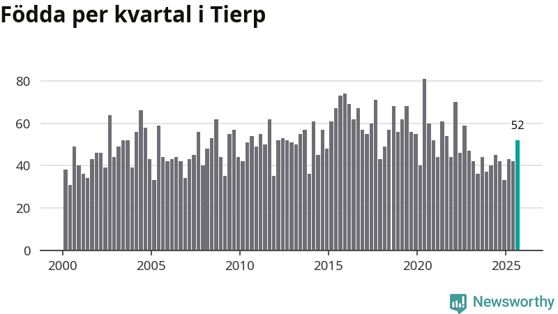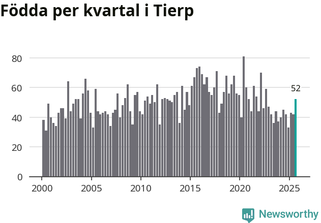 Enligt SCB:s siffror föddes 52 barn i Tierp under det senaste kvartalet. Samtidigt avled 68 personer. Tierp hade alltså ett negativt födelsenetto, vilket kommunen historiskt sett oftast har haft.