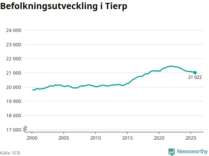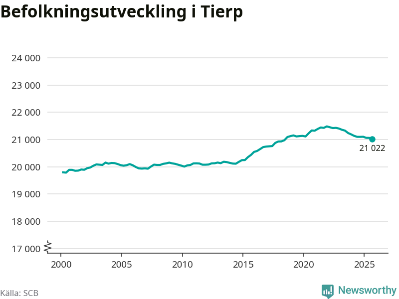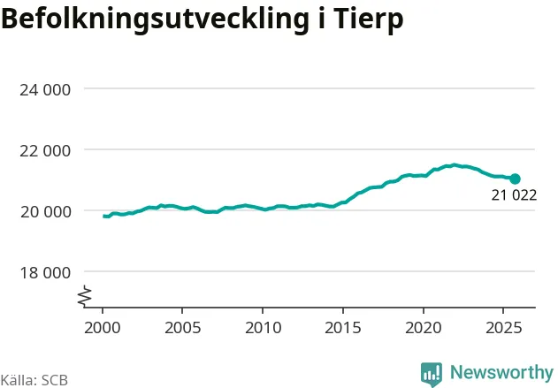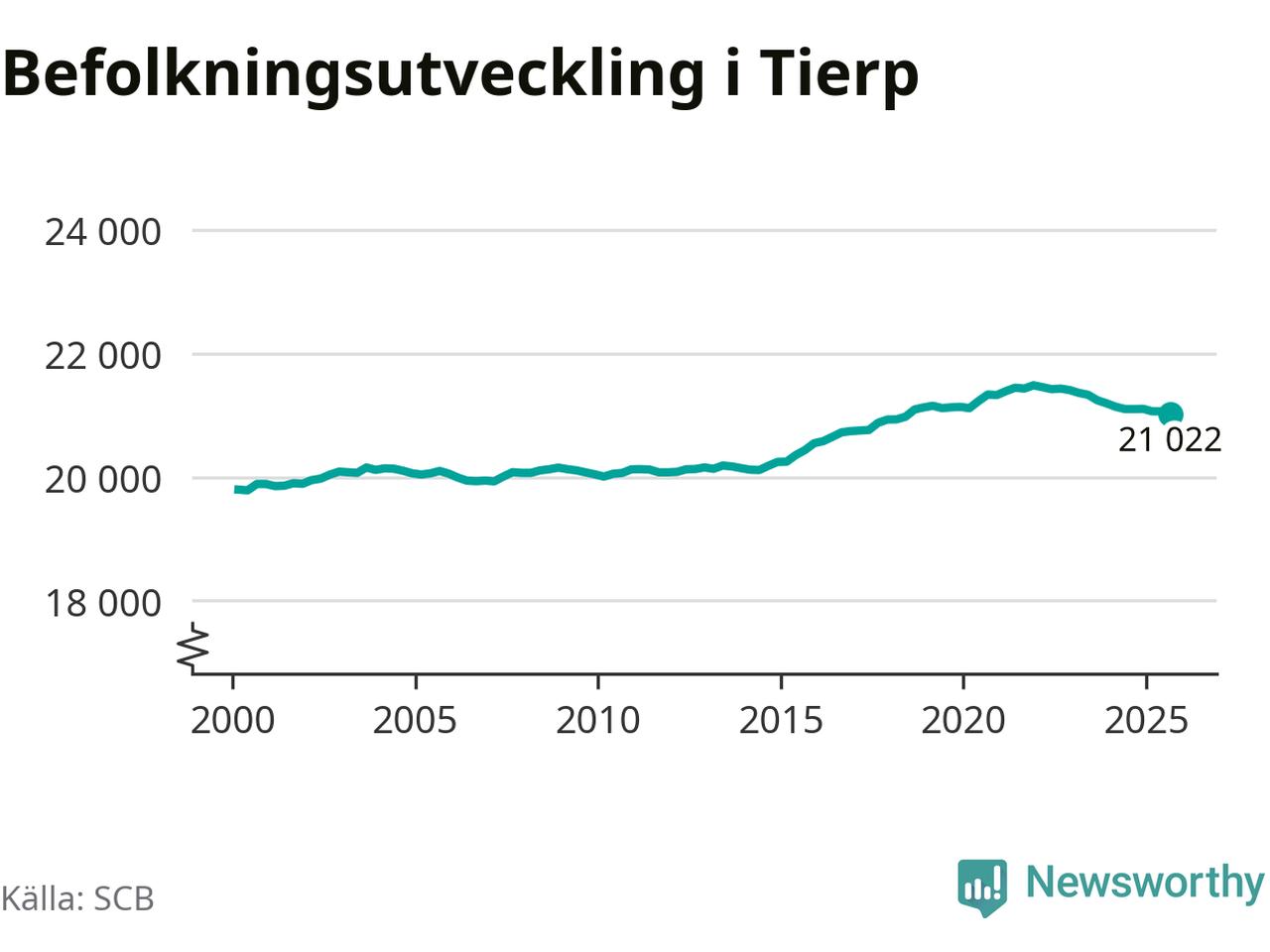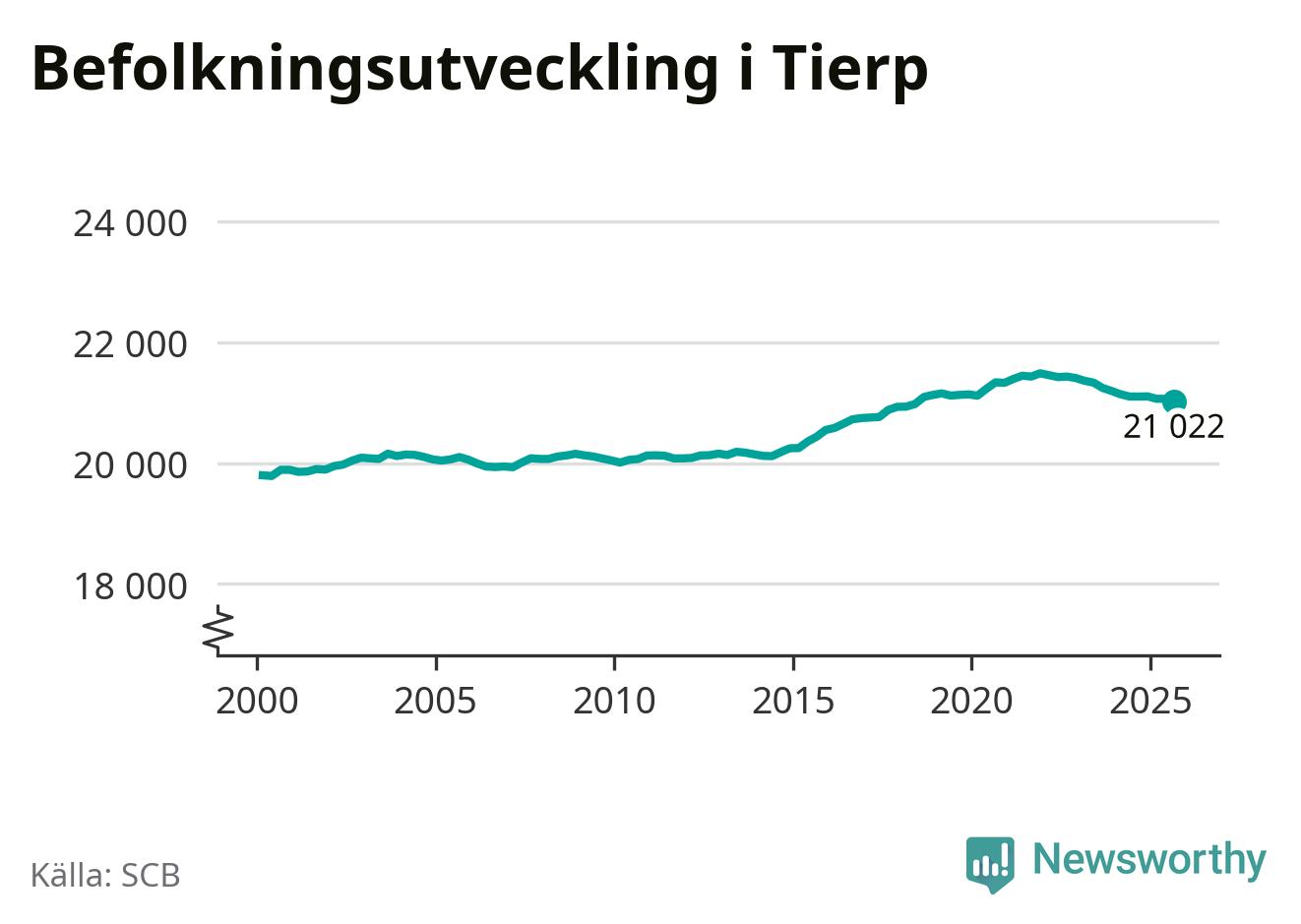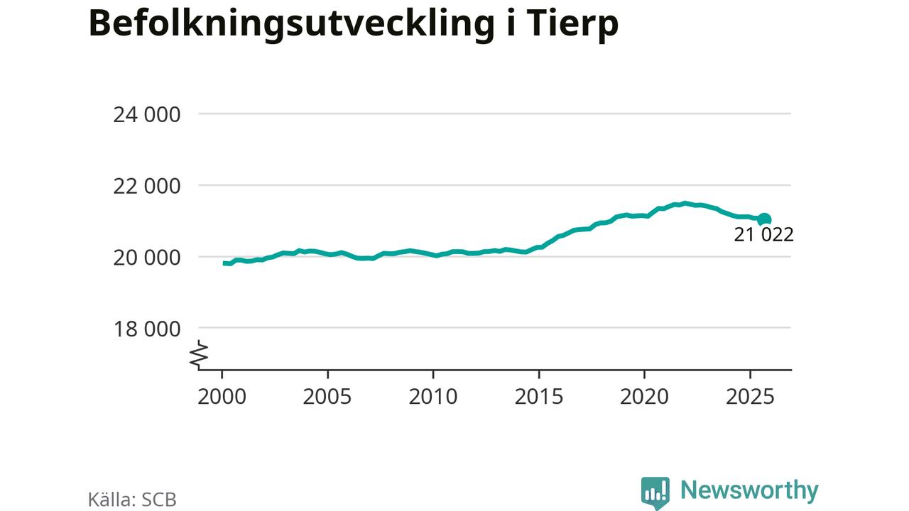 Jämfört med för ett år sedan har befolkningen i Tierp minskat med knappt 80 personer. Sedan millennieskiftet har folkmängden ökat med runt 1 230 personer, eller 6 procent.