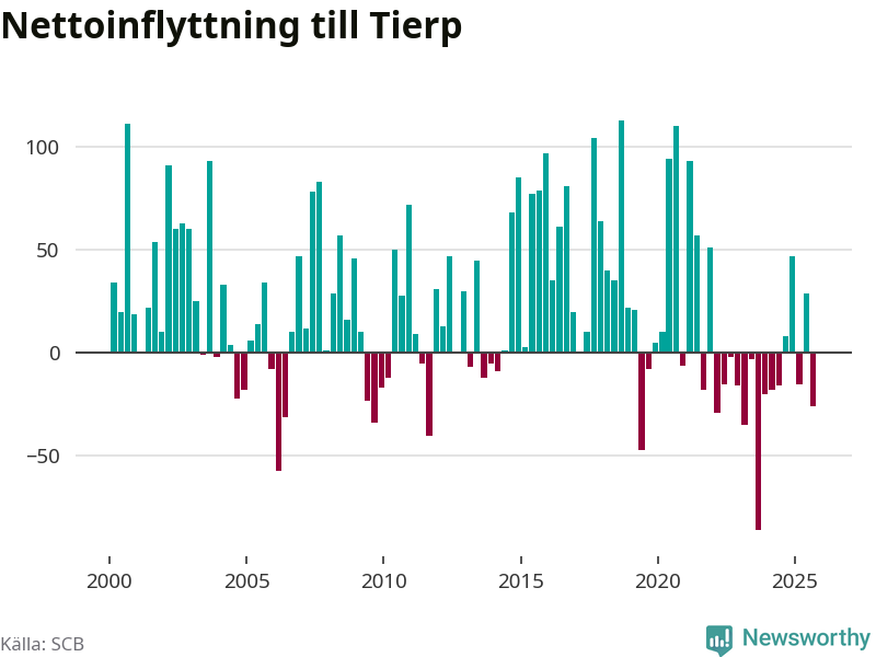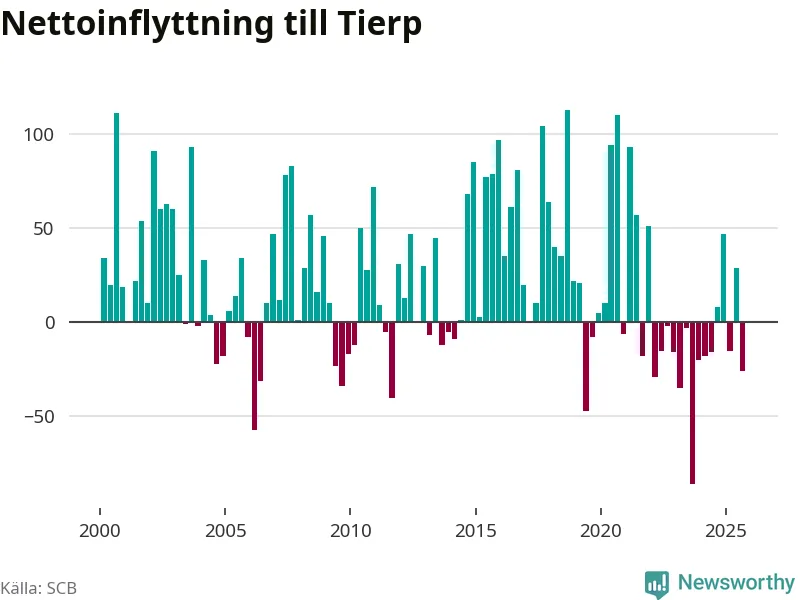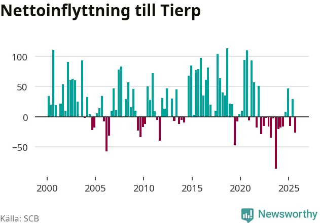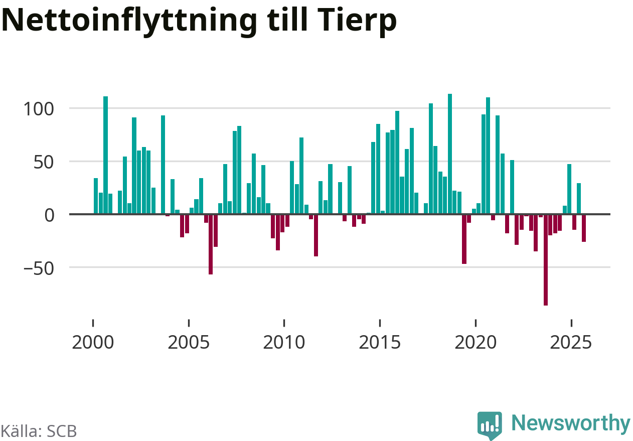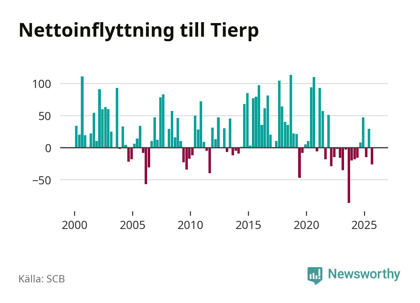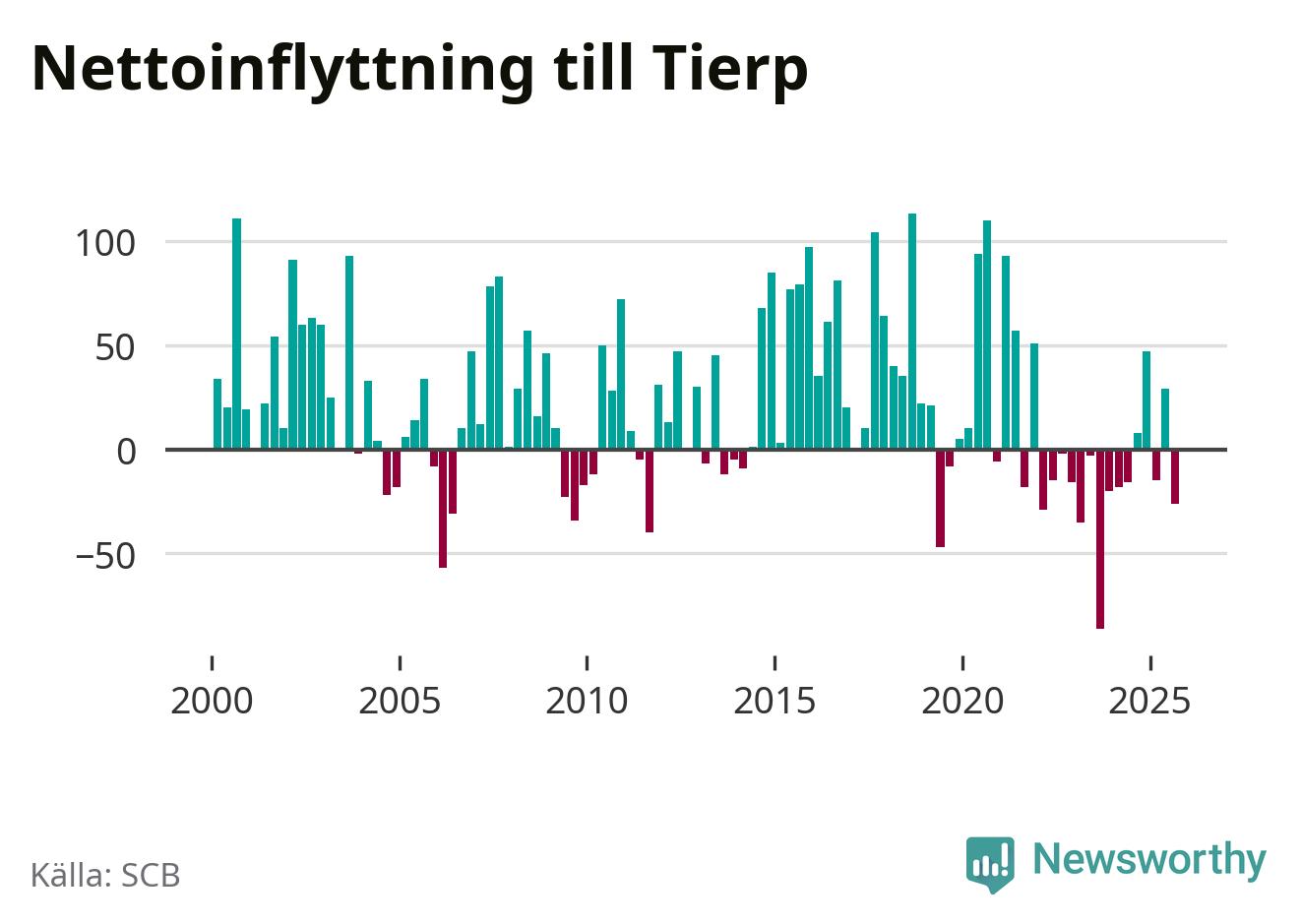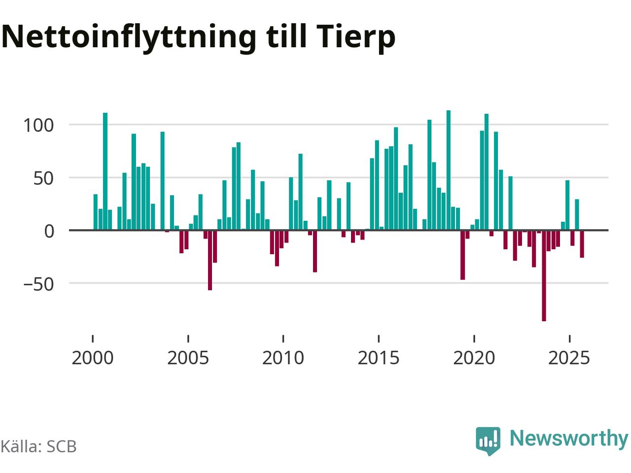 Under tredje kvartalet 2025 flyttade 302 personer till kommunen medan 328 personer flyttade därifrån. Det är historiskt sett en stor utflyttning under ett kvartal. Sedan seklets början har Tierp oftast haft ett positivt flyttnetto.