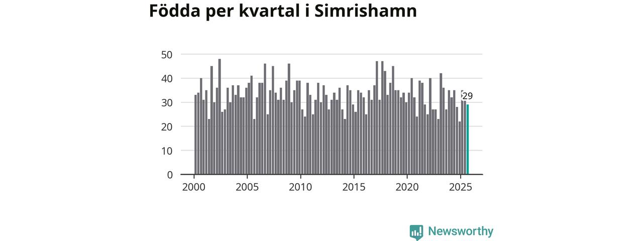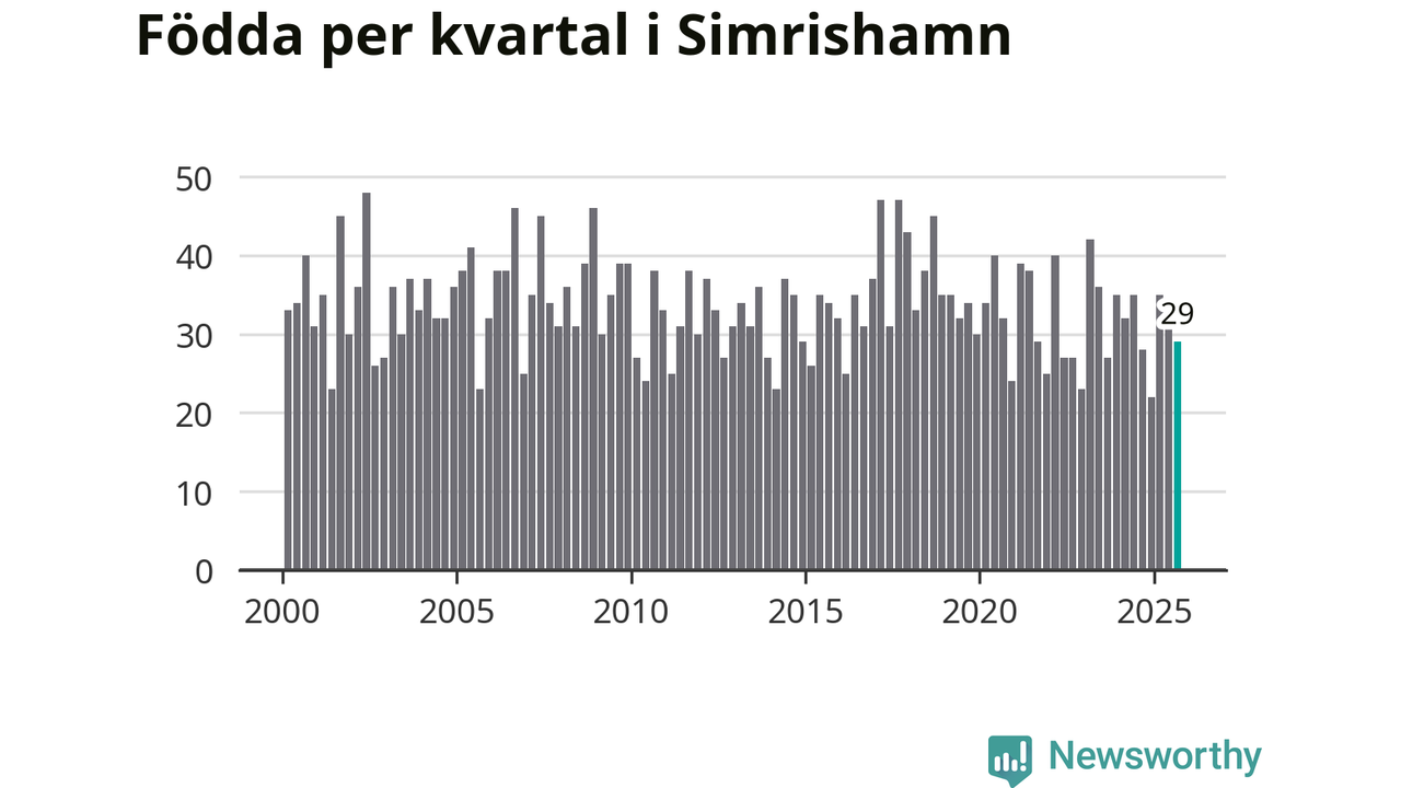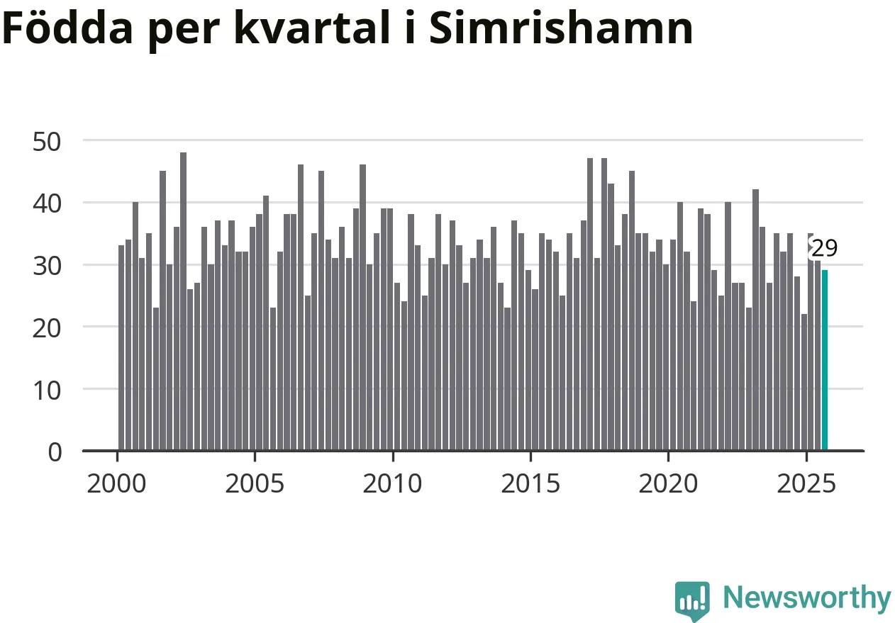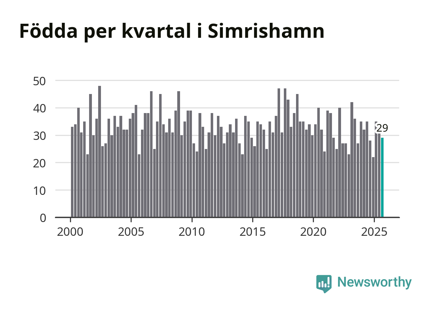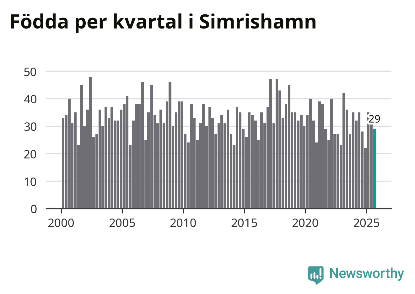 Enligt SCB:s siffror föddes 29 barn i Simrishamn under det senaste kvartalet. Samtidigt avled 69 personer. Simrishamn hade alltså ett negativt födelsenetto, vilket kommunen historiskt sett i princip alltid har haft.