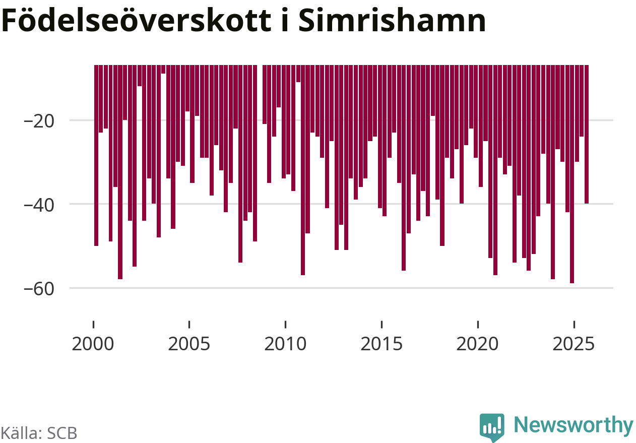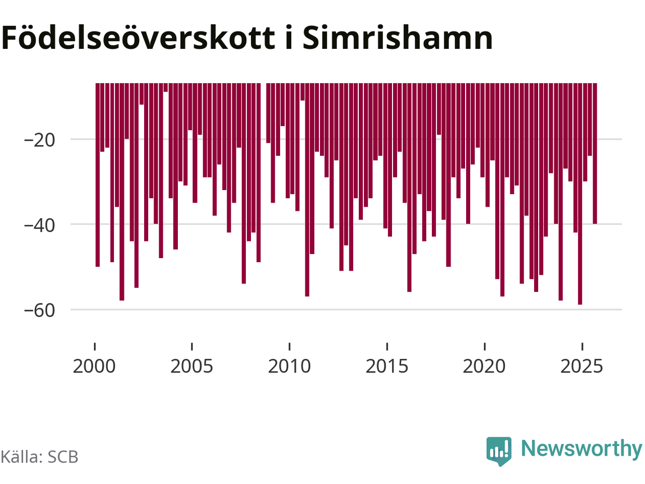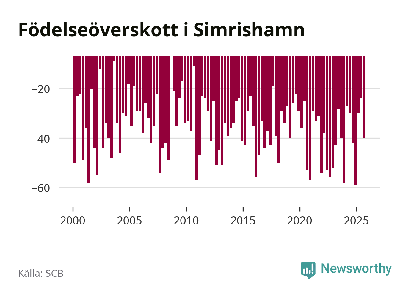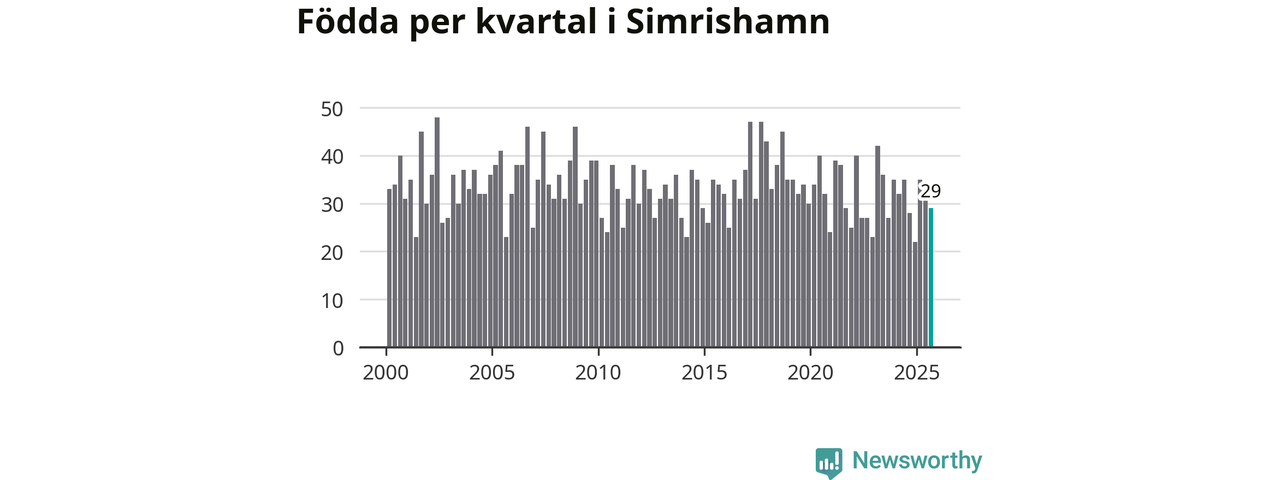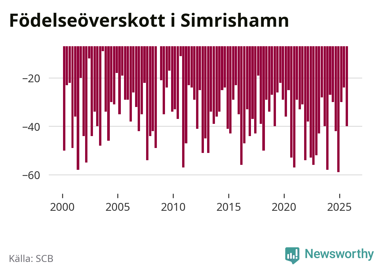 Enligt SCB:s siffror föddes 29 barn i Simrishamn under det senaste kvartalet. Samtidigt avled 69 personer. Simrishamn hade alltså ett negativt födelsenetto, vilket kommunen historiskt sett i princip alltid har haft.