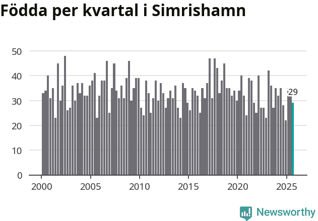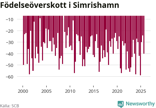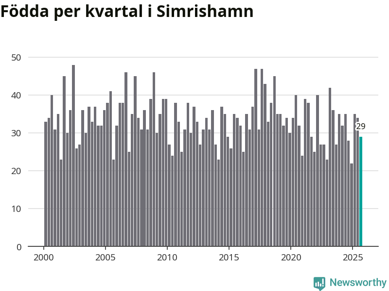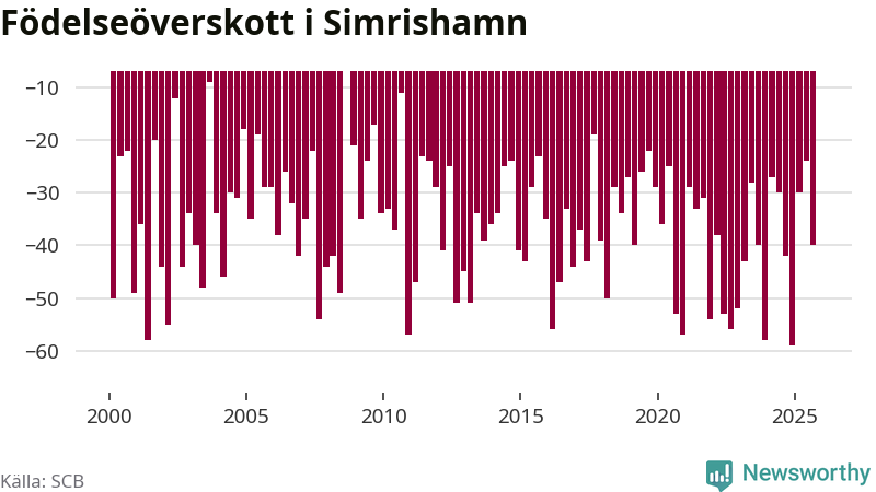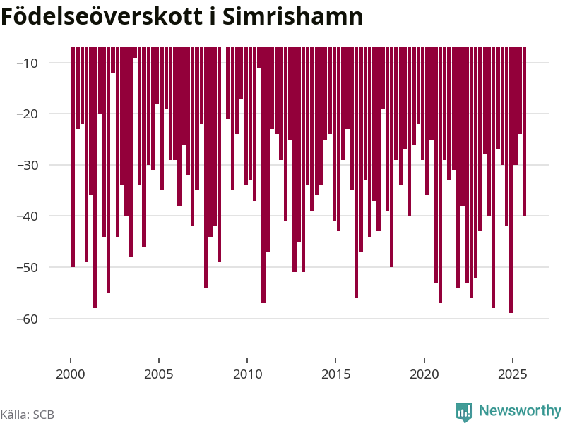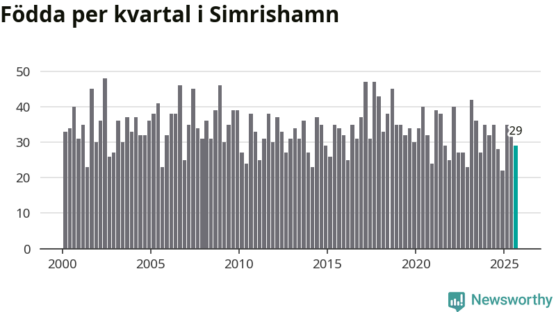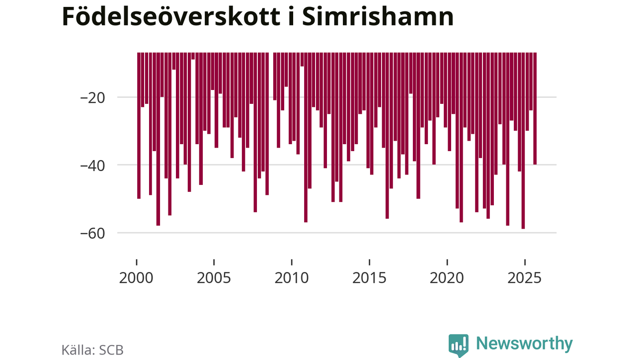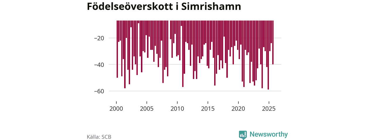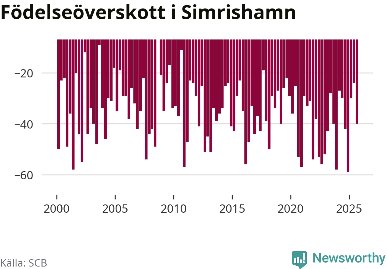 Enligt SCB:s siffror föddes 29 barn i Simrishamn under det senaste kvartalet. Samtidigt avled 69 personer. Simrishamn hade alltså ett negativt födelsenetto, vilket kommunen historiskt sett i princip alltid har haft.
