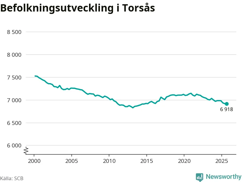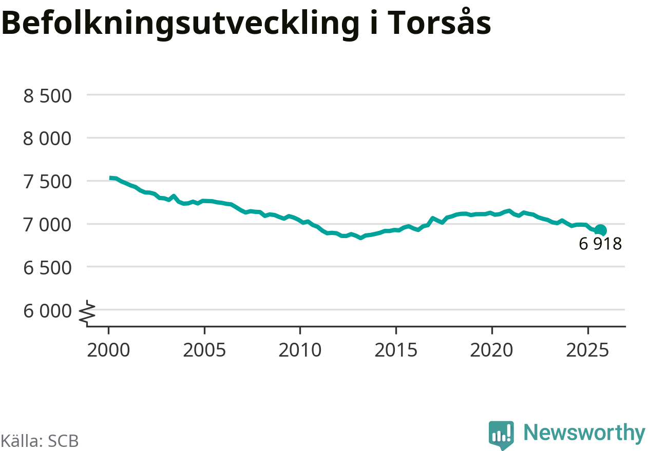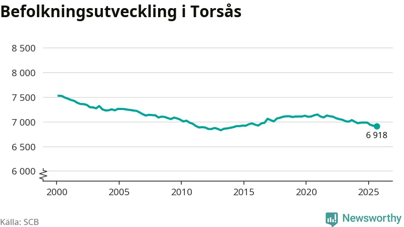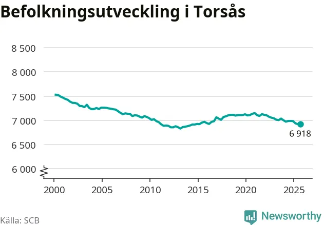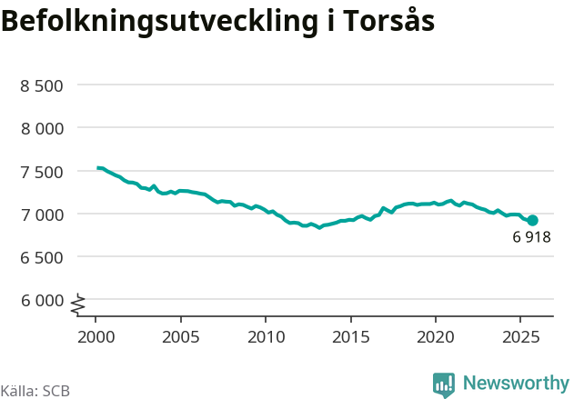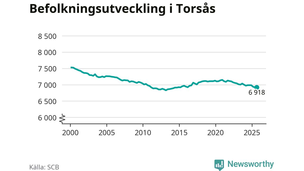 I slutet av tredje kvartalet 2025 bodde 6 918 personer i Torsås kommun, enligt SCB:s senaste siffror. Det är ungefär 70 personer färre än vid samma tidpunkt förra året.