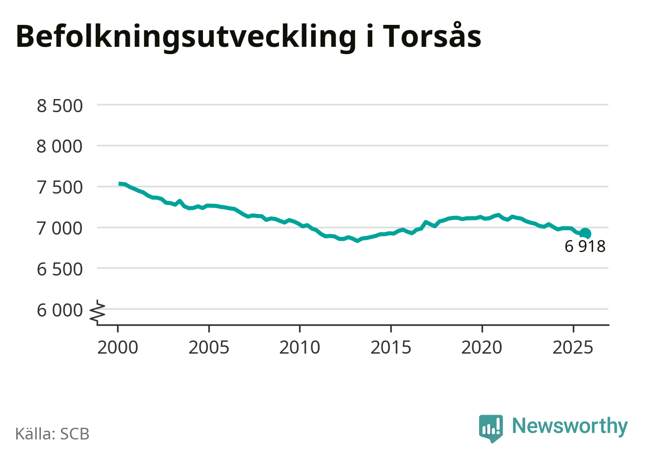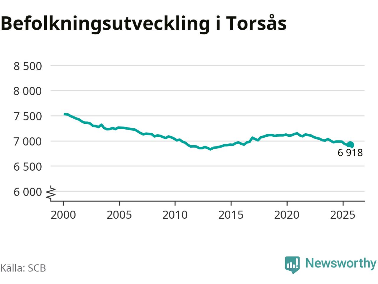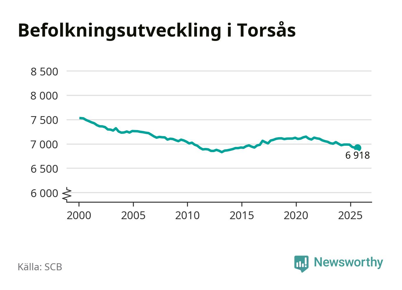 I slutet av tredje kvartalet 2025 bodde 6 918 personer i Torsås kommun, enligt SCB:s senaste siffror. Det är ungefär 70 personer färre än vid samma tidpunkt förra året.