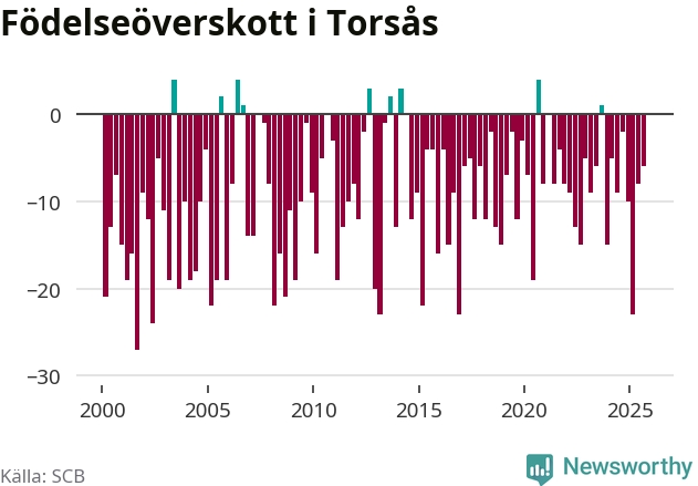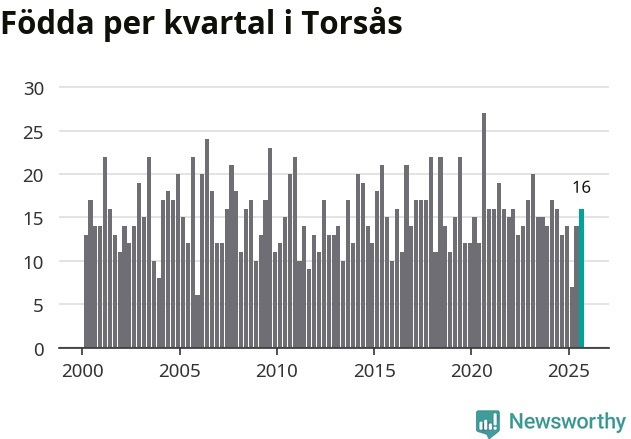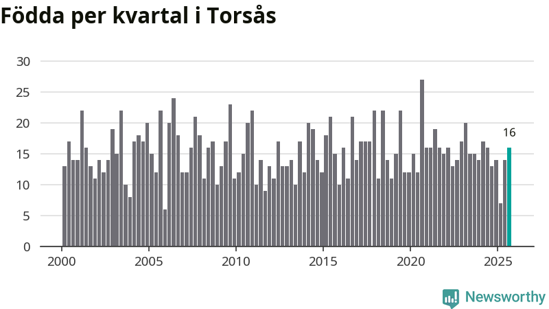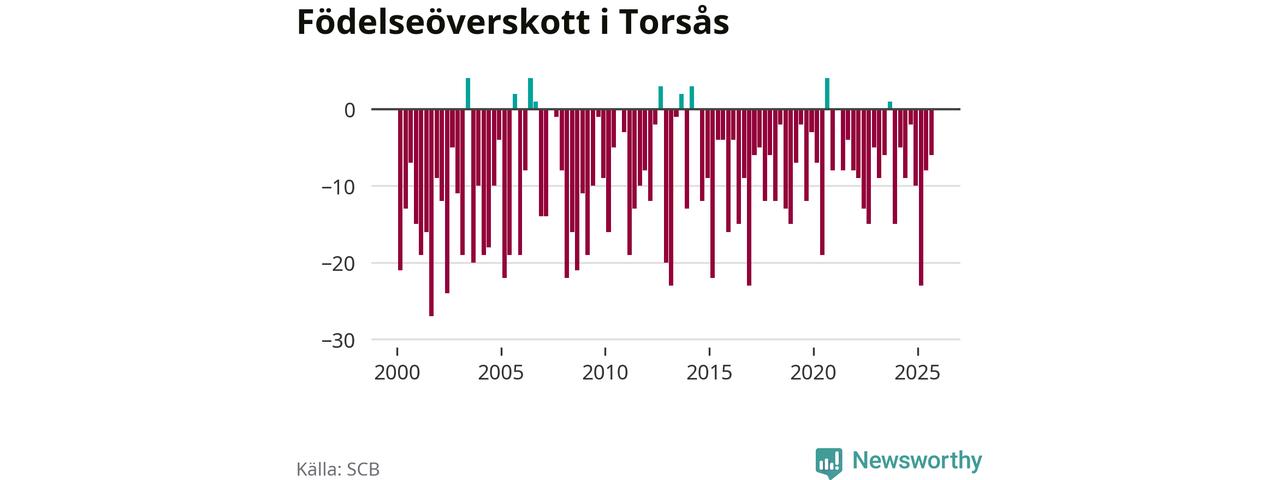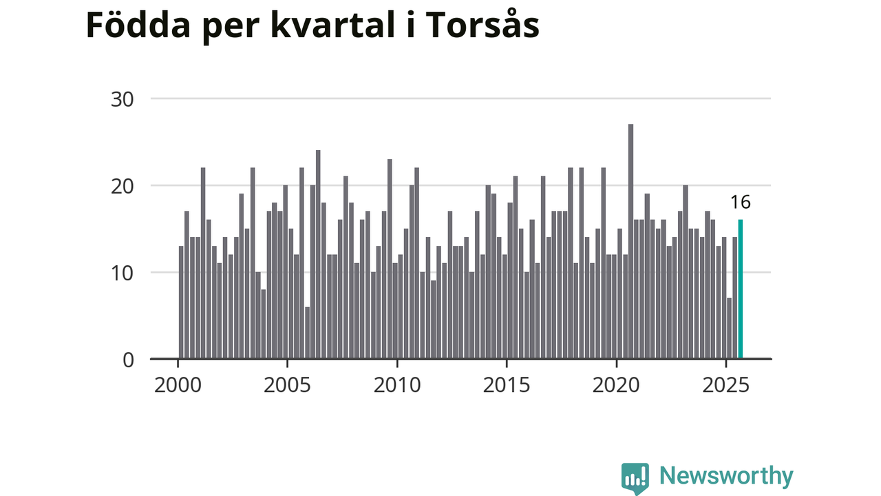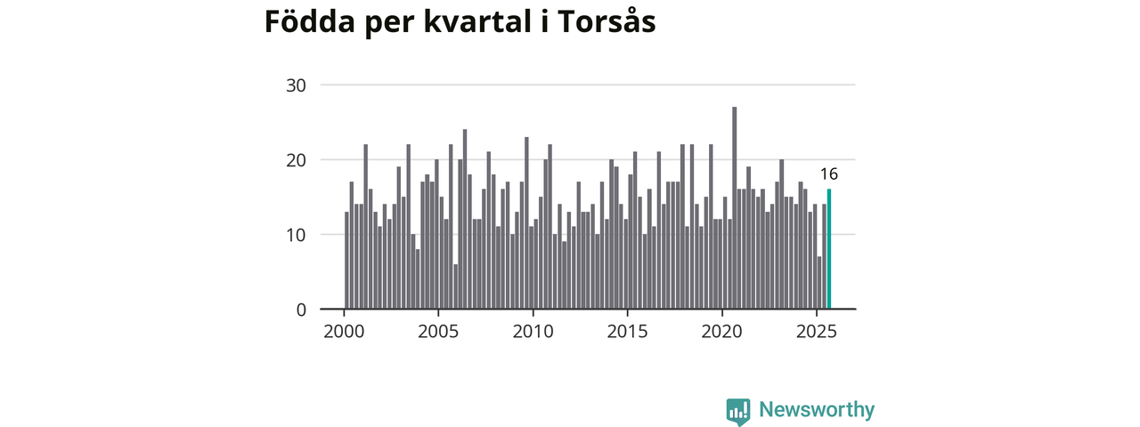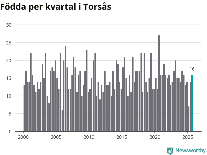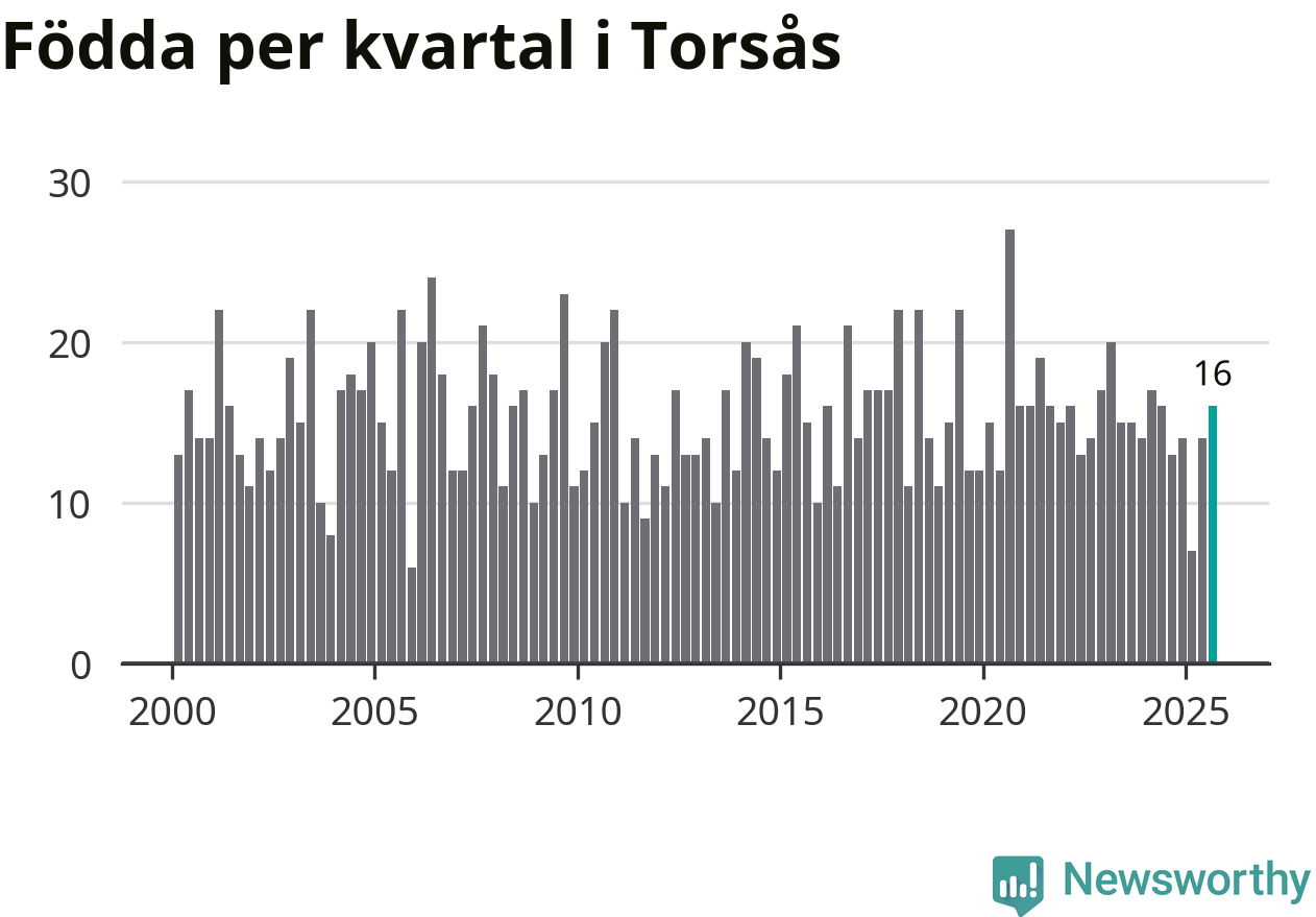Enligt SCB:s siffror föddes 16 barn i Torsås under det senaste kvartalet. Samtidigt avled 22 personer. Skillnaden mellan antal födda och döda är så liten att det inte går att säga om det beror på något annat än SCB:s röjandeskydd. Kommunen har nästan alltid haft negativt födelsenetto tidigare.