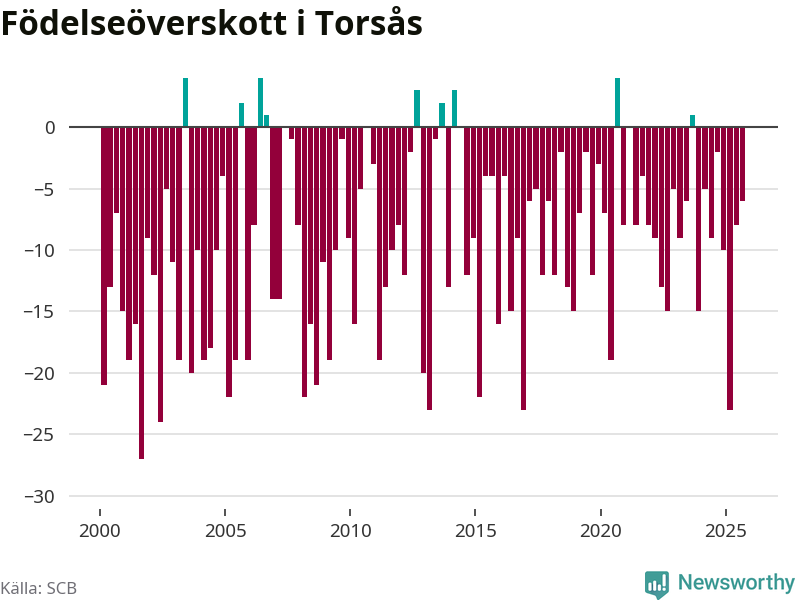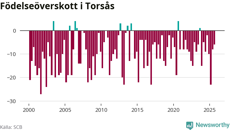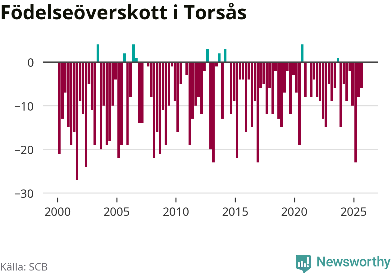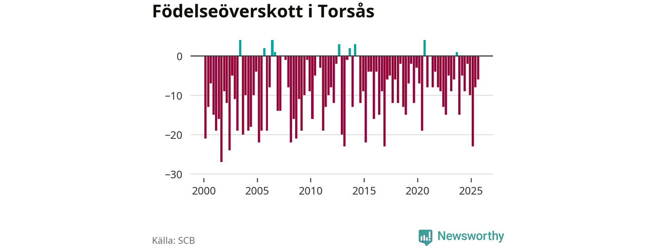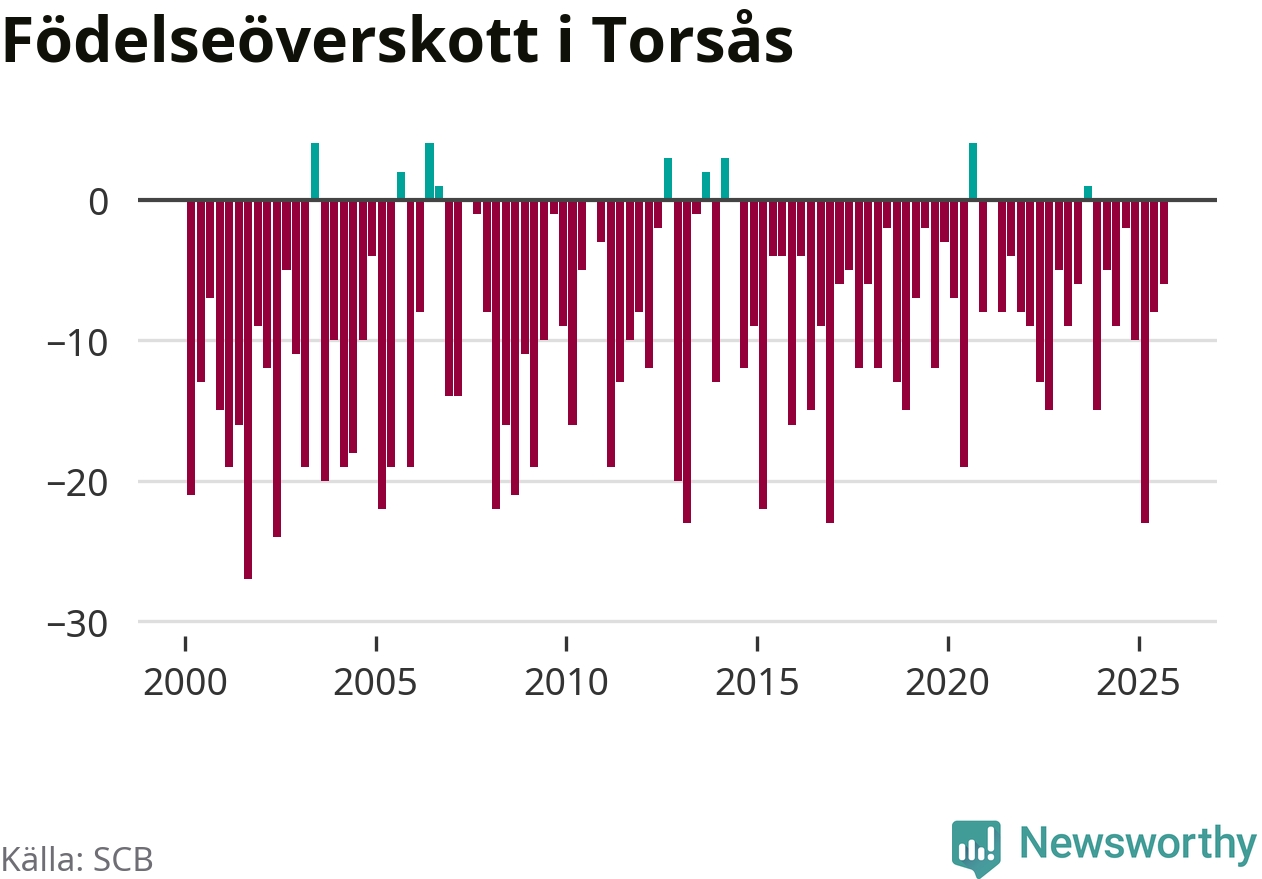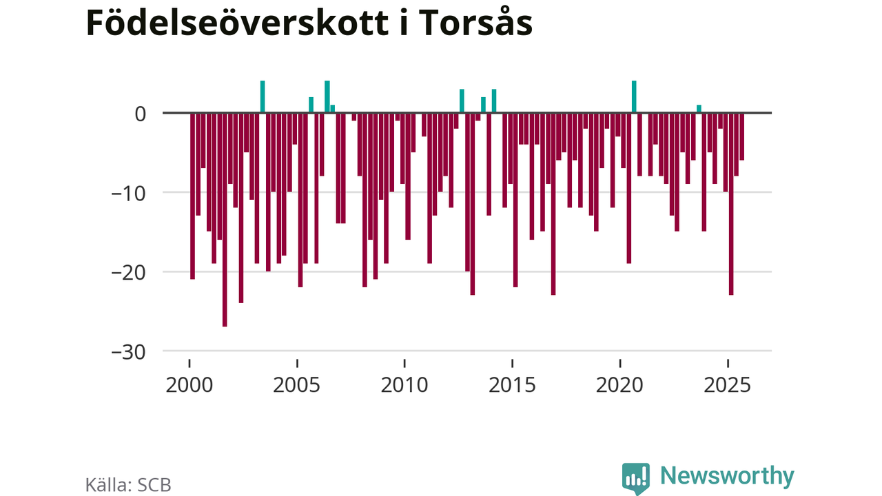 Enligt SCB:s siffror föddes 16 barn i Torsås under det senaste kvartalet. Samtidigt avled 22 personer. Skillnaden mellan antal födda och döda är så liten att det inte går att säga om det beror på något annat än SCB:s röjandeskydd. Kommunen har nästan alltid haft negativt födelsenetto tidigare.