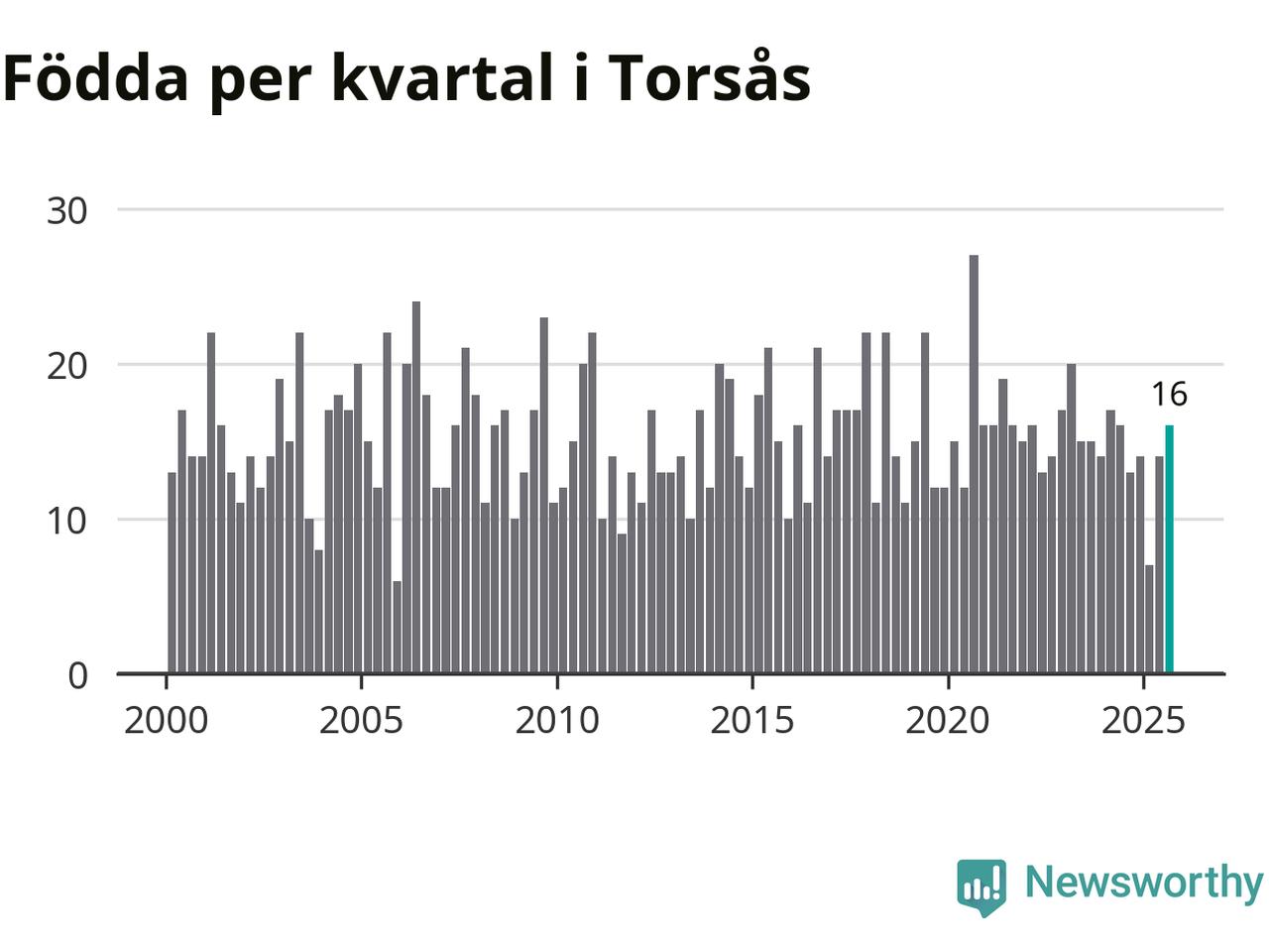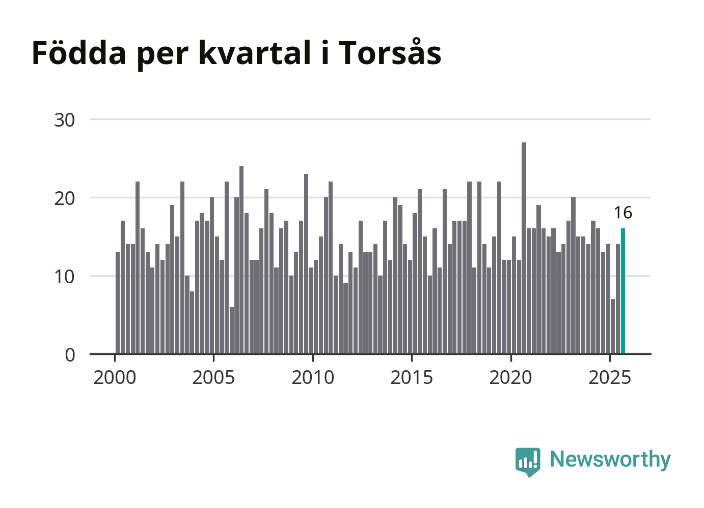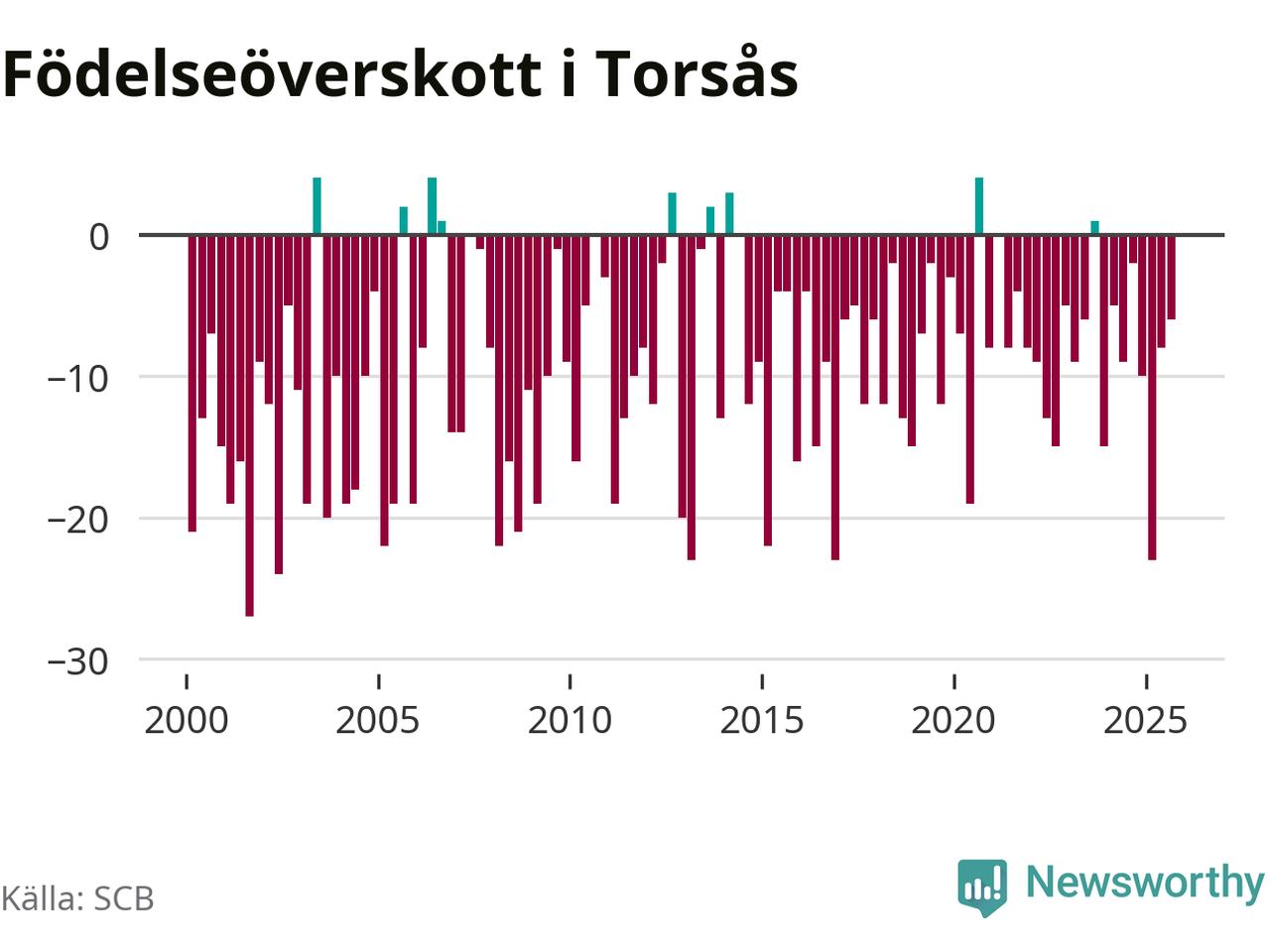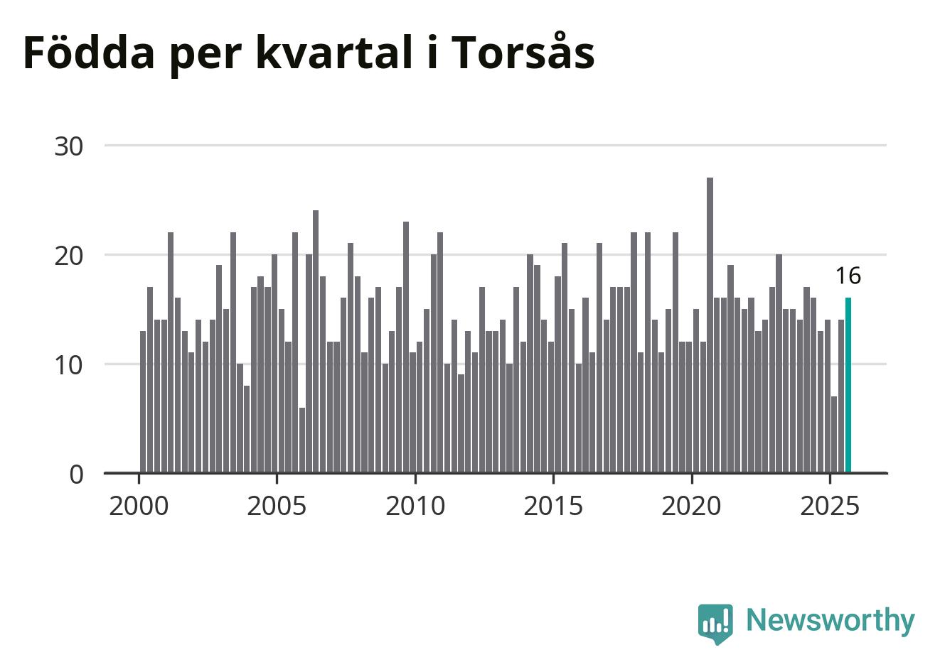 Enligt SCB:s siffror föddes 16 barn i Torsås under det senaste kvartalet. Samtidigt avled 22 personer. Skillnaden mellan antal födda och döda är så liten att det inte går att säga om det beror på något annat än SCB:s röjandeskydd. Kommunen har nästan alltid haft negativt födelsenetto tidigare.