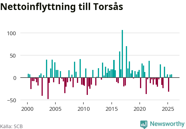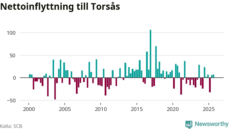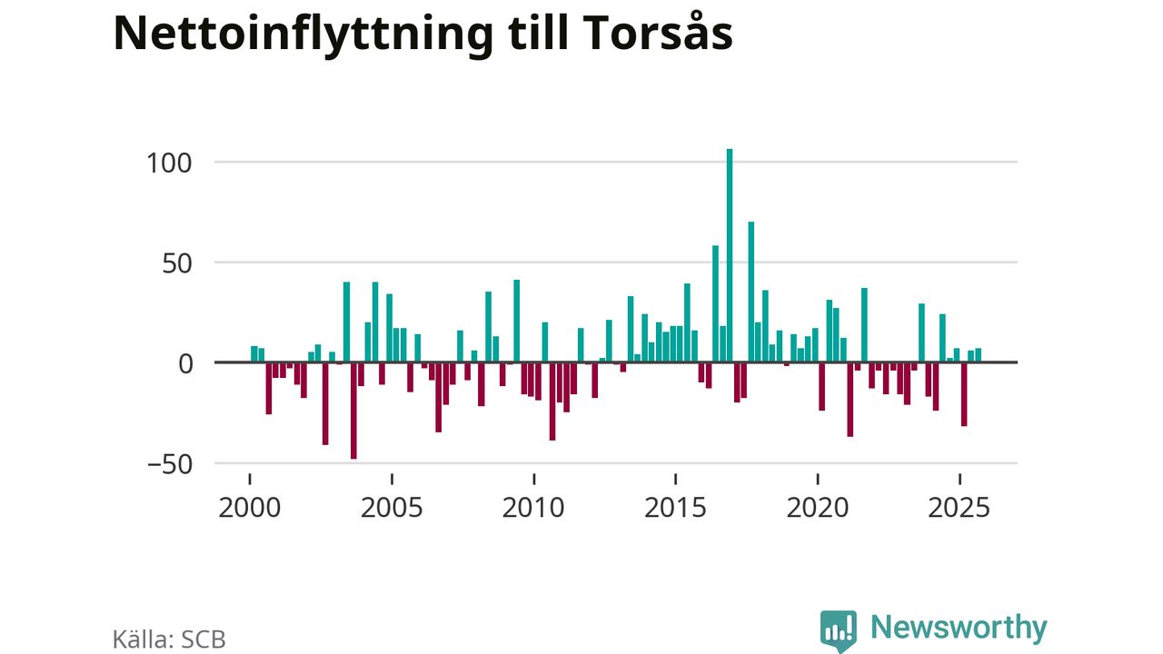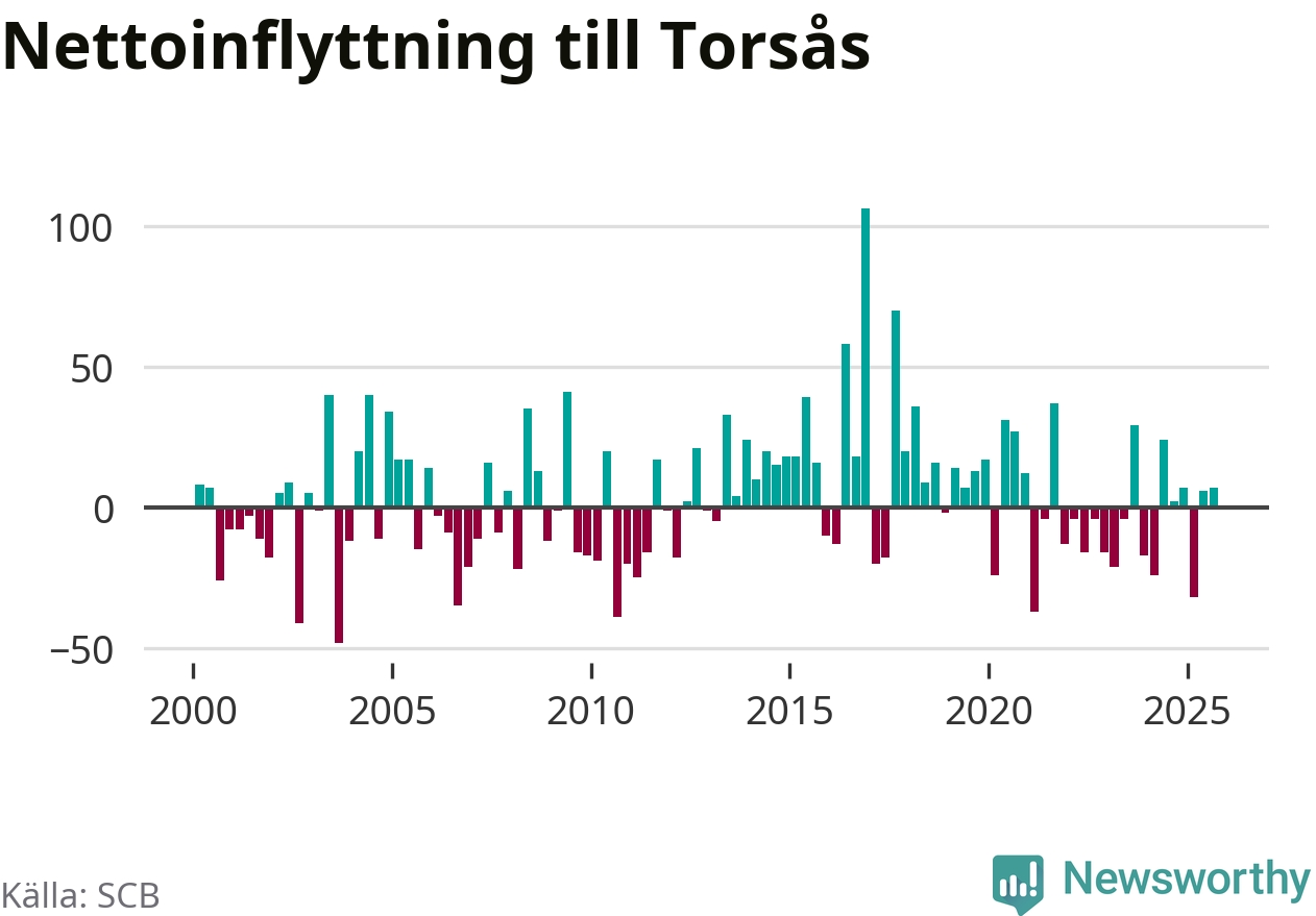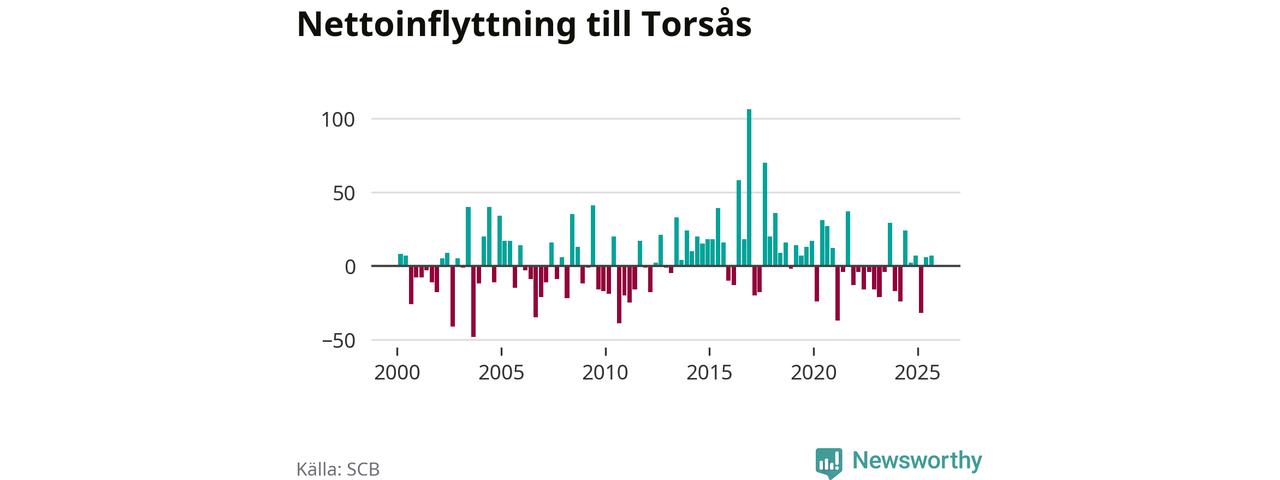Under tredje kvartalet 2025 flyttade 122 personer till kommunen medan 115 personer flyttade därifrån. Skillnaden mellan antalet in- och utflyttade är så liten att den lika gärna kan bero på SCB:s slumpmässiga brus. Sedan seklets början har Torsås haft ungefär lika många kvartal med positivt flyttnetto som negativt.