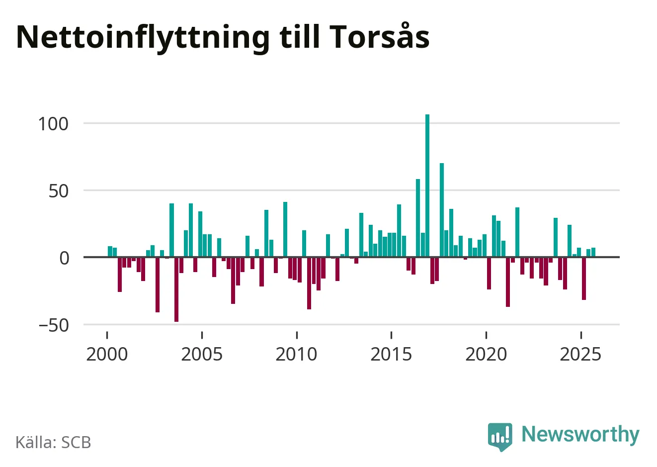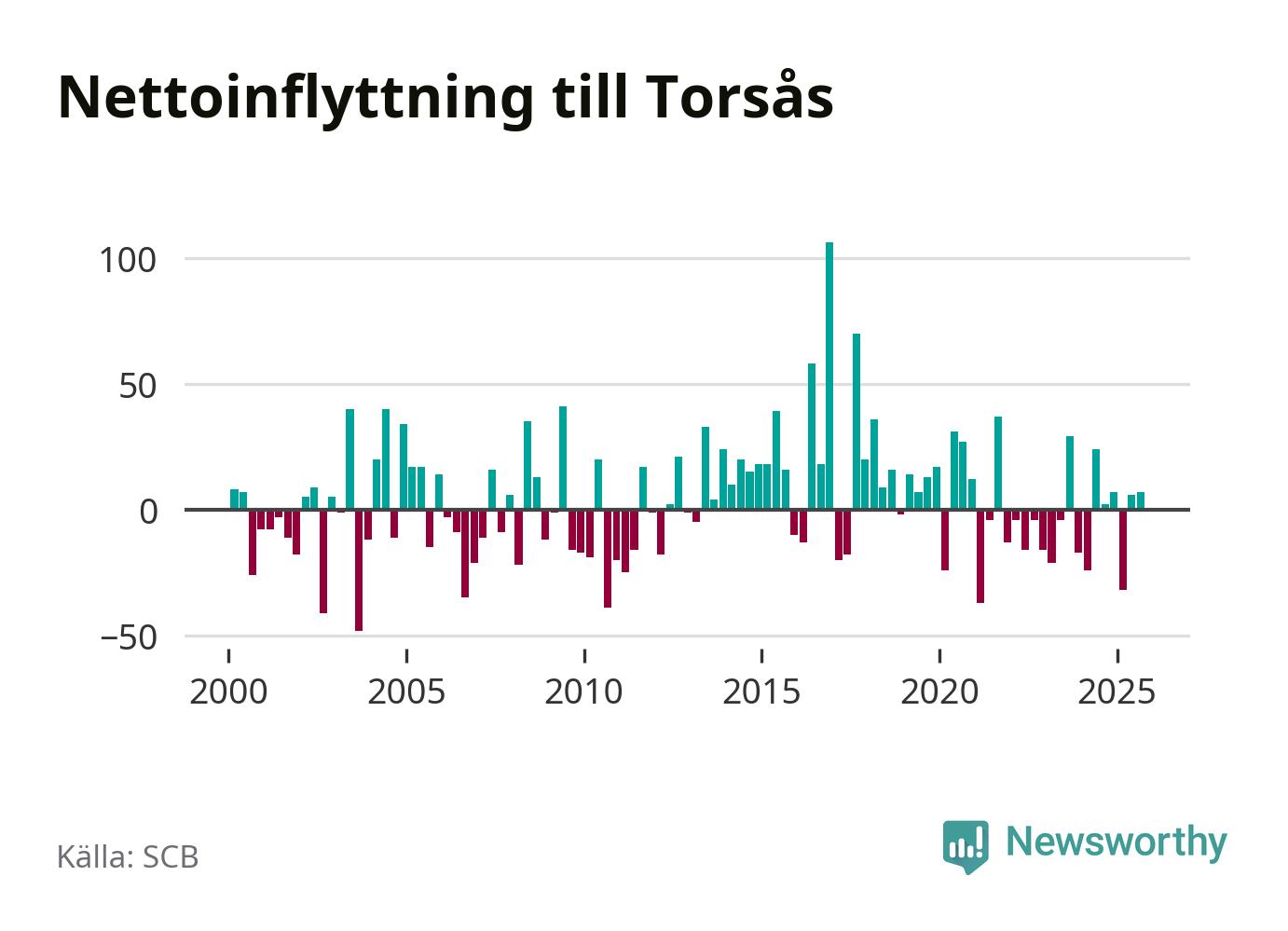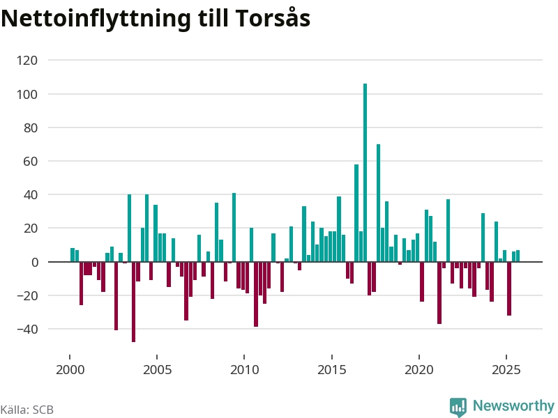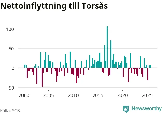 Under tredje kvartalet 2025 flyttade 122 personer till kommunen medan 115 personer flyttade därifrån. Skillnaden mellan antalet in- och utflyttade är så liten att den lika gärna kan bero på SCB:s slumpmässiga brus. Sedan seklets början har Torsås haft ungefär lika många kvartal med positivt flyttnetto som negativt.