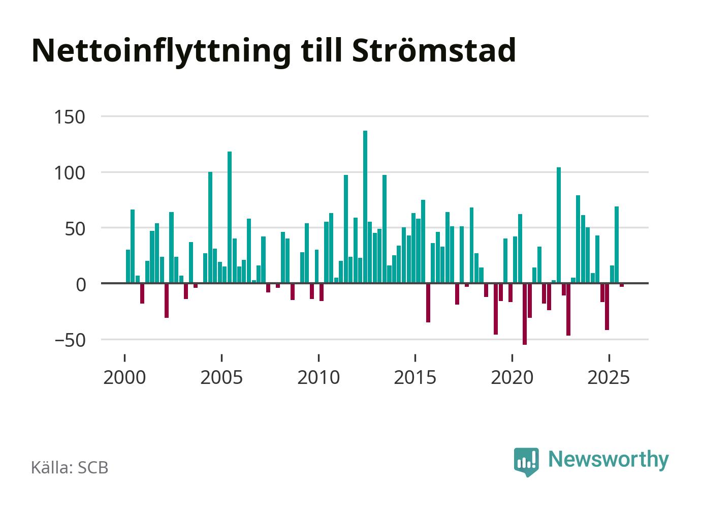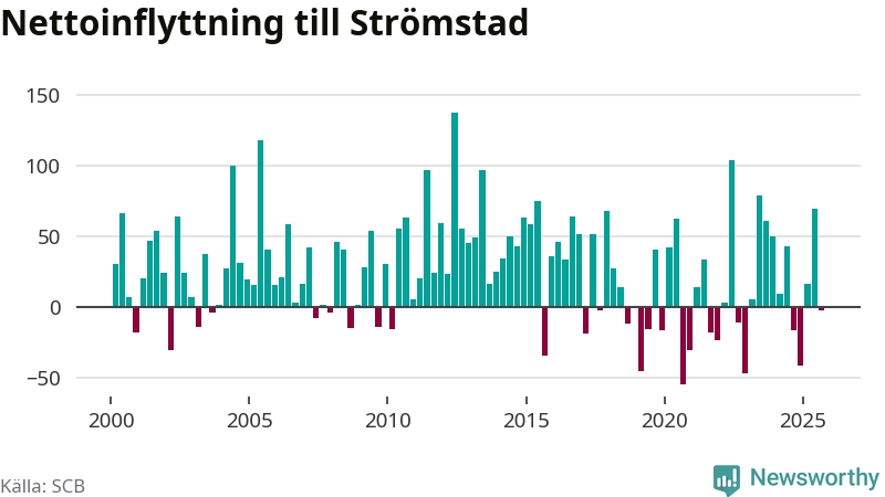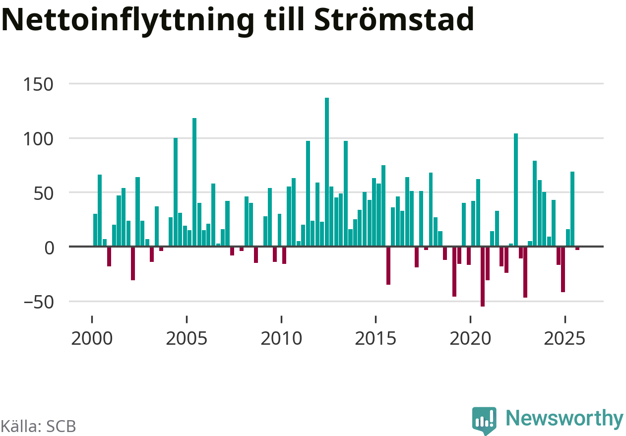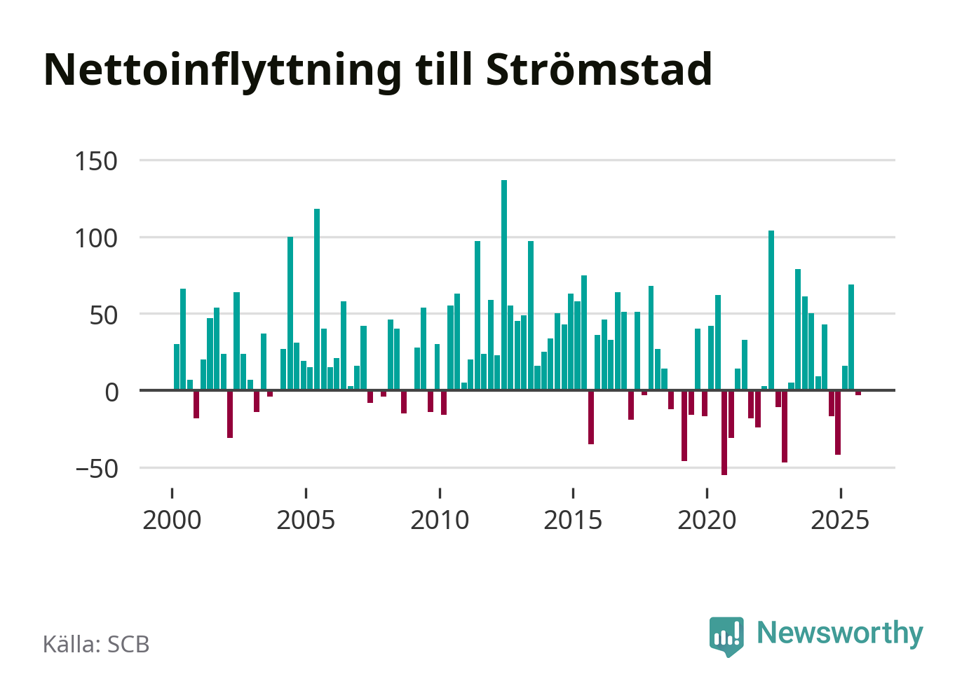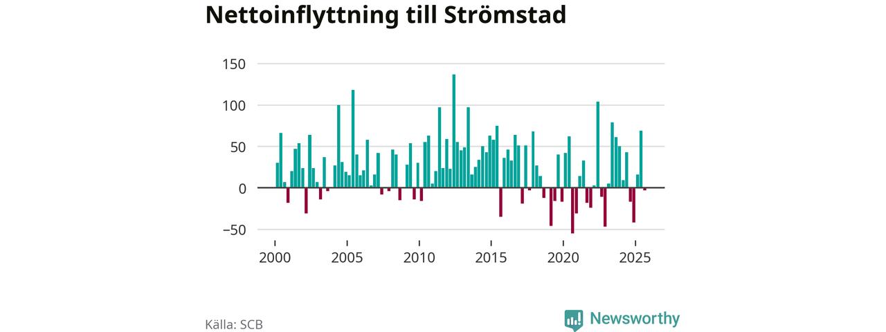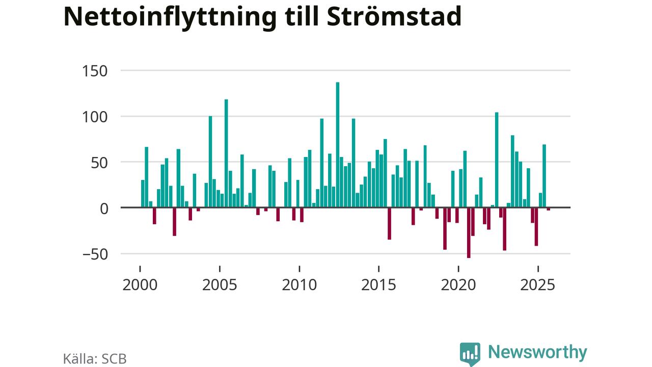 Under tredje kvartalet 2025 flyttade 230 personer till kommunen medan 233 personer flyttade därifrån. Det är historiskt sett en stor inflyttning under ett kvartal – men samtidigt var utflyttningen relativt stor. Skillnaden mellan antalet in- och utflyttade är så liten att den lika gärna kan bero på SCB:s slumpmässiga brus. Sedan seklets början har Strömstad oftast haft ett positivt flyttnetto.
