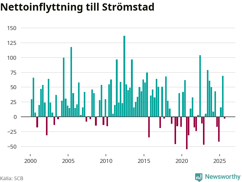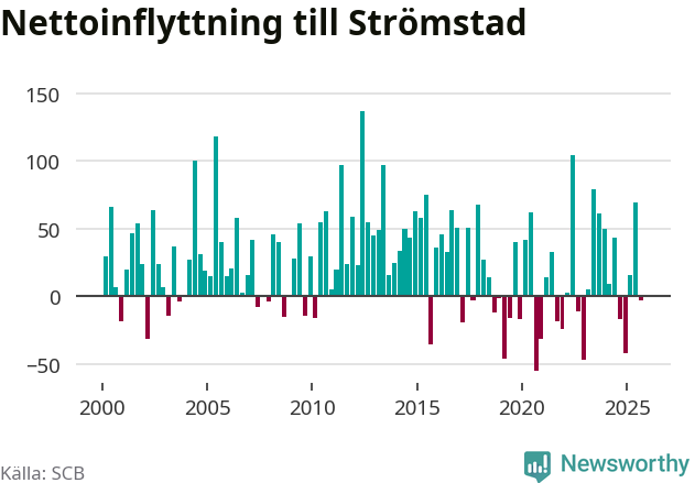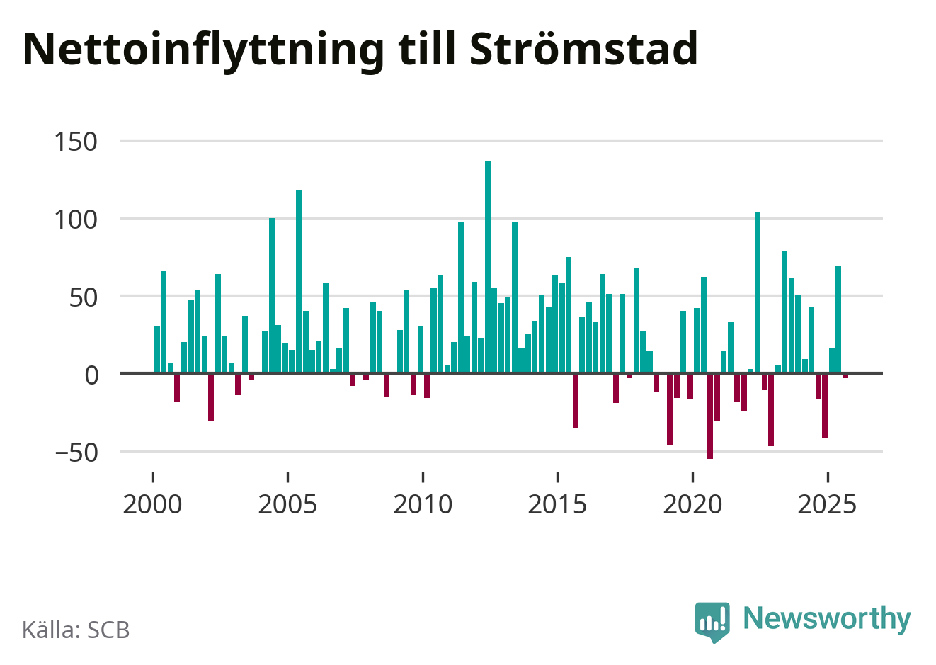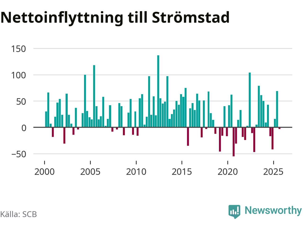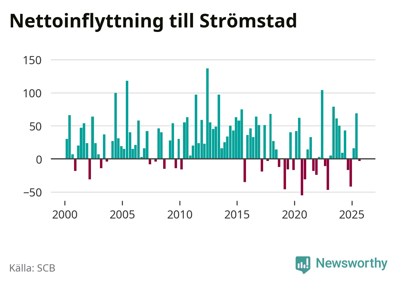 Under tredje kvartalet 2025 flyttade 230 personer till kommunen medan 233 personer flyttade därifrån. Det är historiskt sett en stor inflyttning under ett kvartal – men samtidigt var utflyttningen relativt stor. Skillnaden mellan antalet in- och utflyttade är så liten att den lika gärna kan bero på SCB:s slumpmässiga brus. Sedan seklets början har Strömstad oftast haft ett positivt flyttnetto.