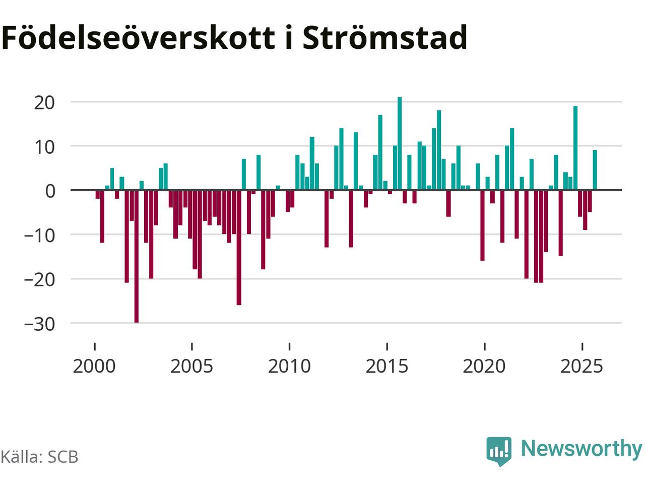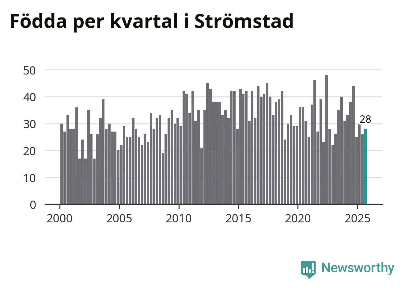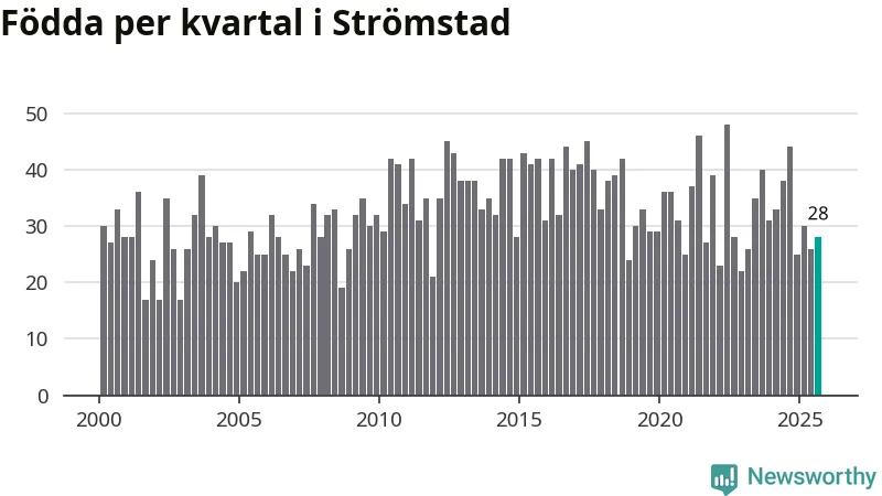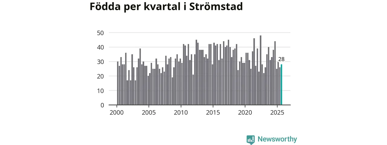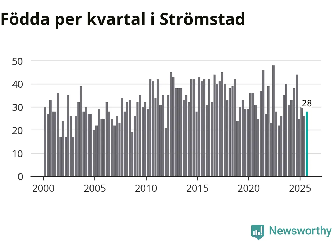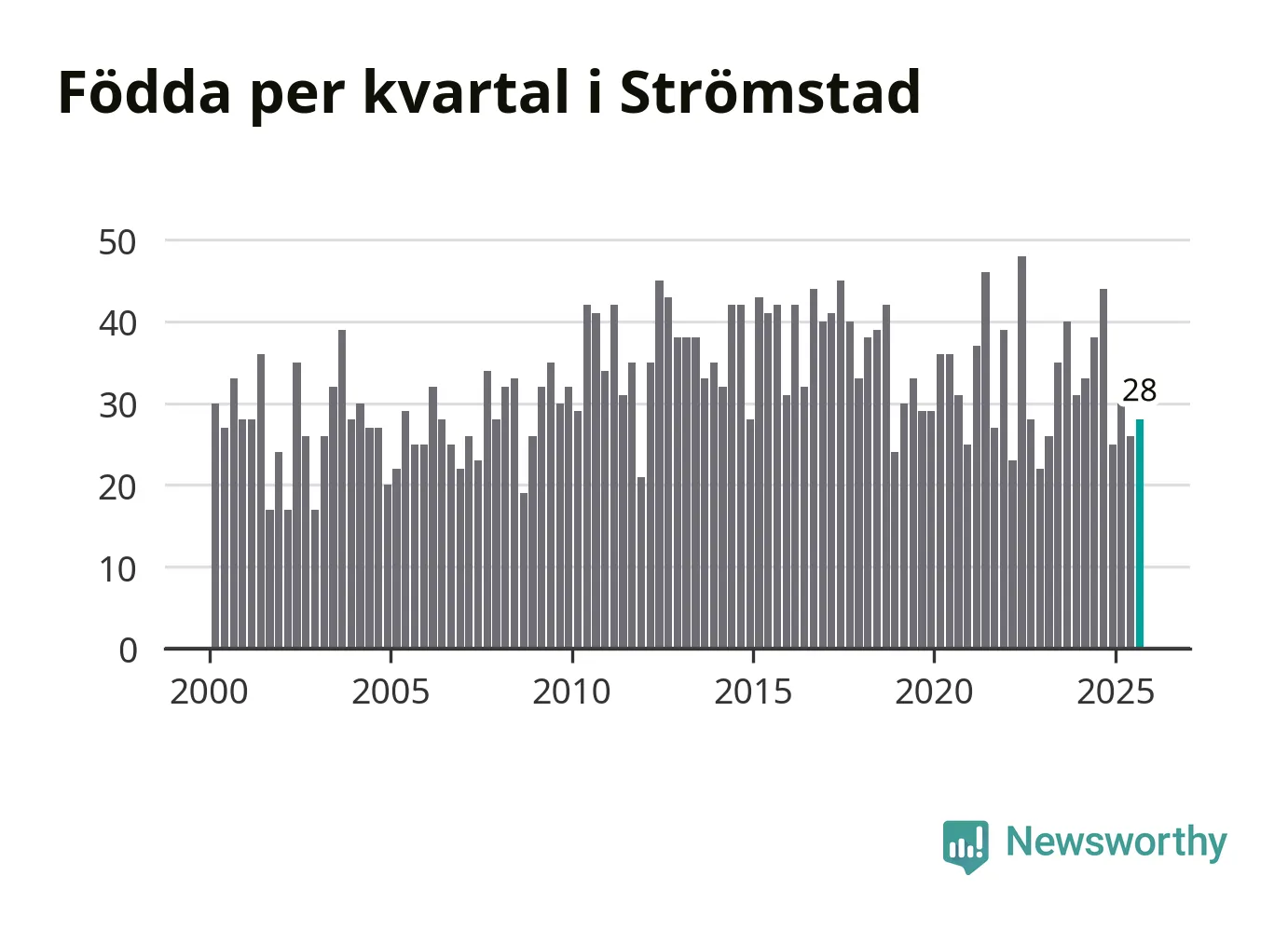 Enligt SCB:s siffror föddes 28 barn i Strömstad under det senaste kvartalet. Samtidigt avled relativt få – 19 personer. Skillnaden mellan antal födda och döda är så liten att det inte går att säga om det beror på något annat än SCB:s röjandeskydd. Kommunen har oftast haft positivt födelsenetto tidigare.