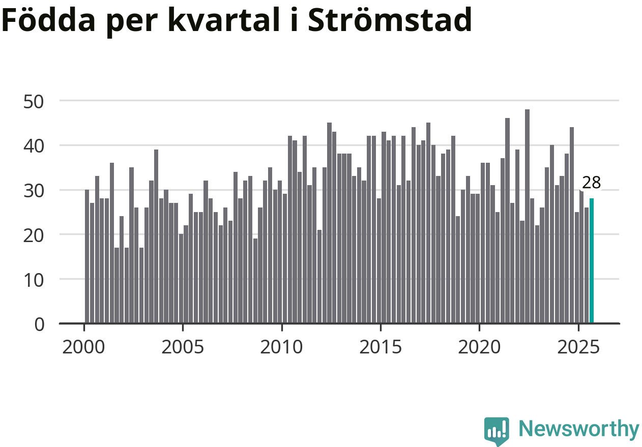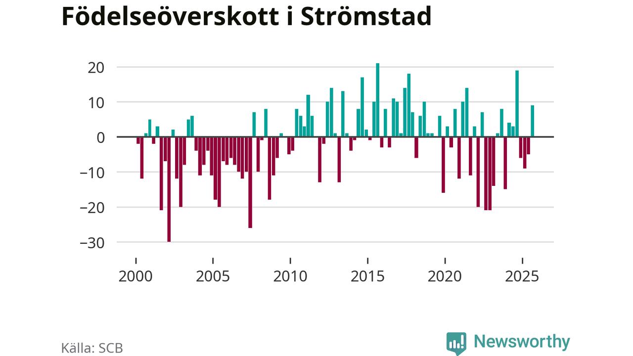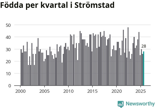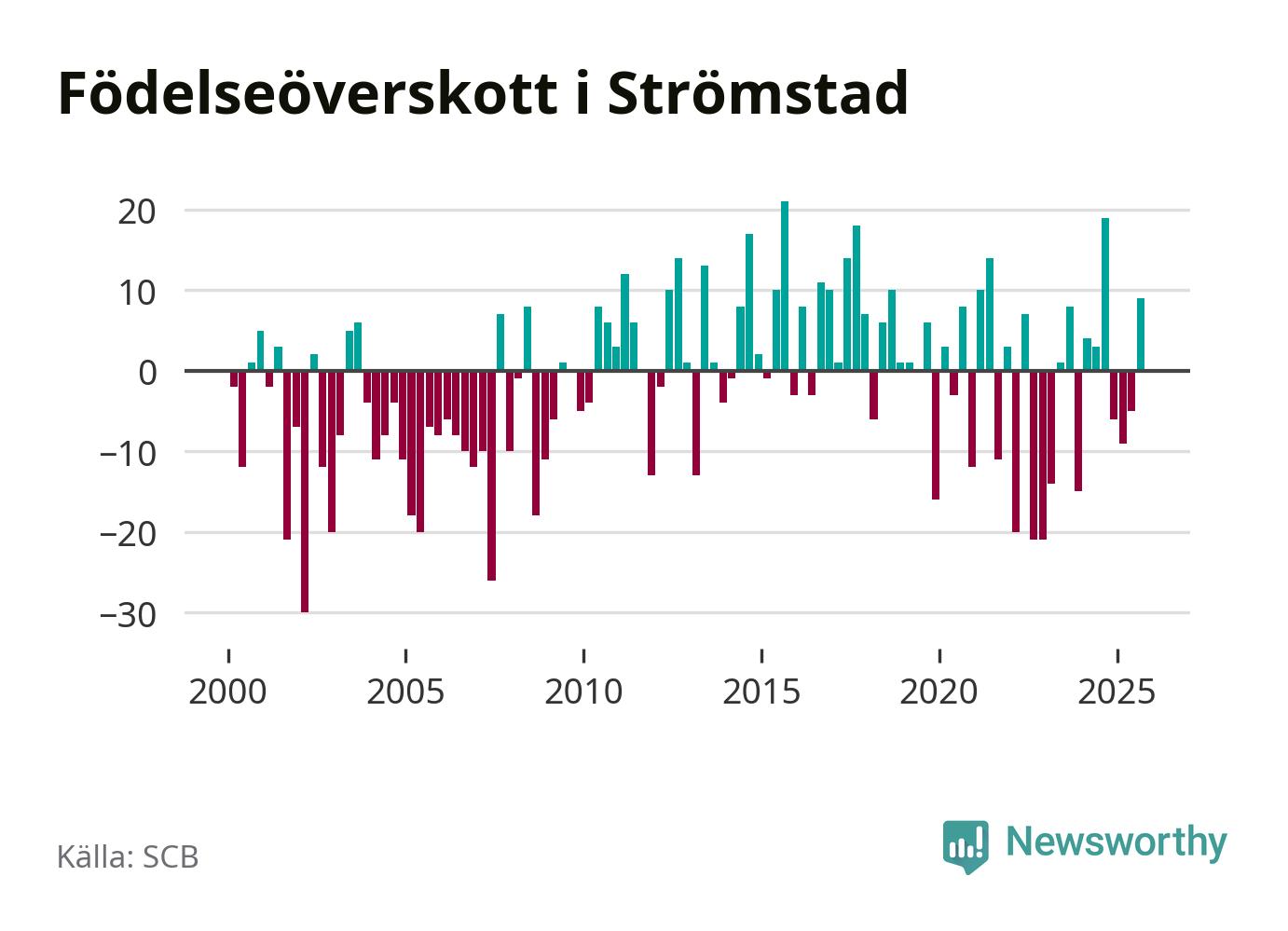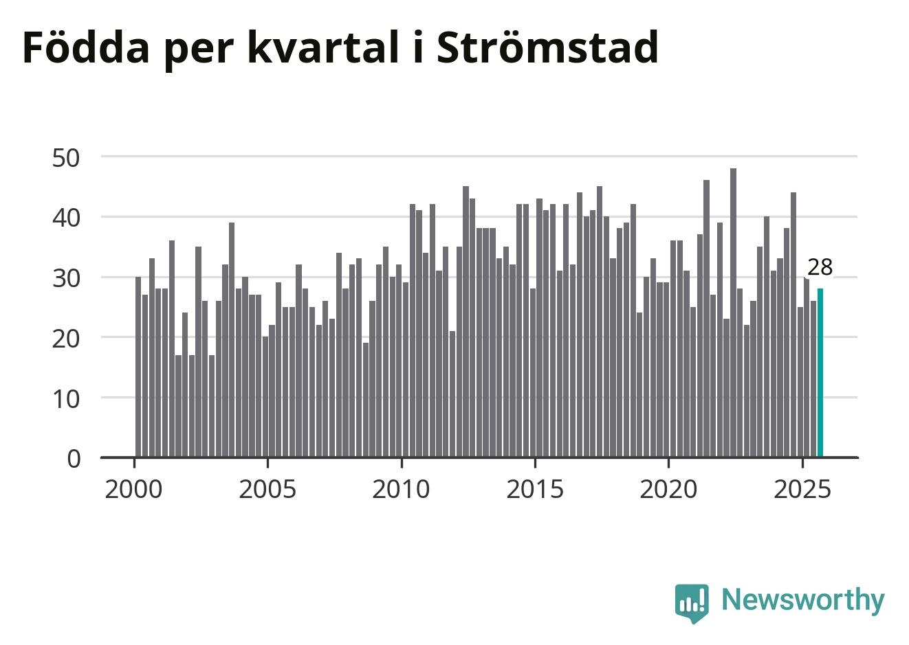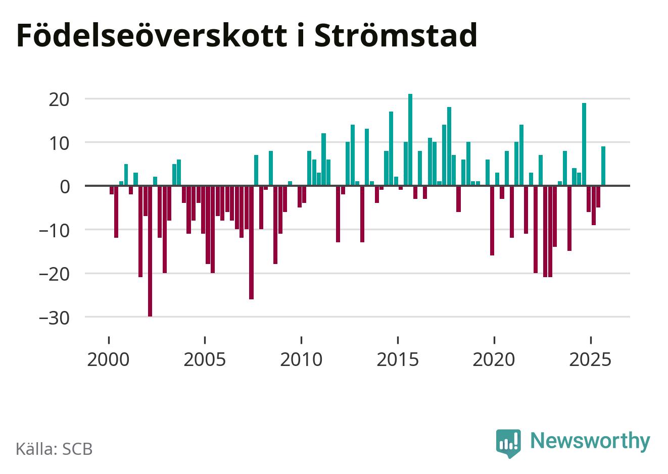 Enligt SCB:s siffror föddes 28 barn i Strömstad under det senaste kvartalet. Samtidigt avled relativt få – 19 personer. Skillnaden mellan antal födda och döda är så liten att det inte går att säga om det beror på något annat än SCB:s röjandeskydd. Kommunen har oftast haft positivt födelsenetto tidigare.