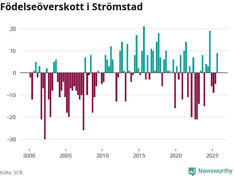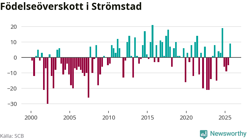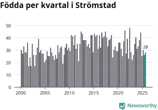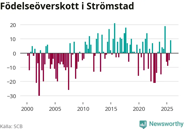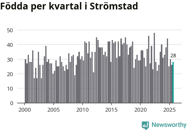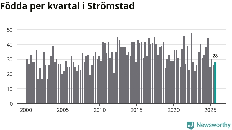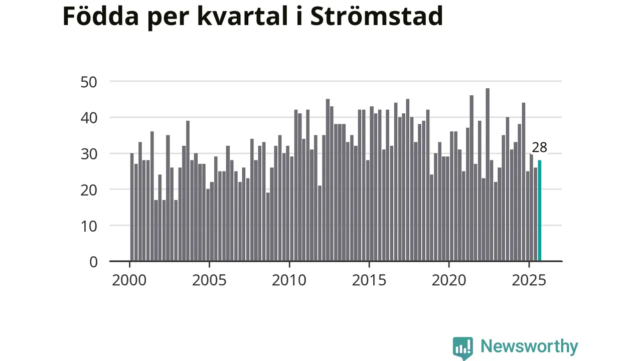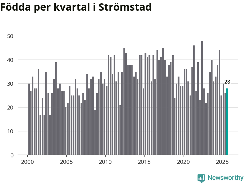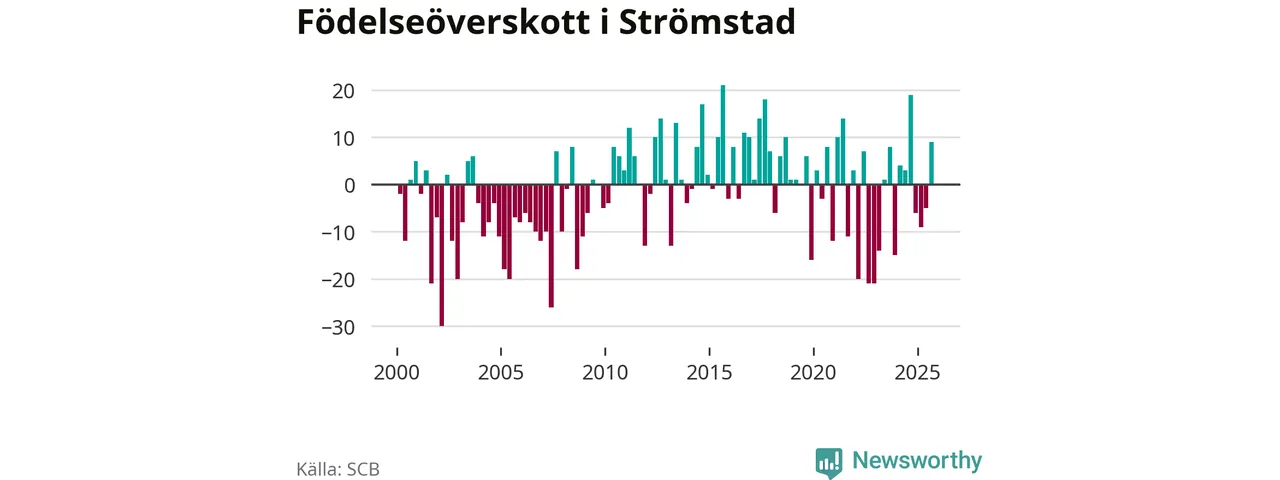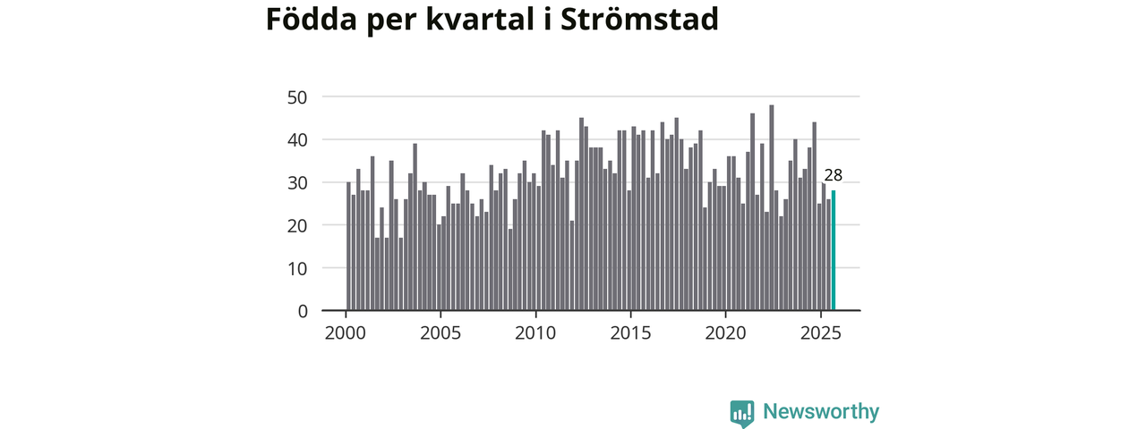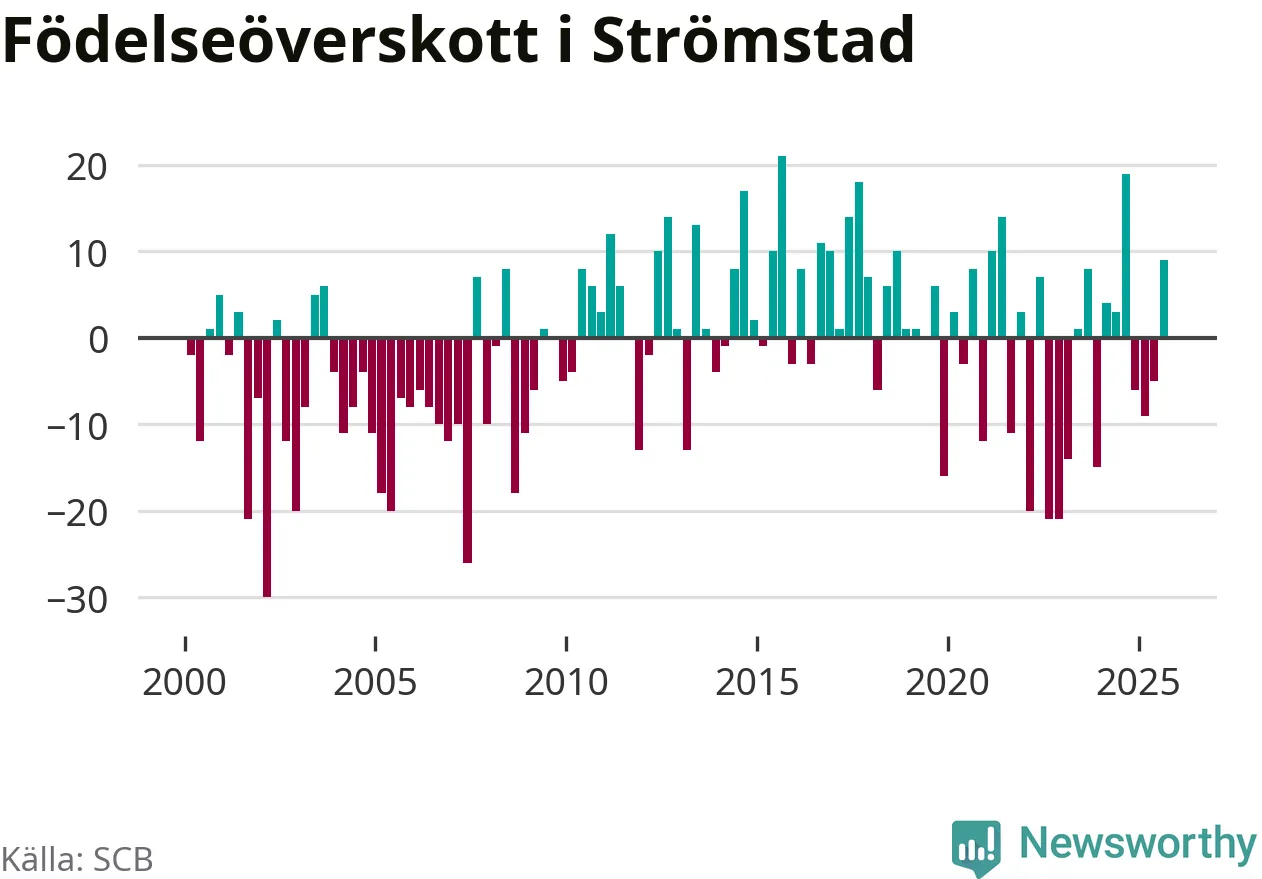 Enligt SCB:s siffror föddes 28 barn i Strömstad under det senaste kvartalet. Samtidigt avled relativt få – 19 personer. Skillnaden mellan antal födda och döda är så liten att det inte går att säga om det beror på något annat än SCB:s röjandeskydd. Kommunen har oftast haft positivt födelsenetto tidigare.