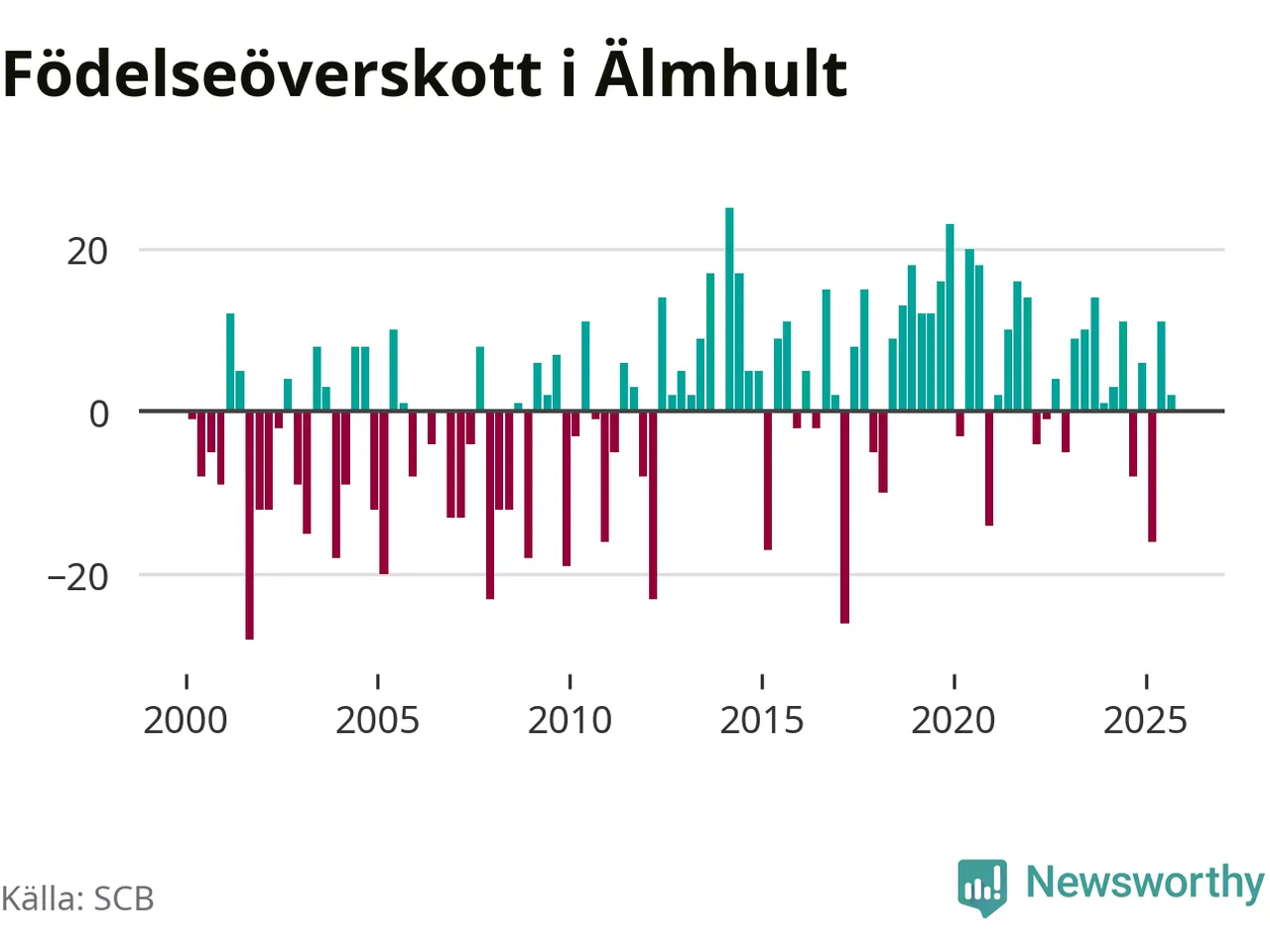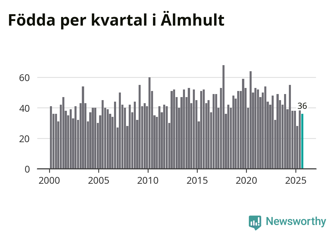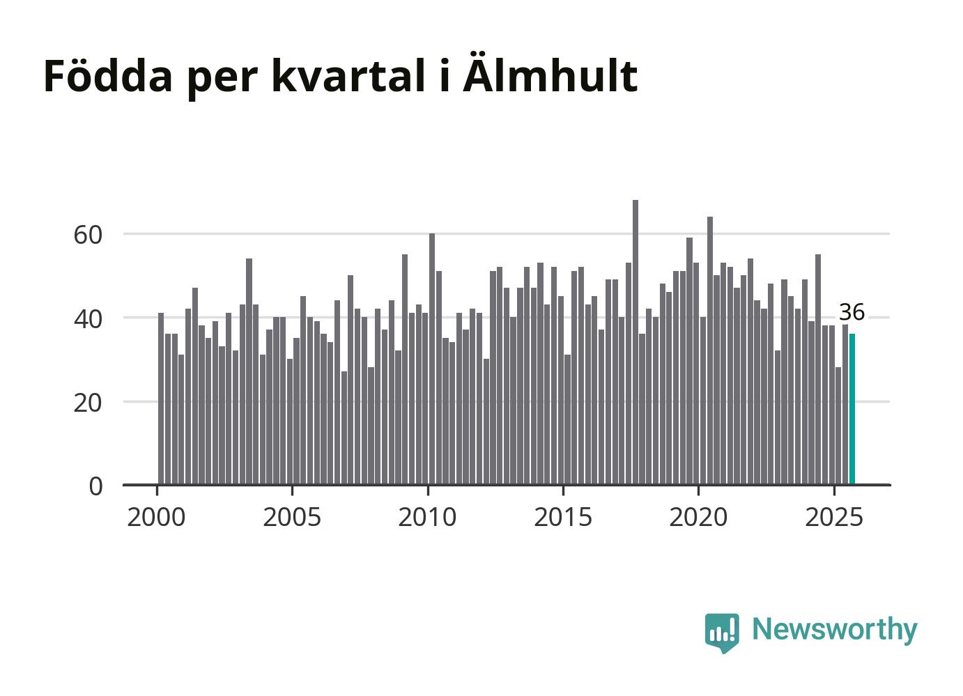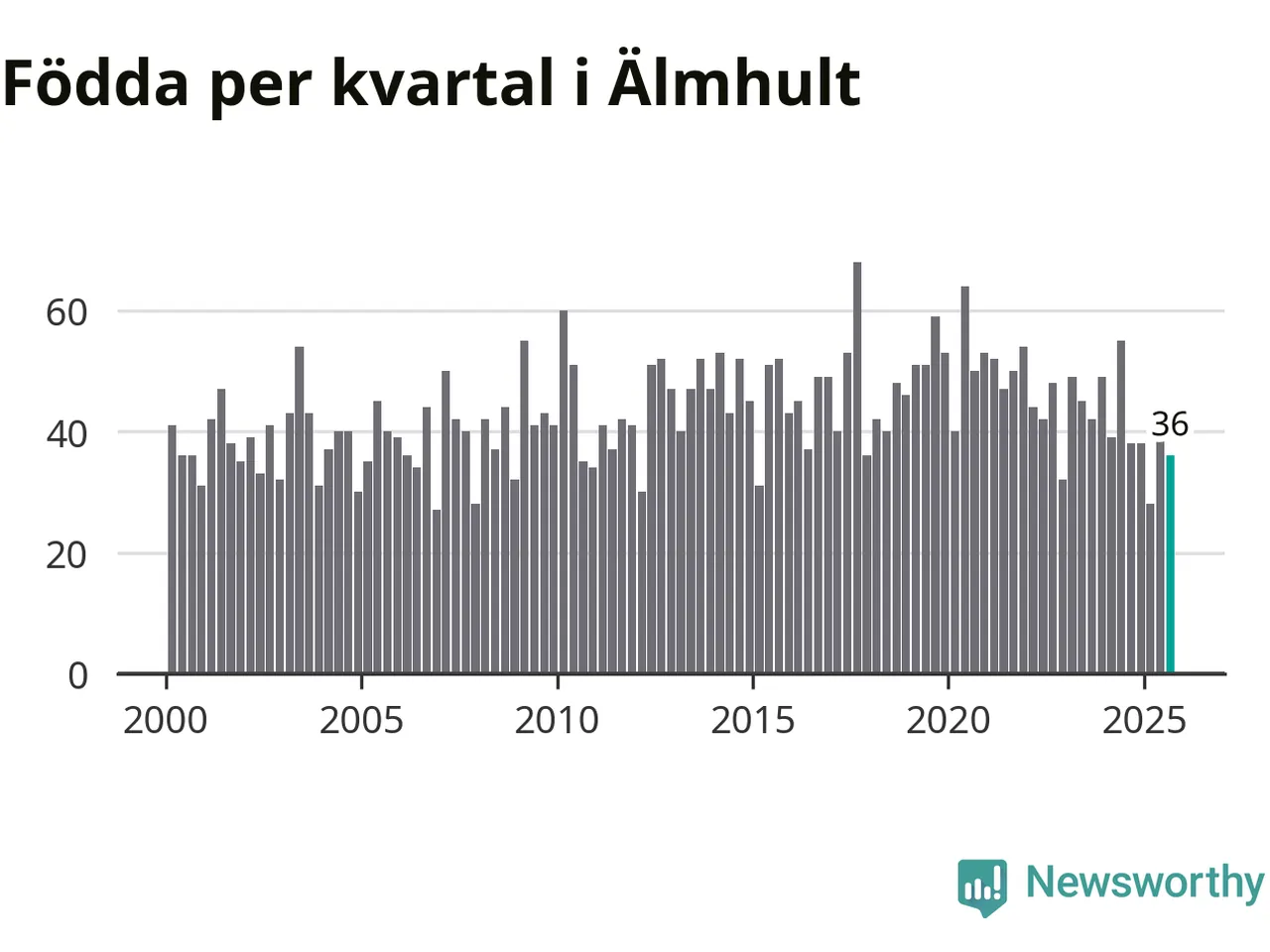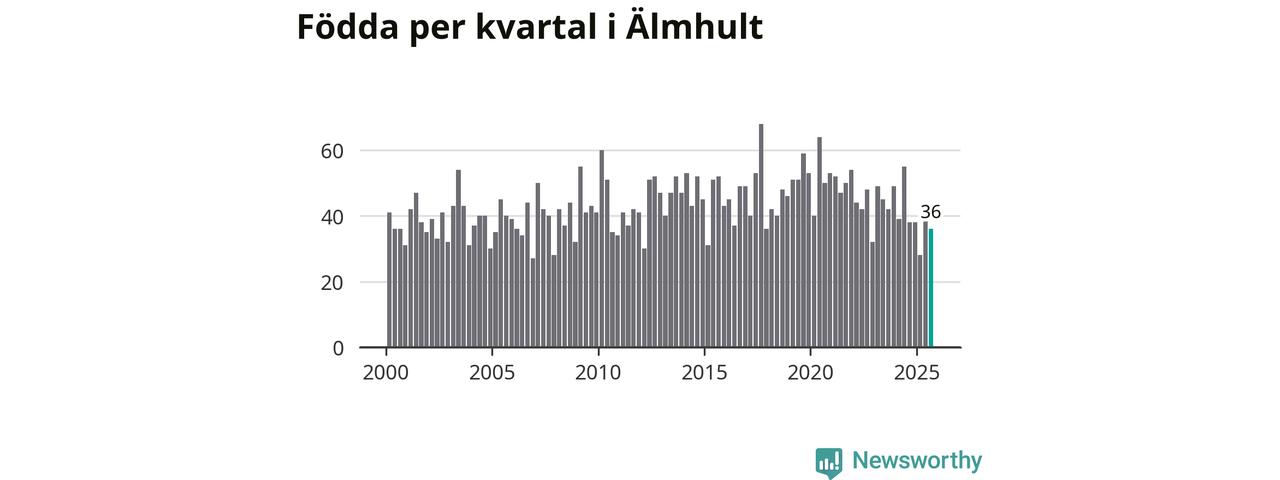 Enligt SCB:s siffror föddes 36 barn i Älmhult under det senaste kvartalet. Samtidigt avled 34 personer. Skillnaden mellan antal födda och döda är så liten att det inte går att säga om det beror på något annat än SCB:s röjandeskydd. Kommunen har oftast haft positivt födelsenetto tidigare.