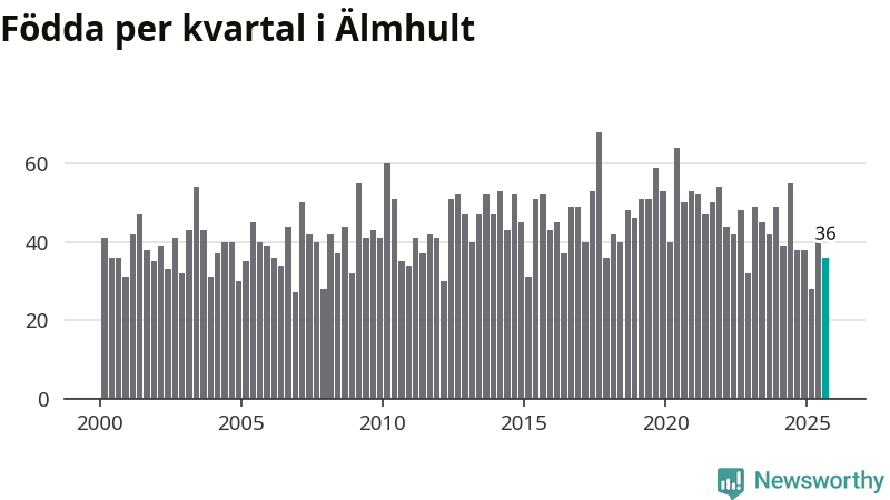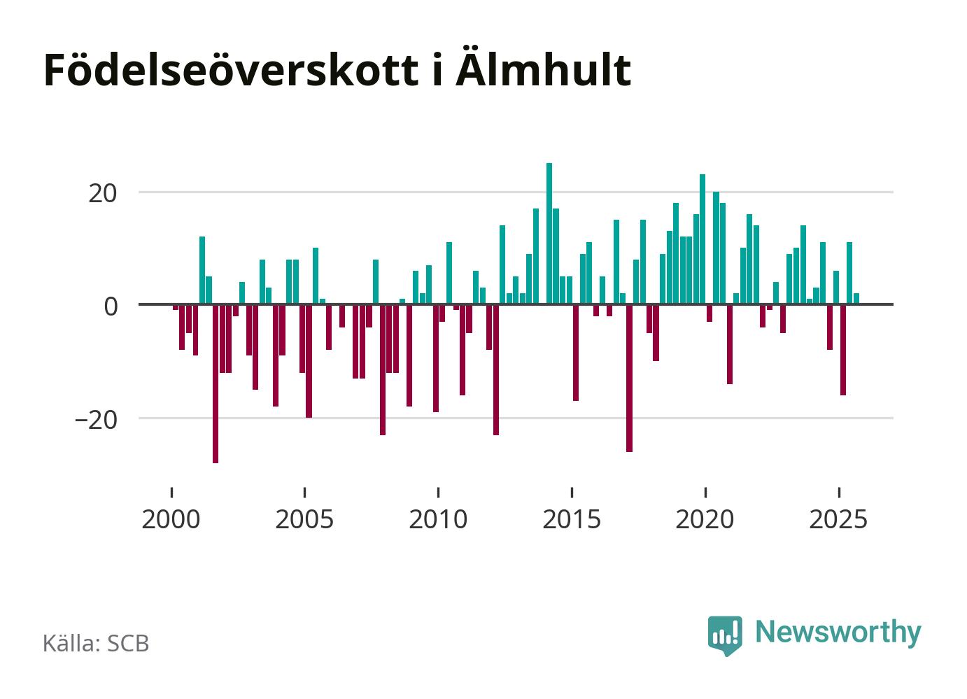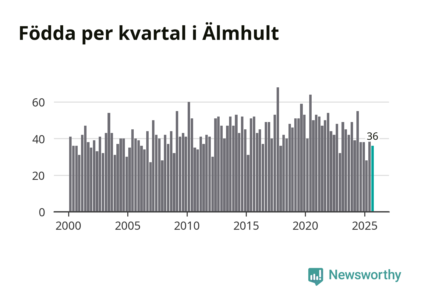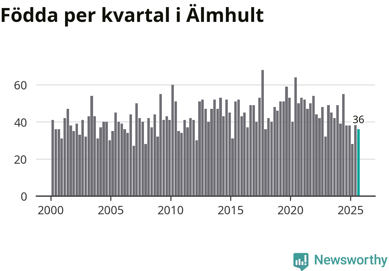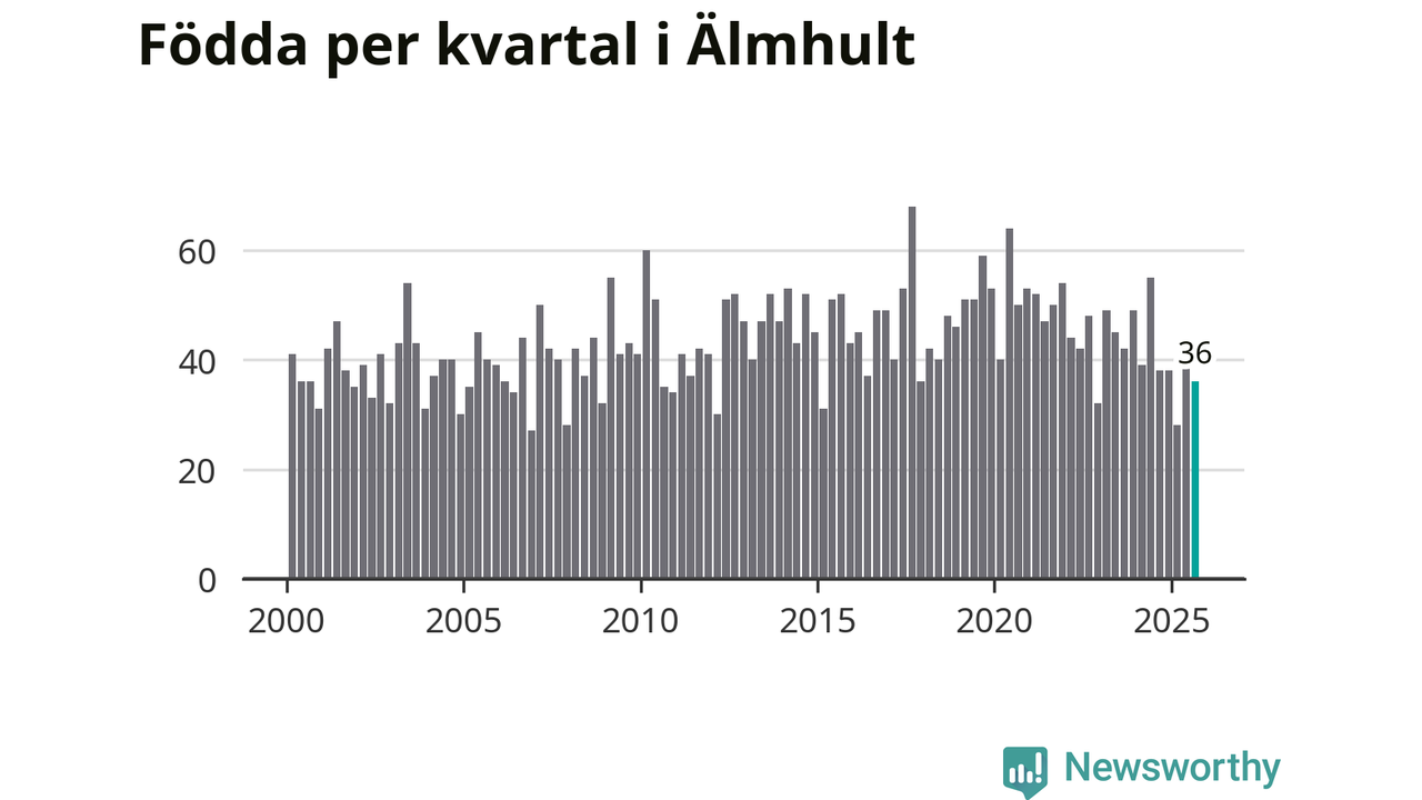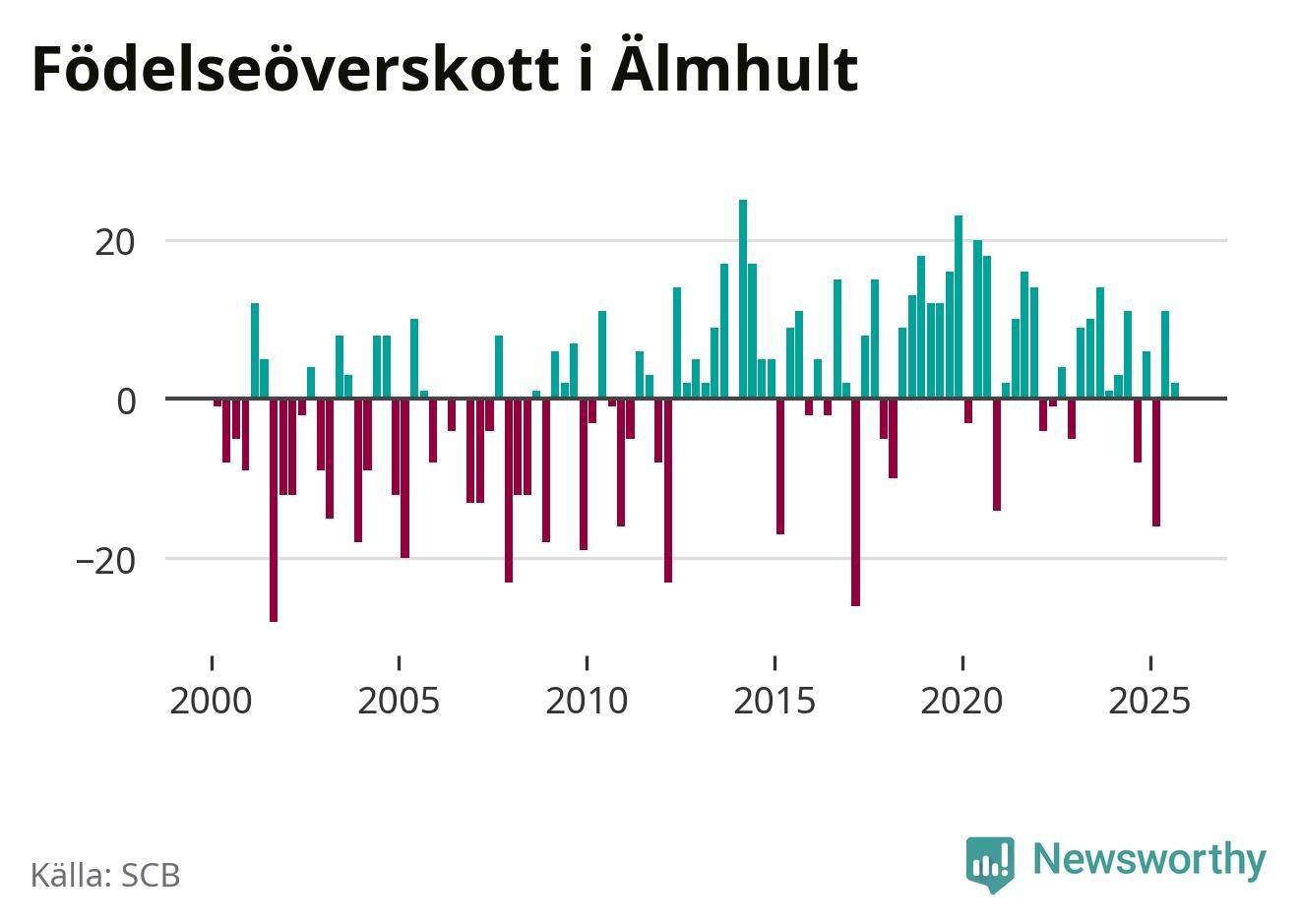 Enligt SCB:s siffror föddes 36 barn i Älmhult under det senaste kvartalet. Samtidigt avled 34 personer. Skillnaden mellan antal födda och döda är så liten att det inte går att säga om det beror på något annat än SCB:s röjandeskydd. Kommunen har oftast haft positivt födelsenetto tidigare.