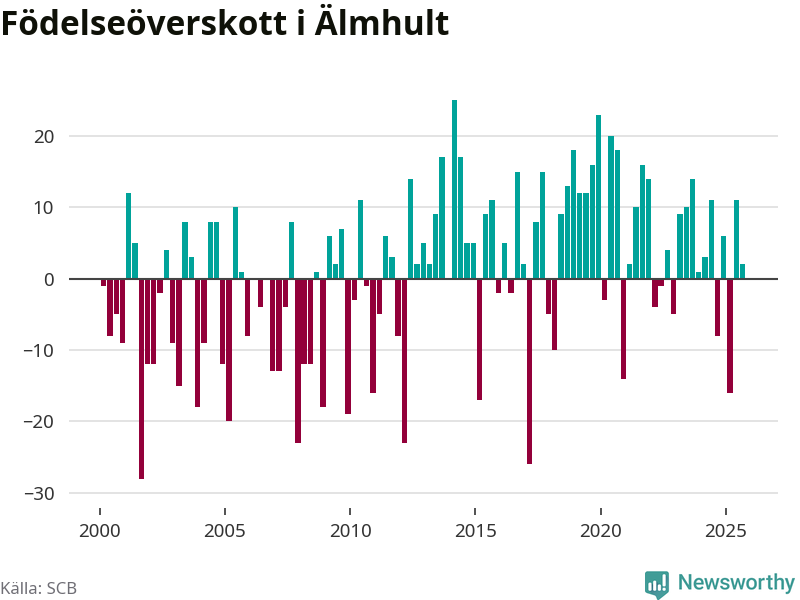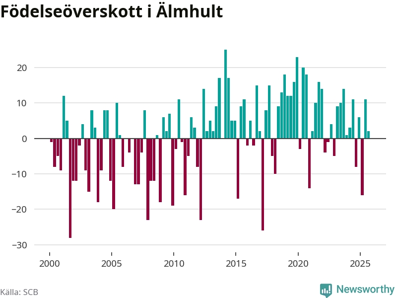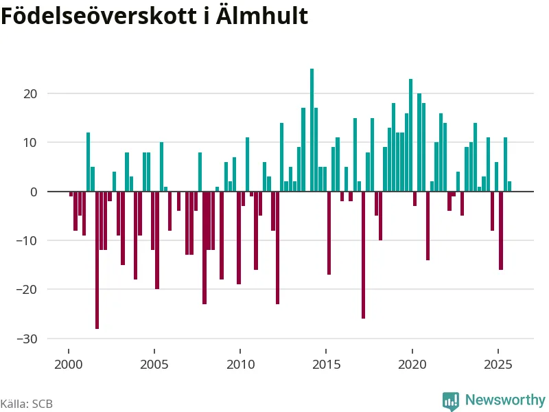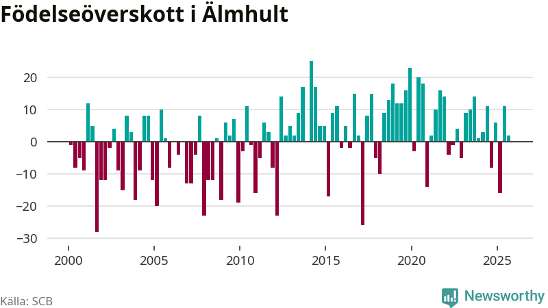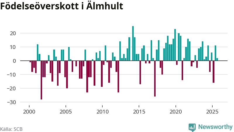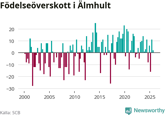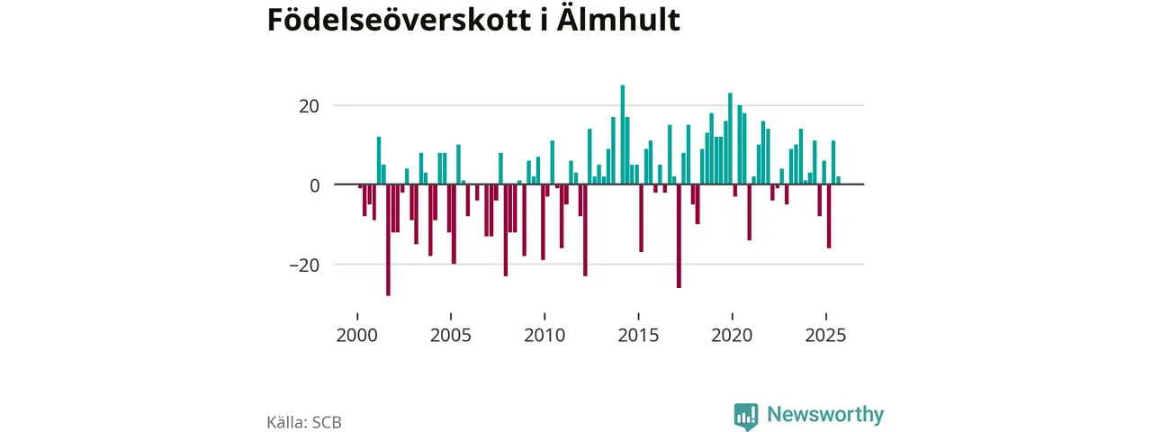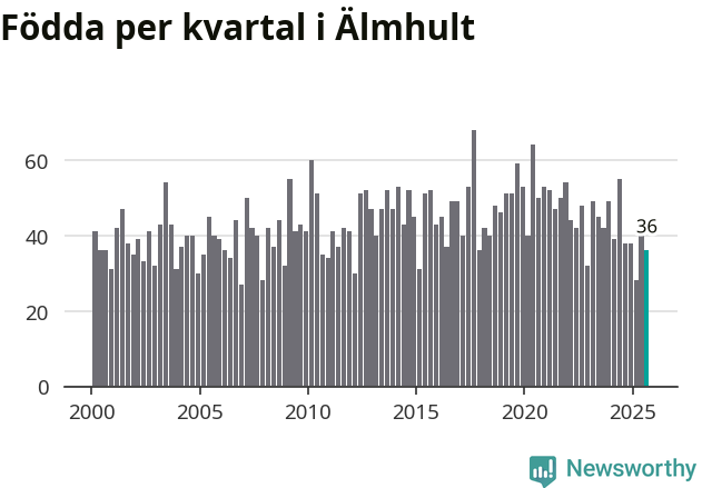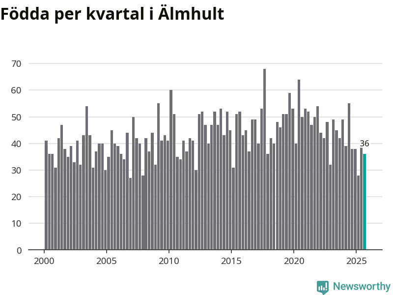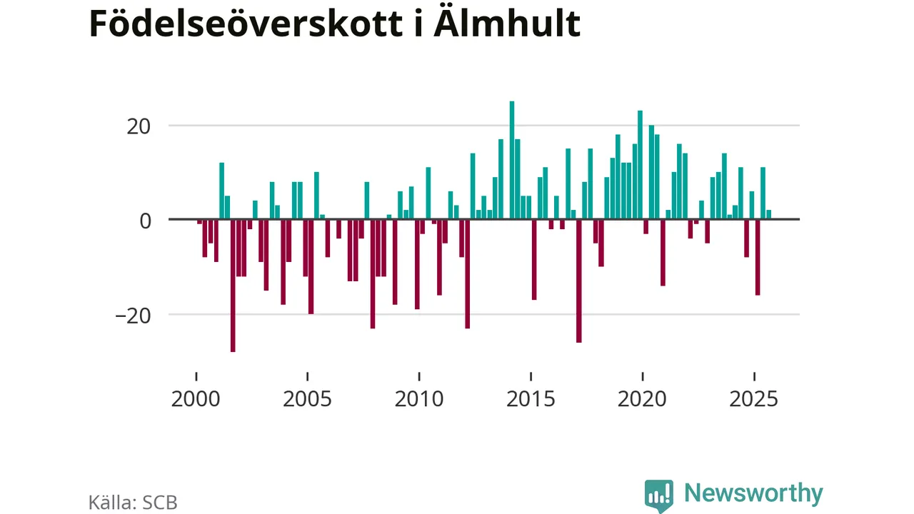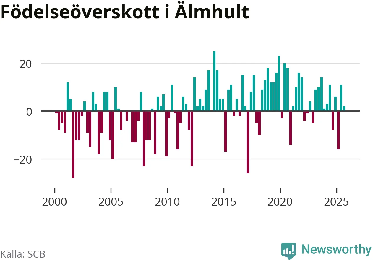Enligt SCB:s siffror föddes 36 barn i Älmhult under det senaste kvartalet. Samtidigt avled 34 personer. Skillnaden mellan antal födda och döda är så liten att det inte går att säga om det beror på något annat än SCB:s röjandeskydd. Kommunen har oftast haft positivt födelsenetto tidigare.