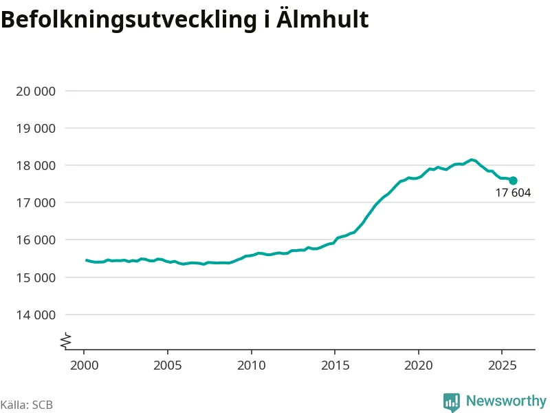 Jämfört med för ett år sedan har befolkningen i Älmhult minskat med knappt 130 personer – vilket motsvarar en nedgång på 0,7 procent. Sedan millennieskiftet har folkmängden ökat med runt 2 160 personer, eller 14 procent.