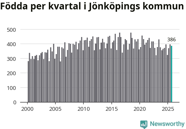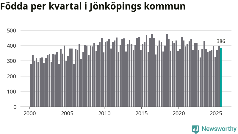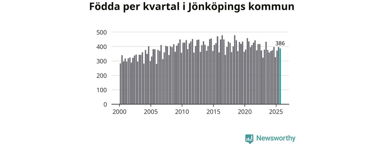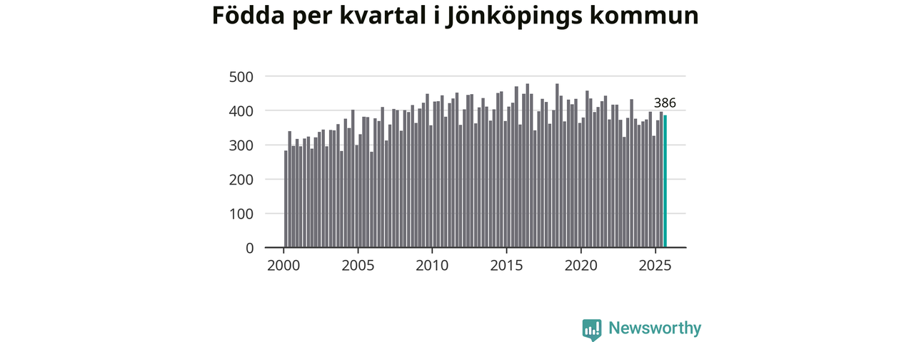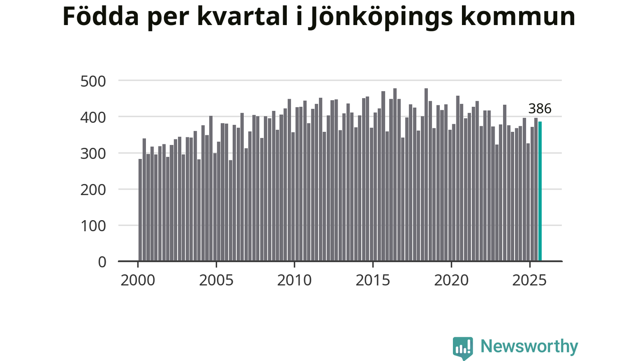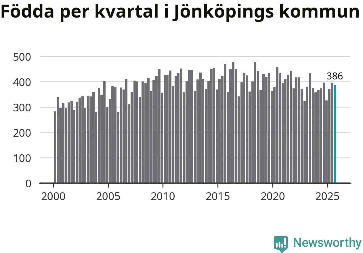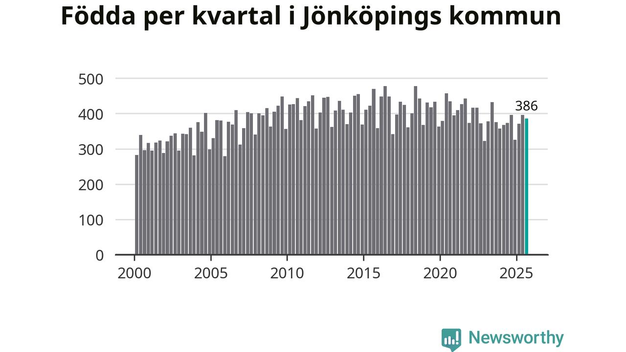 Enligt SCB:s siffror föddes 386 barn i Jönköpings kommun under det senaste kvartalet. Samtidigt avled relativt få – 248 personer. Jönköping hade alltså ett positivt födelsenetto, vilket kommunen historiskt sett i princip alltid har haft.