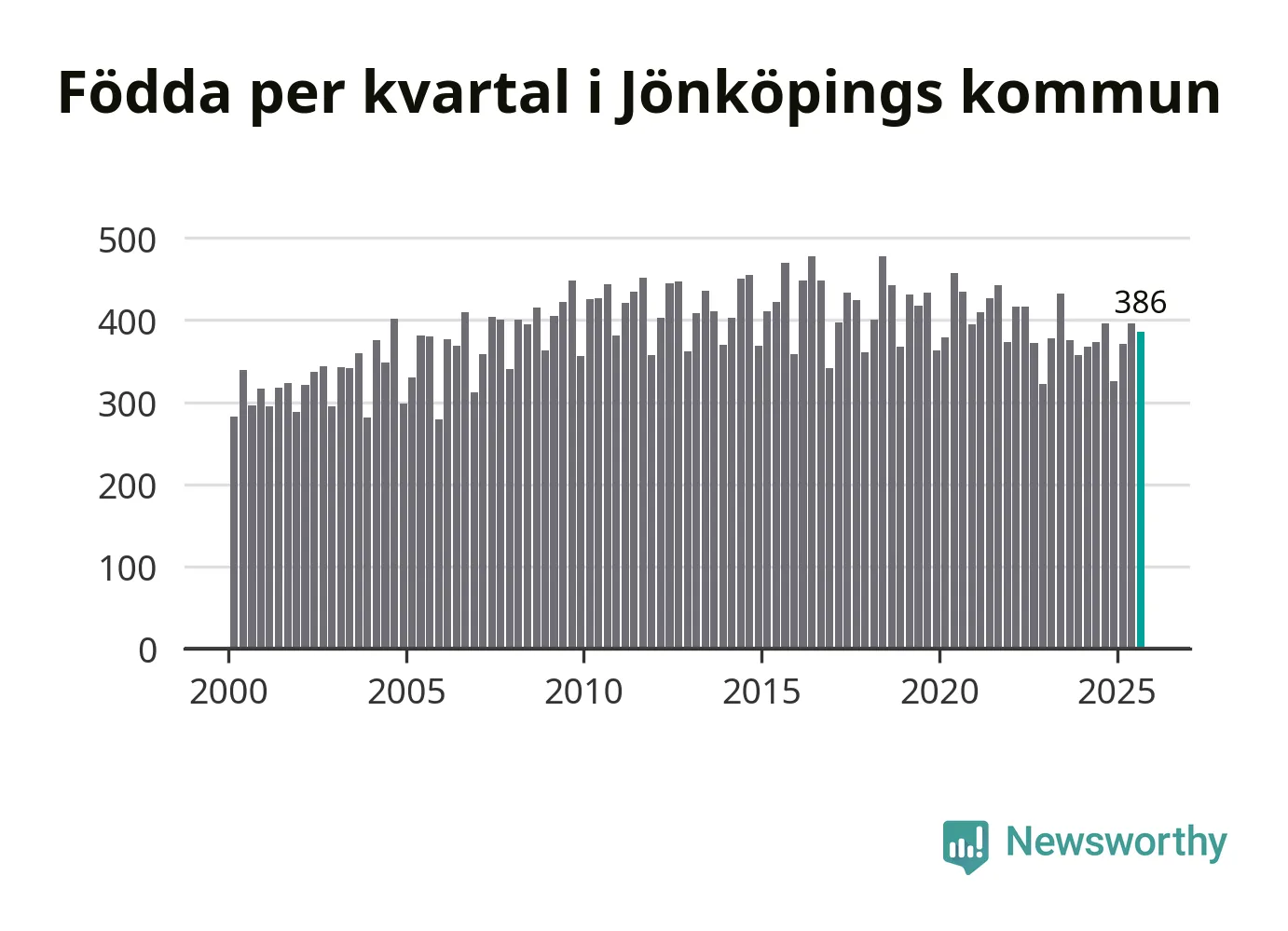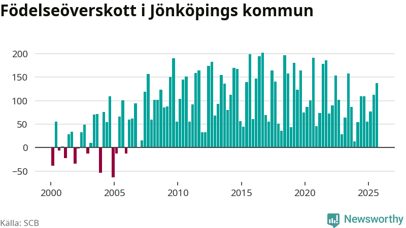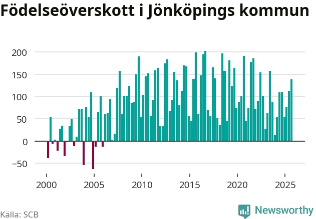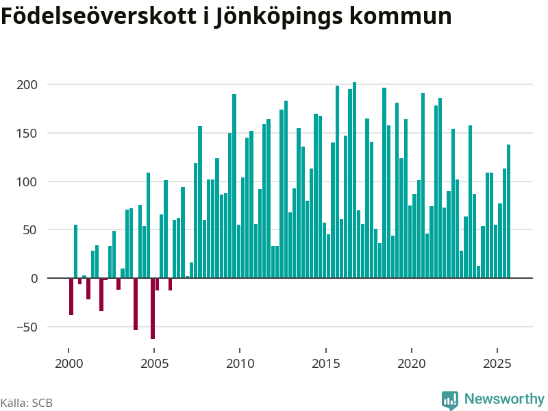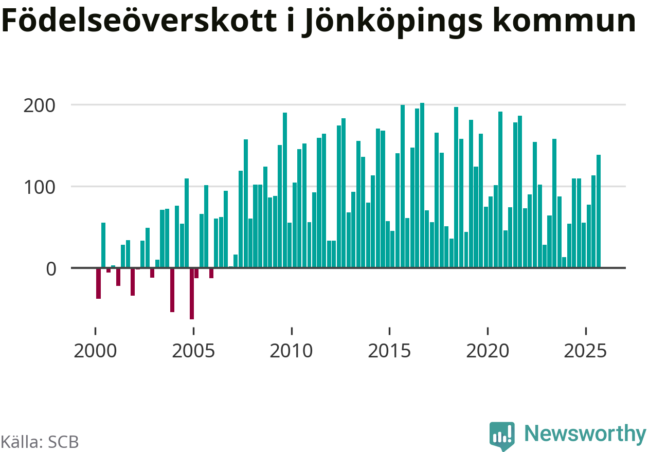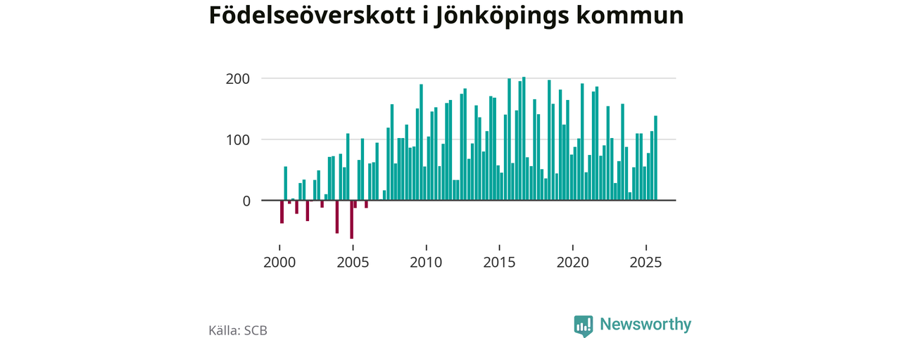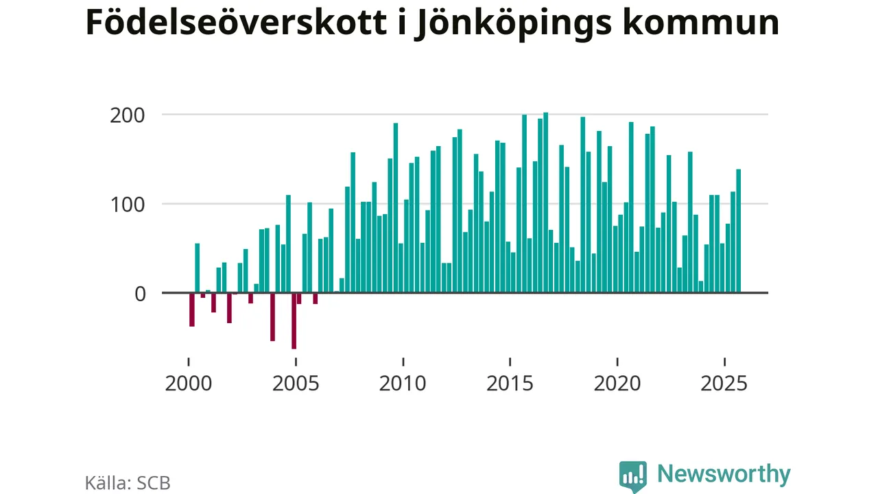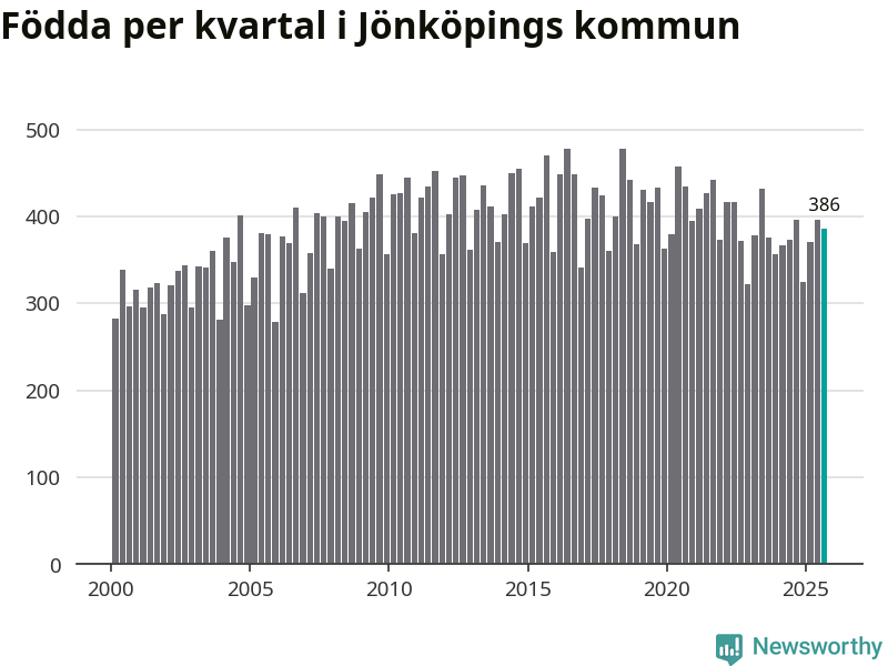 Enligt SCB:s siffror föddes 386 barn i Jönköpings kommun under det senaste kvartalet. Samtidigt avled relativt få – 248 personer. Jönköping hade alltså ett positivt födelsenetto, vilket kommunen historiskt sett i princip alltid har haft.