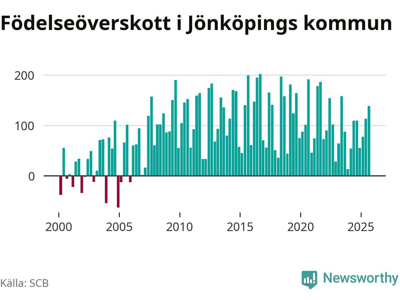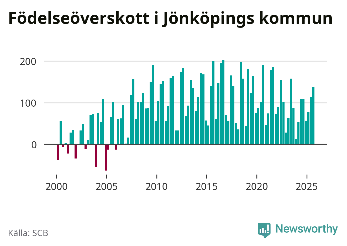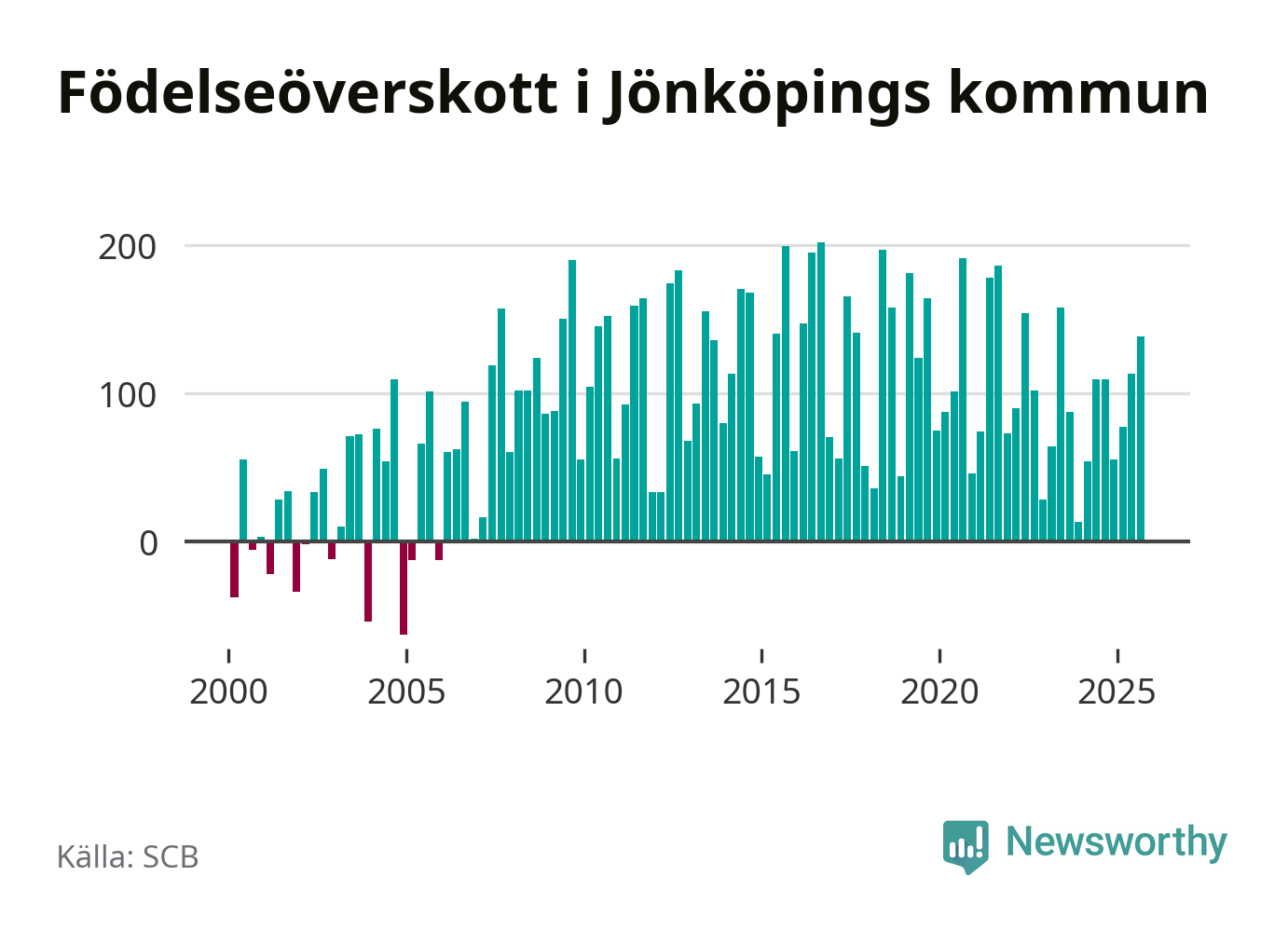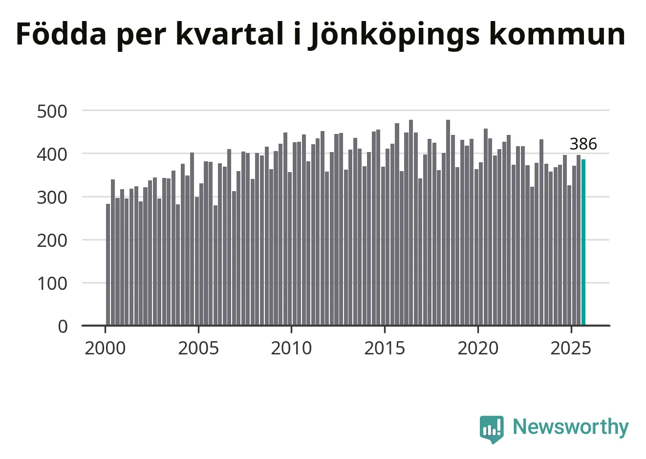 Enligt SCB:s siffror föddes 386 barn i Jönköpings kommun under det senaste kvartalet. Samtidigt avled relativt få – 248 personer. Jönköping hade alltså ett positivt födelsenetto, vilket kommunen historiskt sett i princip alltid har haft.