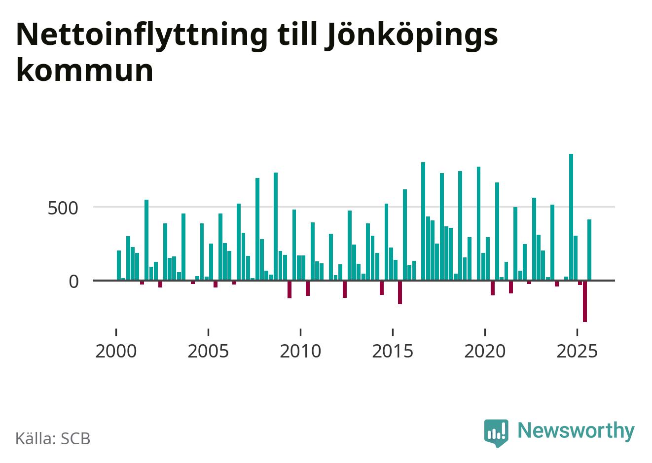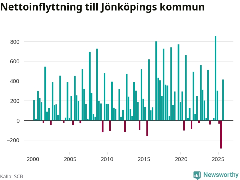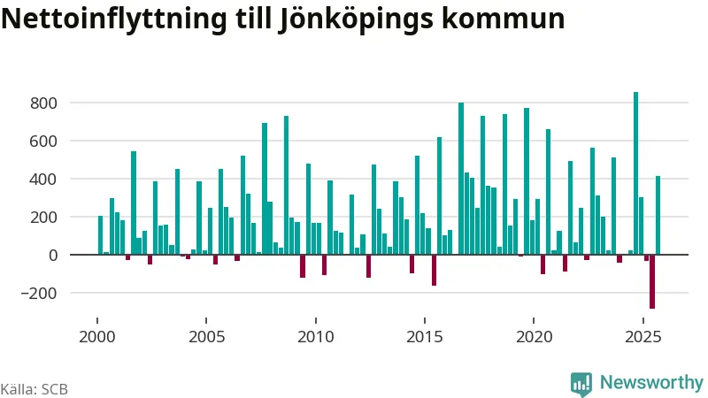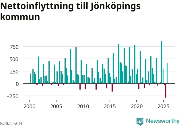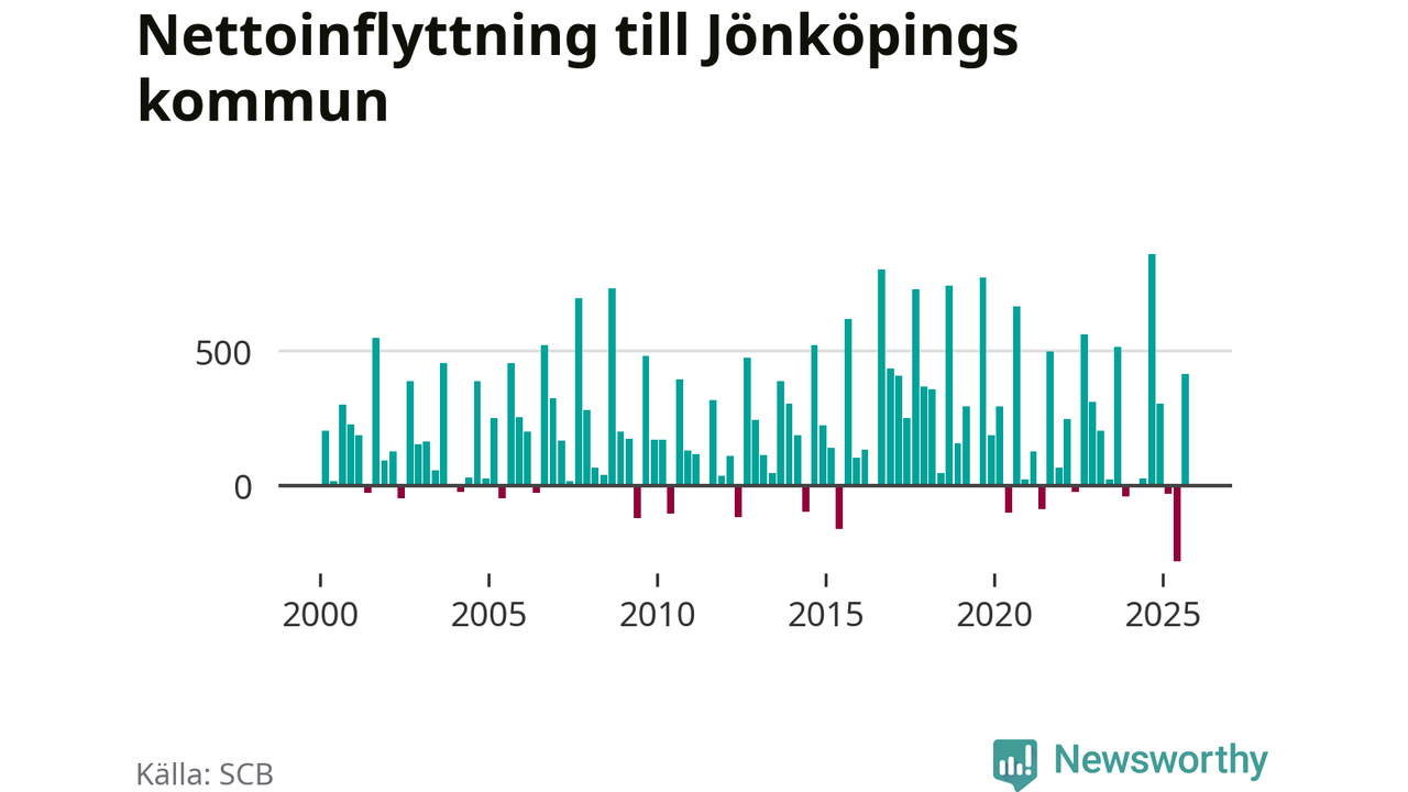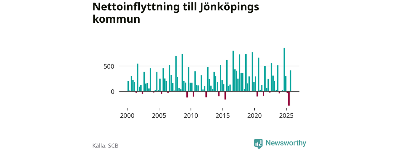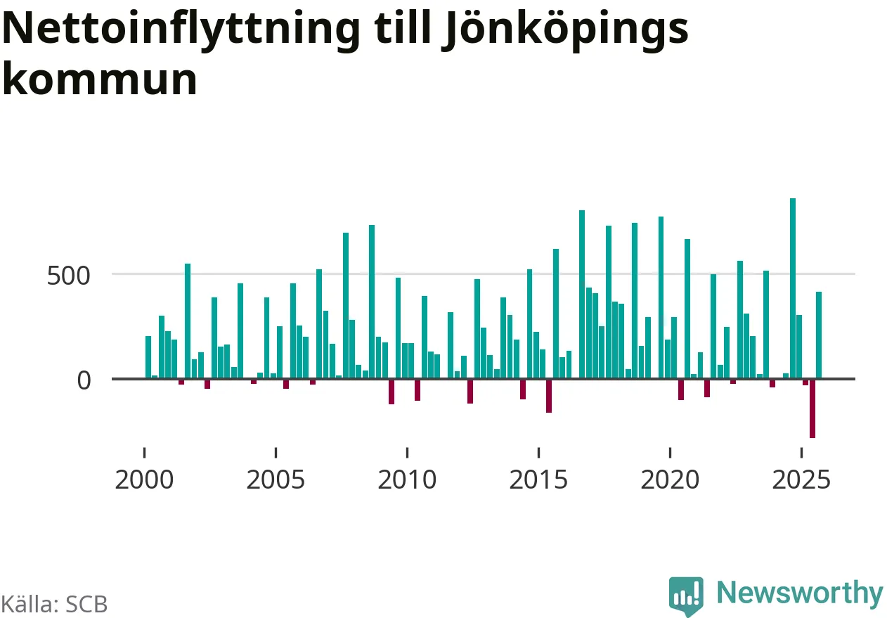 Under tredje kvartalet 2025 flyttade 2 825 personer till kommunen medan 2 411 personer flyttade därifrån. Det är historiskt sett en stor inflyttning under ett kvartal – men samtidigt var utflyttningen den största hittills. Sedan seklets början har Jönköpings kommun oftast haft ett positivt flyttnetto, inklusive det senaste kvartalet.