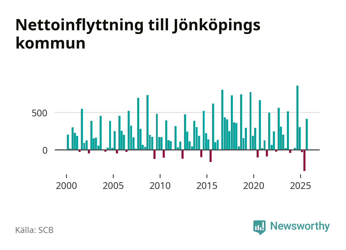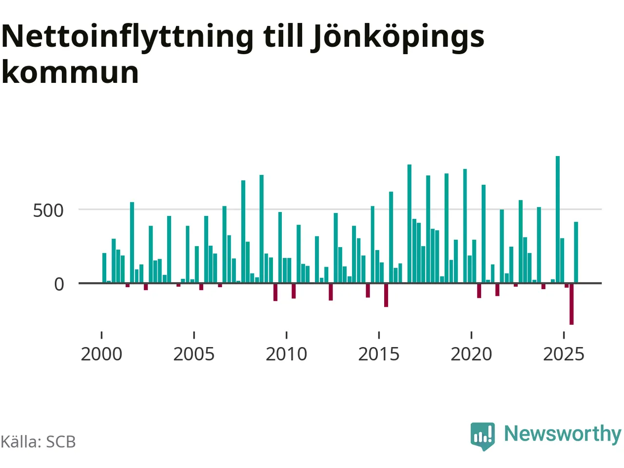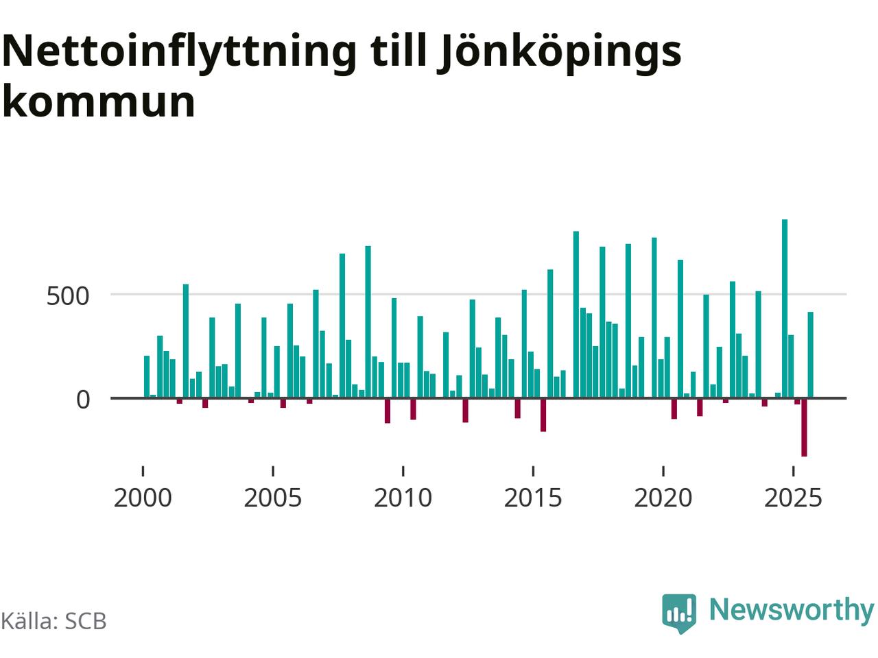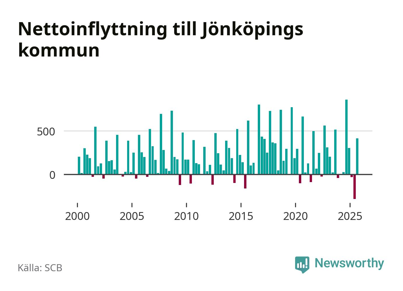 Under tredje kvartalet 2025 flyttade 2 825 personer till kommunen medan 2 411 personer flyttade därifrån. Det är historiskt sett en stor inflyttning under ett kvartal – men samtidigt var utflyttningen den största hittills. Sedan seklets början har Jönköpings kommun oftast haft ett positivt flyttnetto, inklusive det senaste kvartalet.