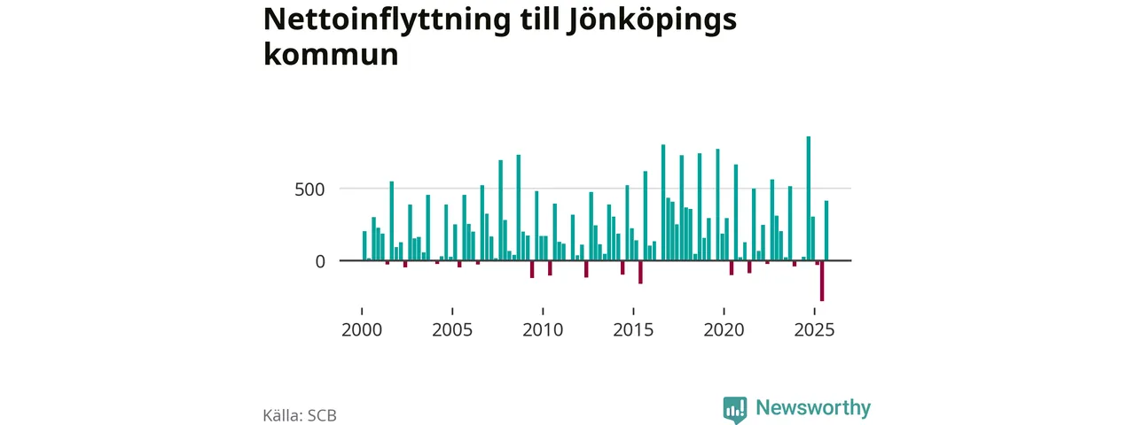2 411 personer flyttade från Jönköpings kommun under det tredje kvartalet 2025. Det är ovanligt många, visar SCB:s senaste befolkningssiffror.