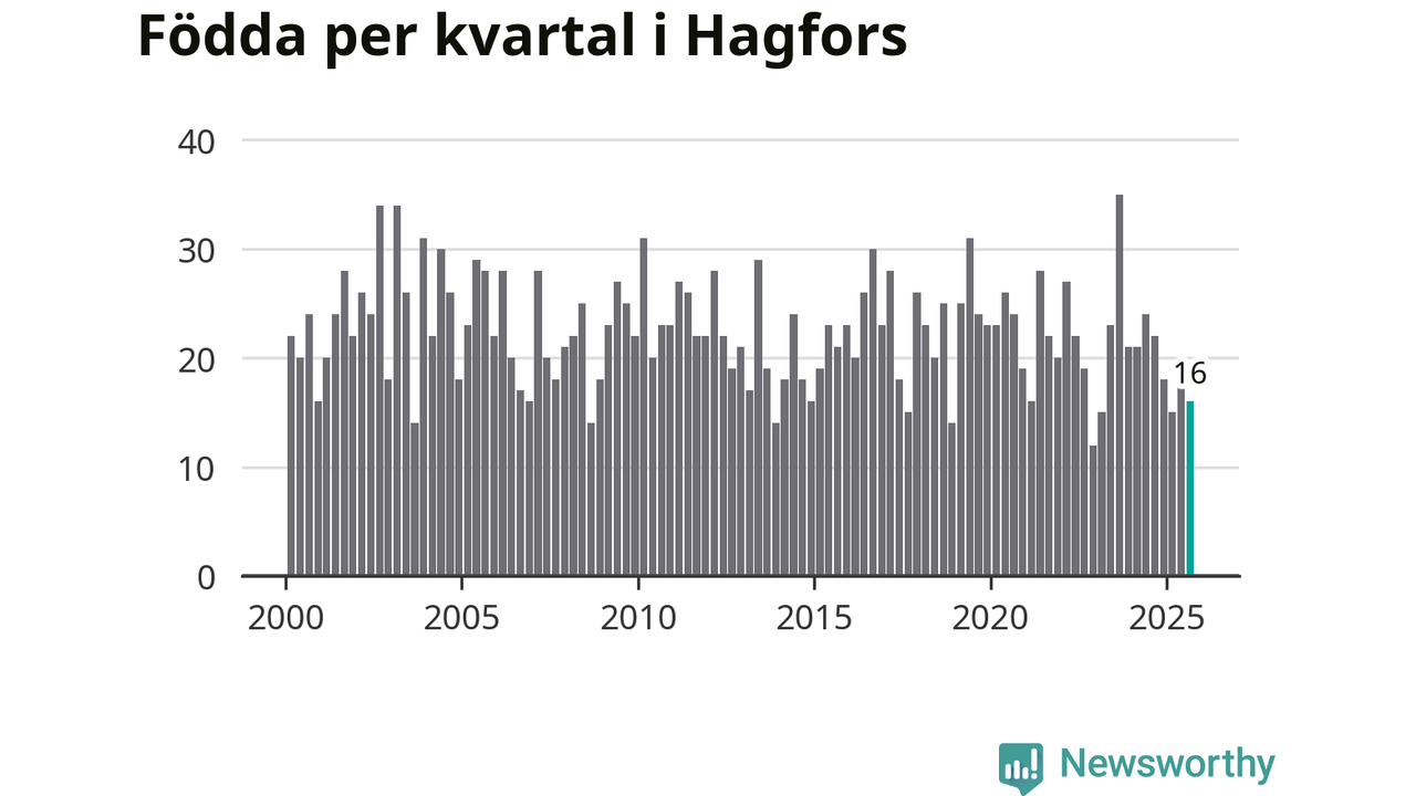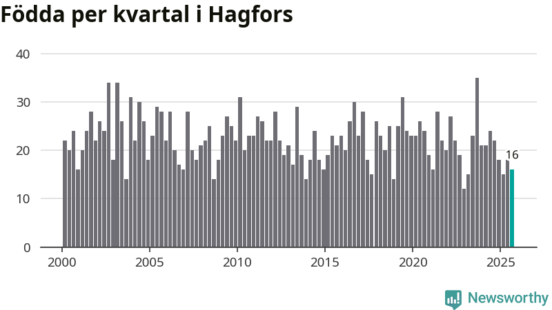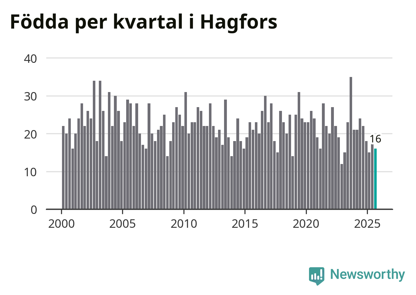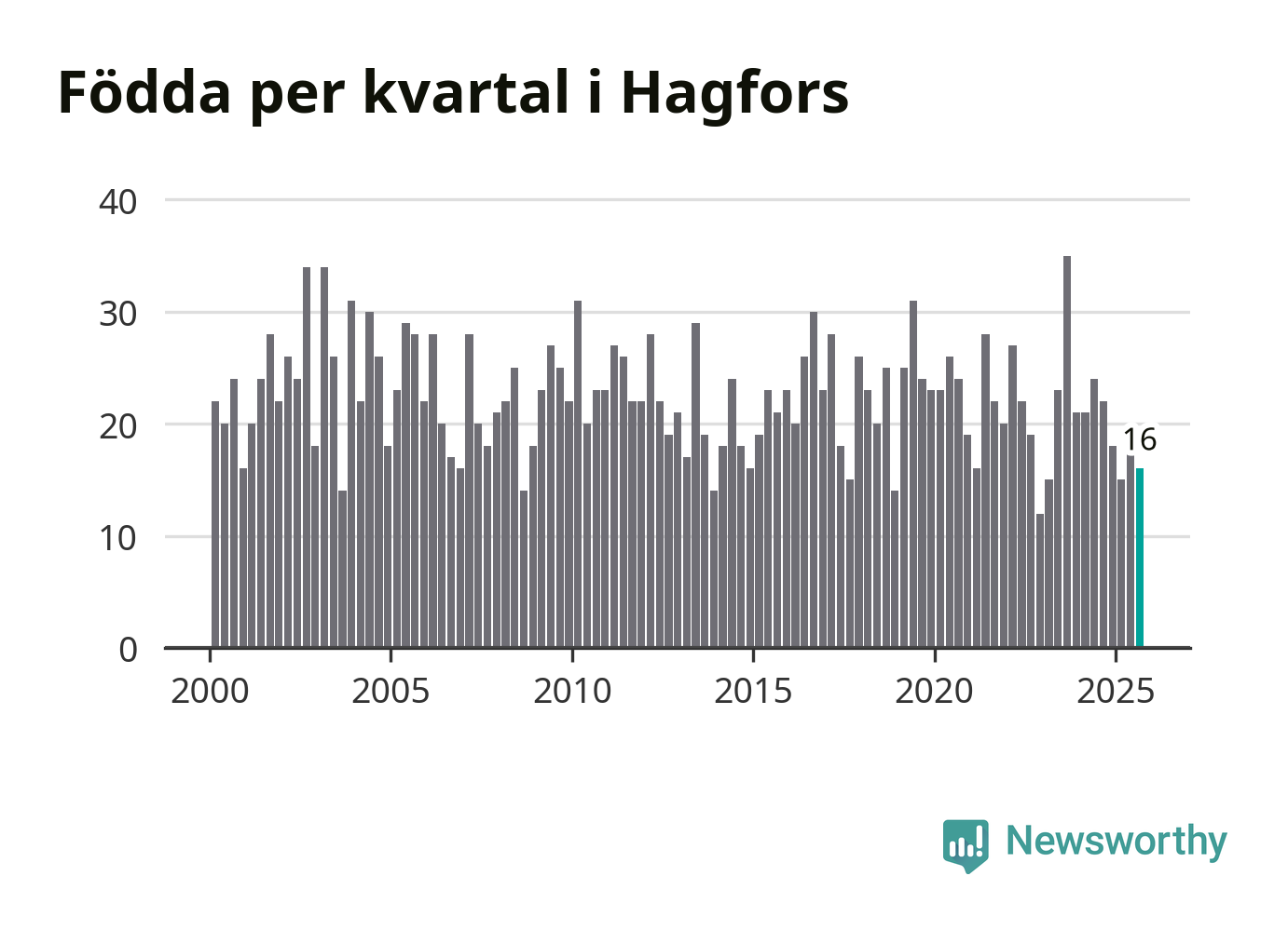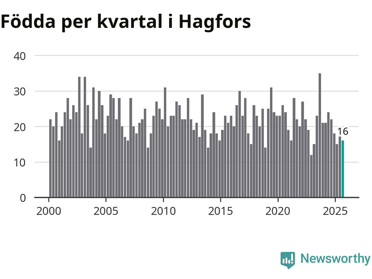 Enligt SCB:s siffror föddes 16 barn i Hagfors under det senaste kvartalet. Samtidigt avled 41 personer. Hagfors hade alltså ett negativt födelsenetto, vilket kommunen historiskt sett i princip alltid har haft.