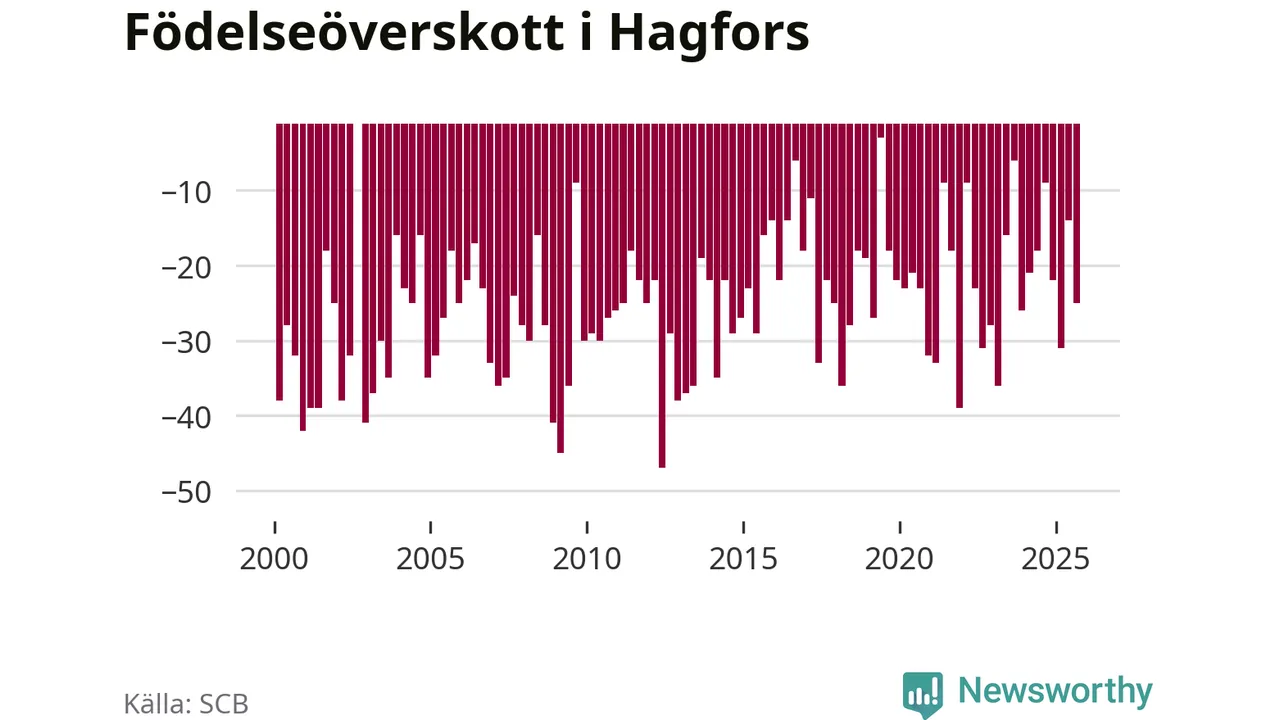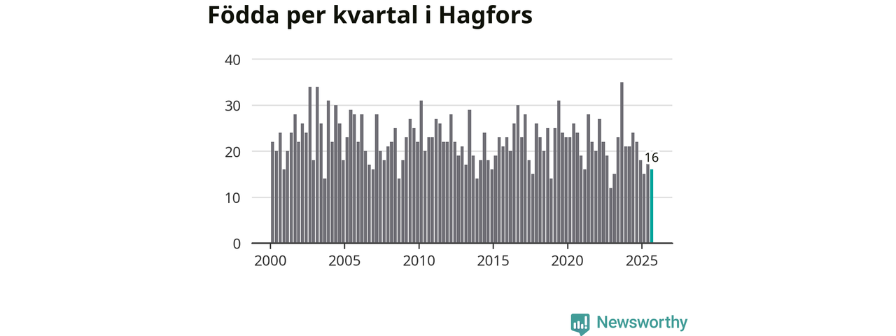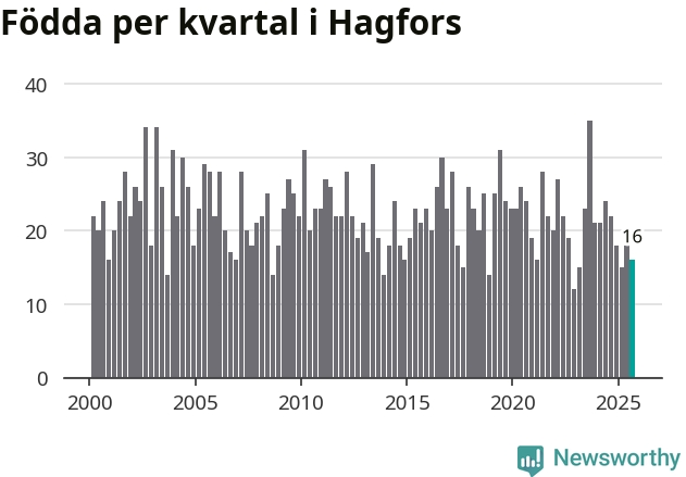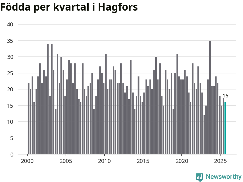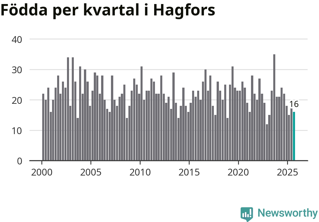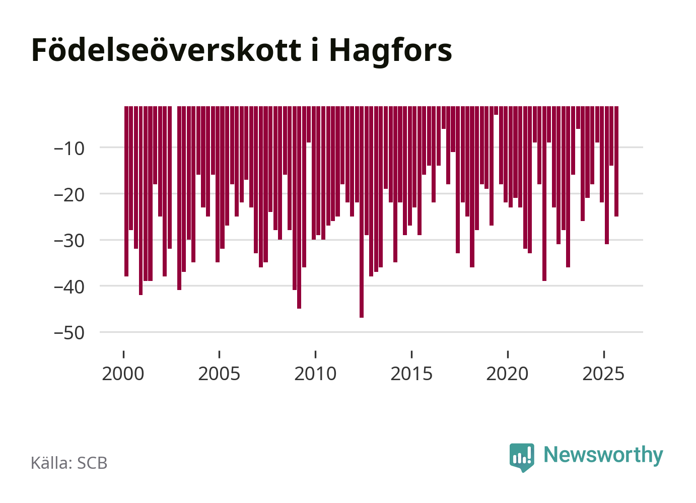Enligt SCB:s siffror föddes 16 barn i Hagfors under det senaste kvartalet. Samtidigt avled 41 personer. Hagfors hade alltså ett negativt födelsenetto, vilket kommunen historiskt sett i princip alltid har haft.