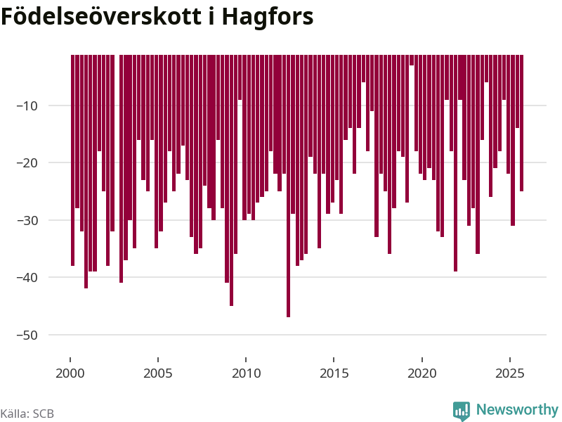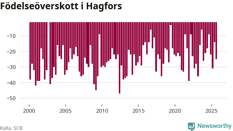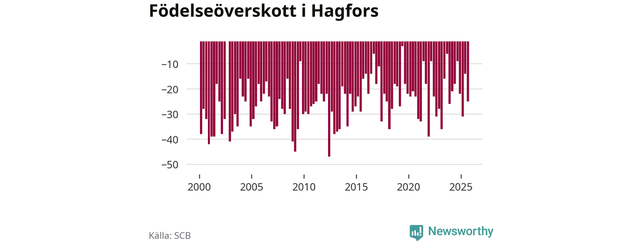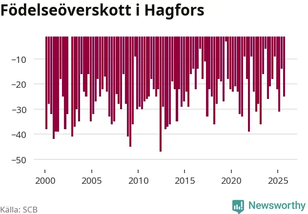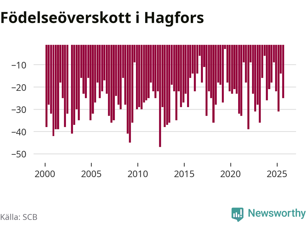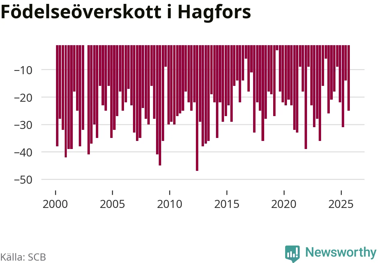 Enligt SCB:s siffror föddes 16 barn i Hagfors under det senaste kvartalet. Samtidigt avled 41 personer. Hagfors hade alltså ett negativt födelsenetto, vilket kommunen historiskt sett i princip alltid har haft.