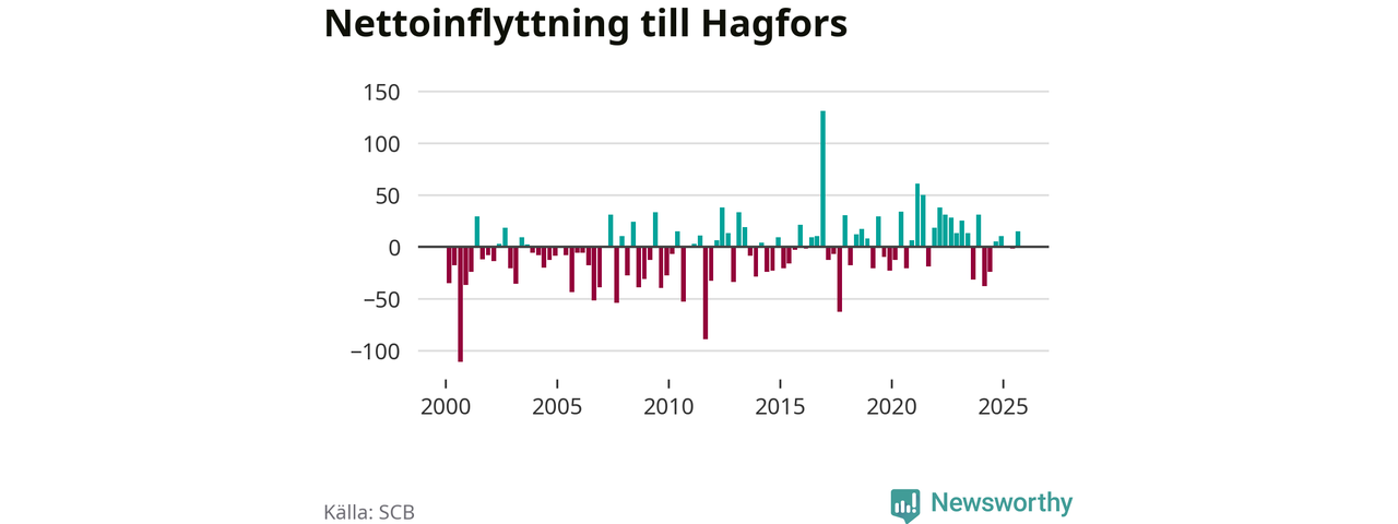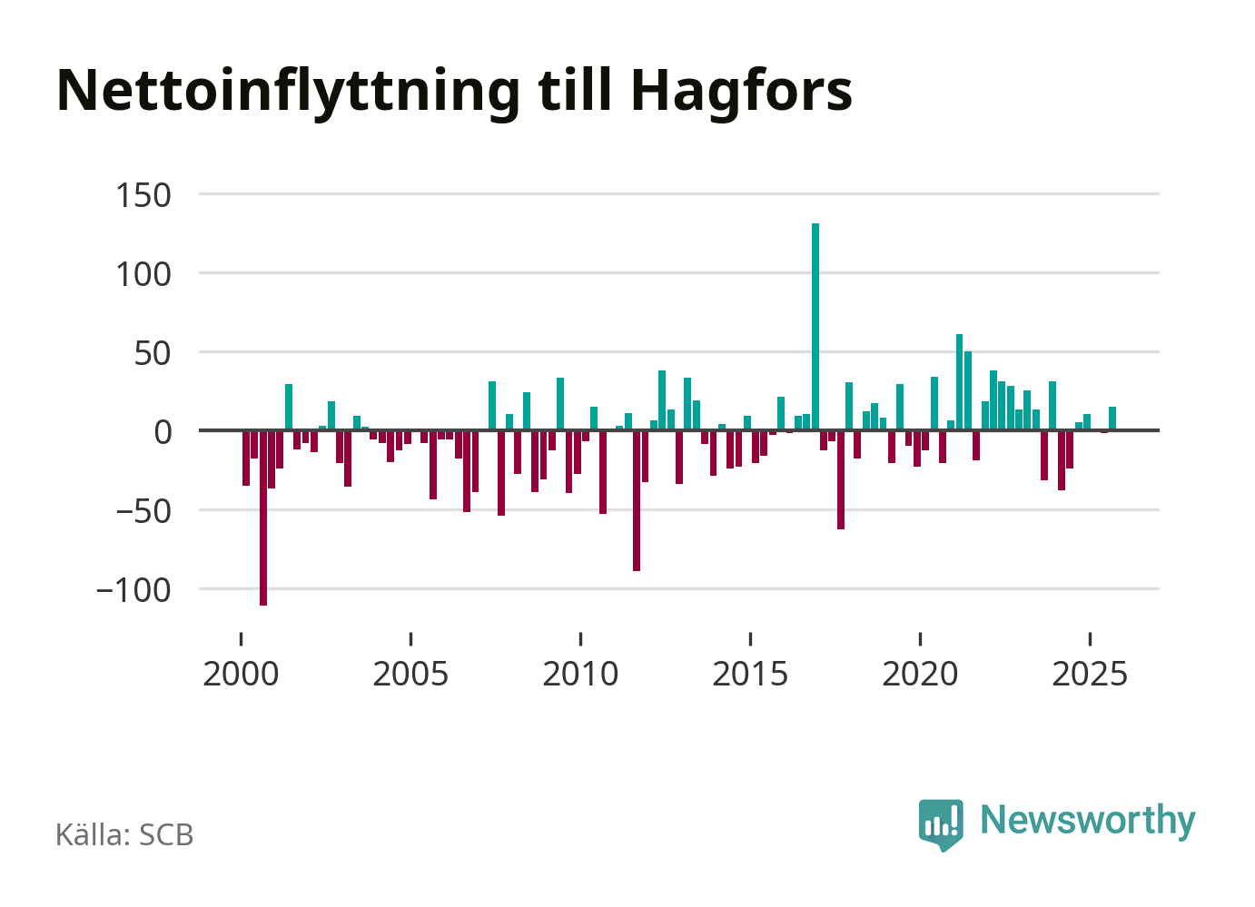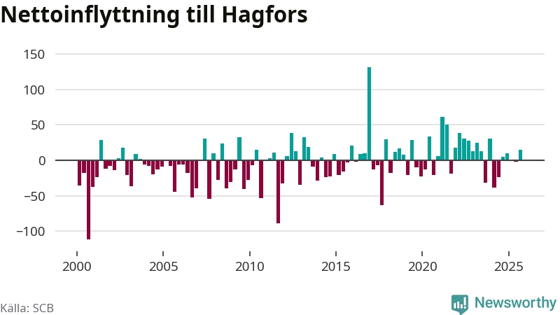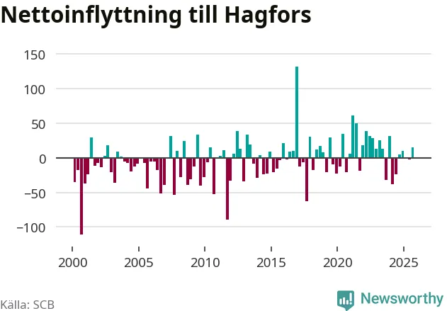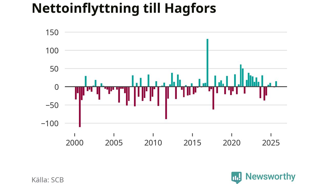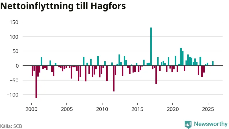 Under tredje kvartalet 2025 flyttade 152 personer till kommunen medan 137 personer flyttade därifrån. Sedan seklets början har Hagfors oftast haft ett positivt flyttnetto, inklusive det senaste kvartalet.