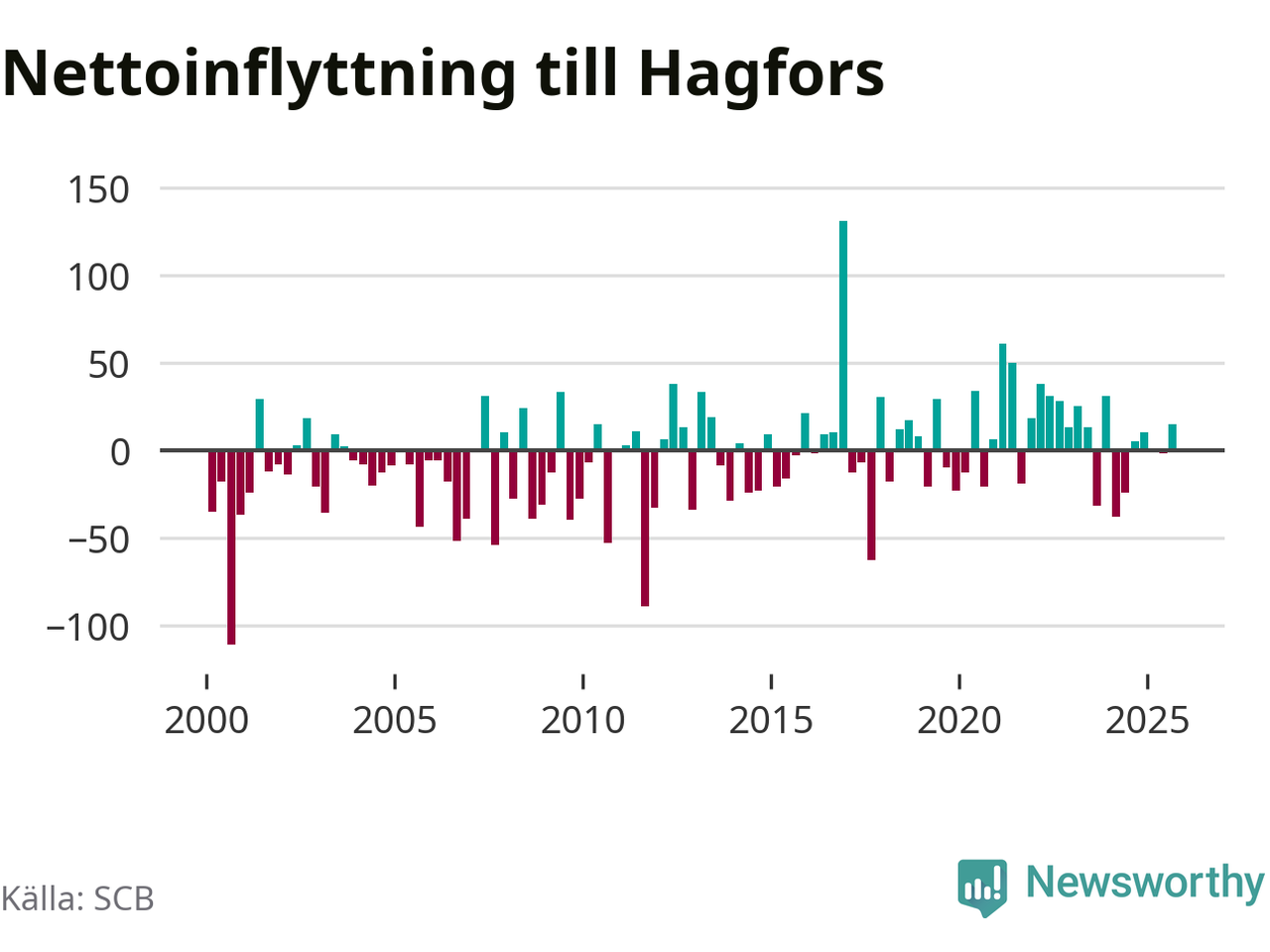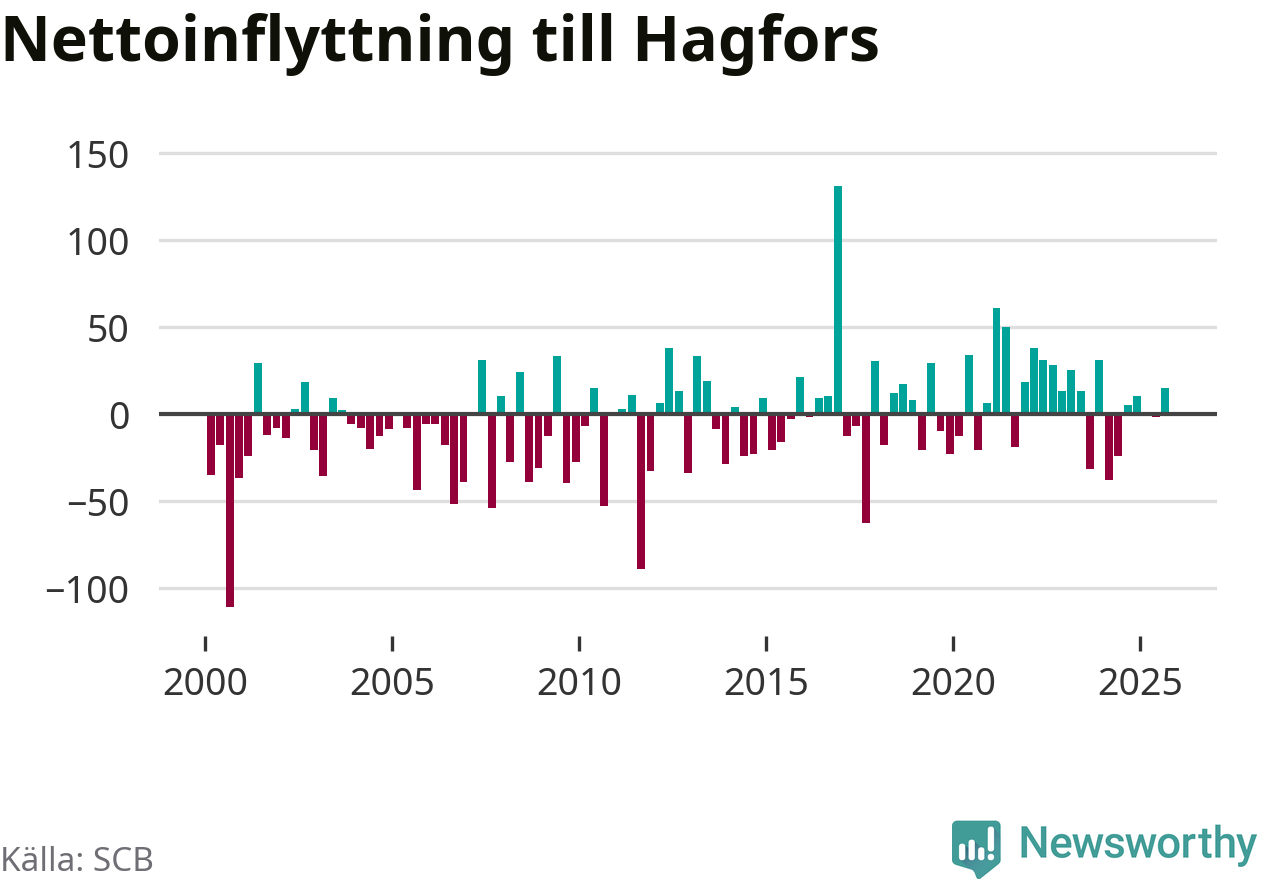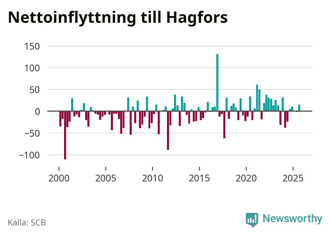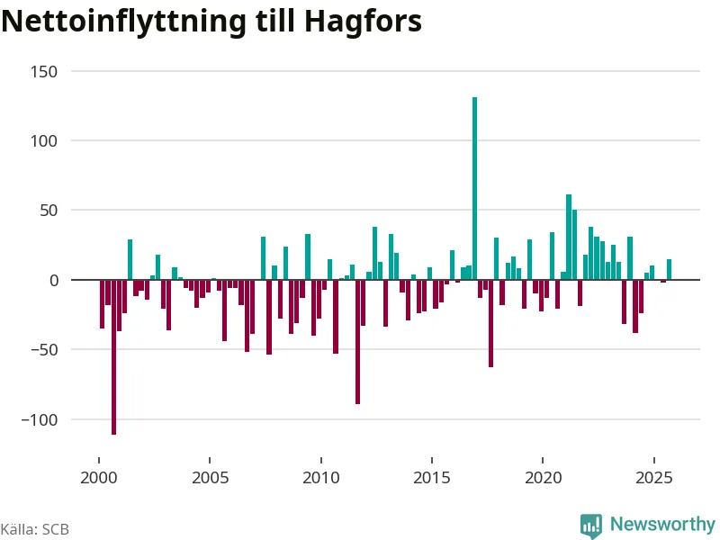 Under tredje kvartalet 2025 flyttade 152 personer till kommunen medan 137 personer flyttade därifrån. Sedan seklets början har Hagfors oftast haft ett positivt flyttnetto, inklusive det senaste kvartalet.