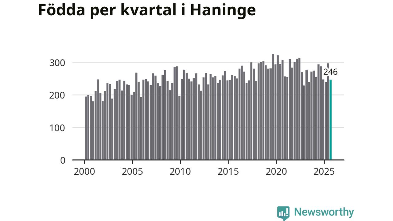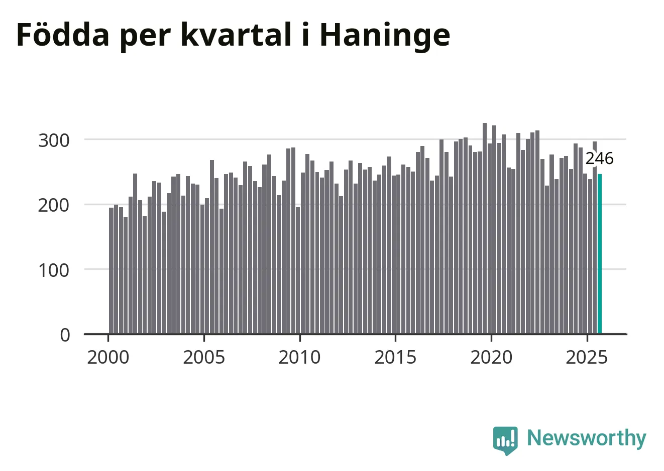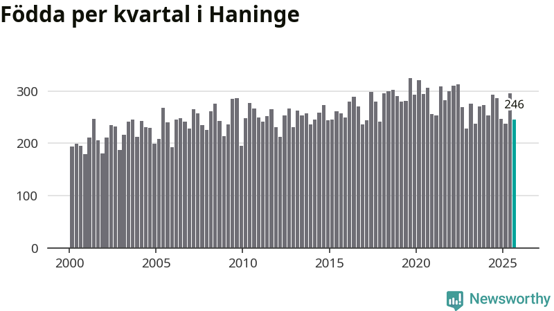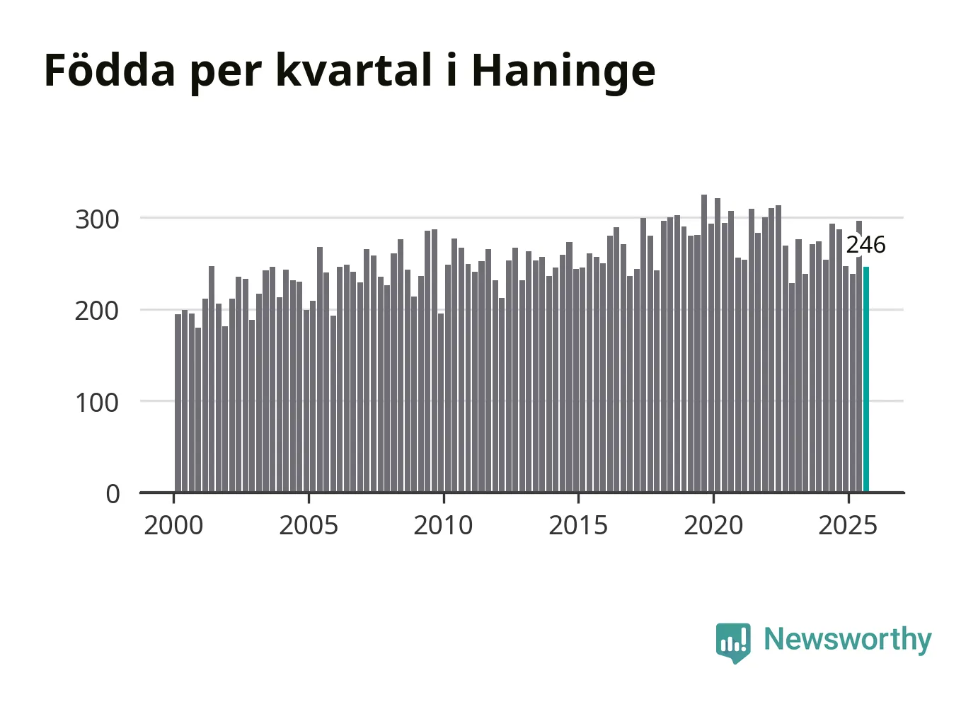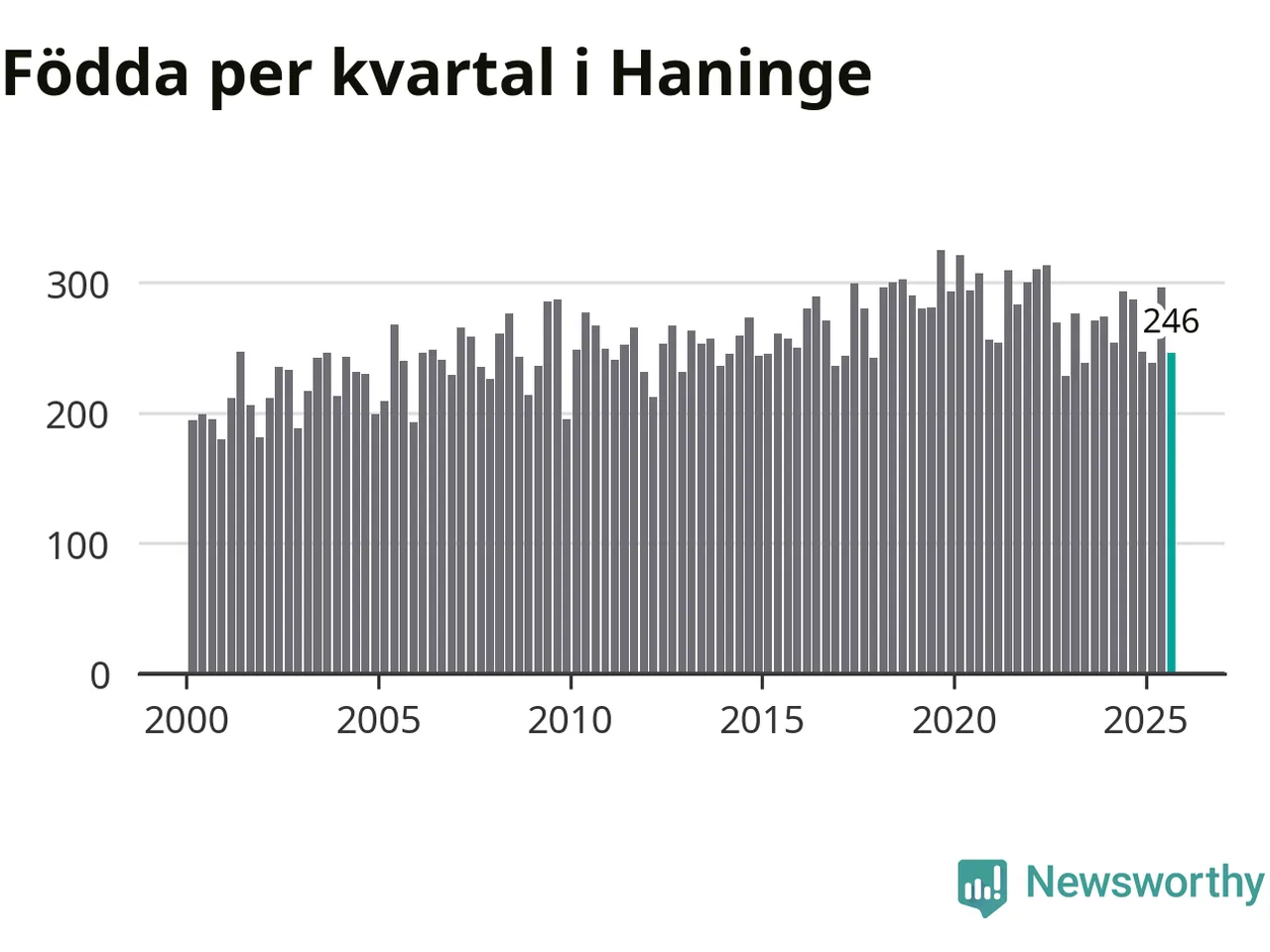 Enligt SCB:s siffror föddes 246 barn i Haninge under det senaste kvartalet. Samtidigt avled 141 personer. Haninge hade alltså ett positivt födelsenetto, vilket kommunen historiskt sett i princip alltid har haft.