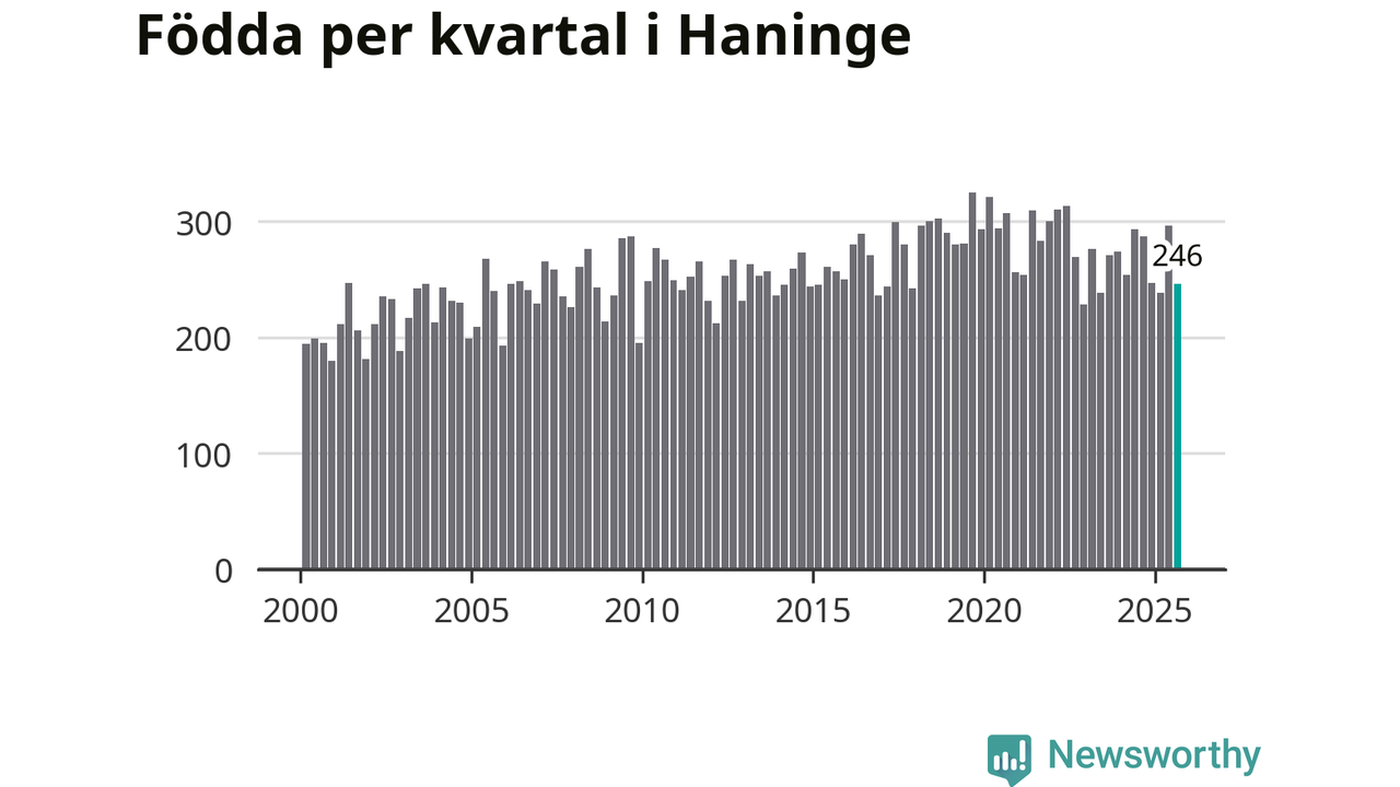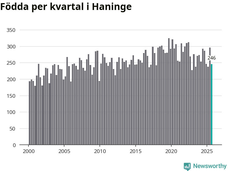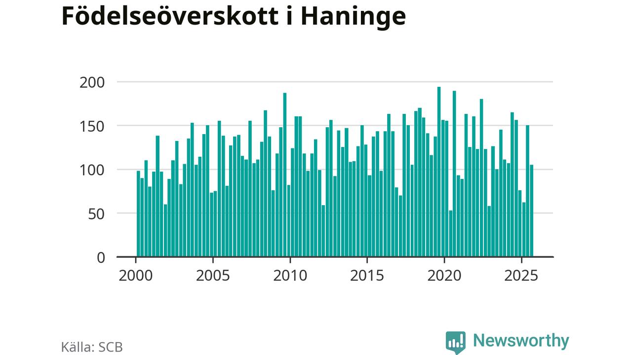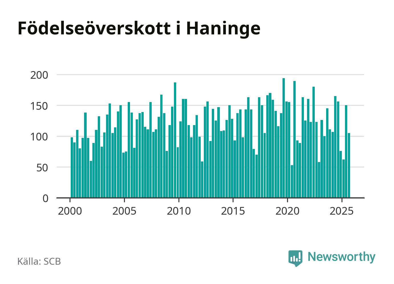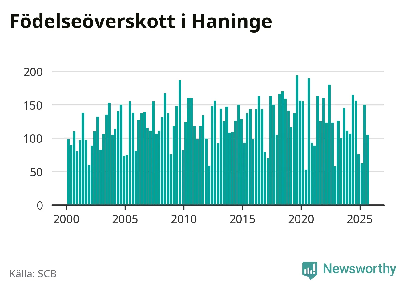 Enligt SCB:s siffror föddes 246 barn i Haninge under det senaste kvartalet. Samtidigt avled 141 personer. Haninge hade alltså ett positivt födelsenetto, vilket kommunen historiskt sett i princip alltid har haft.