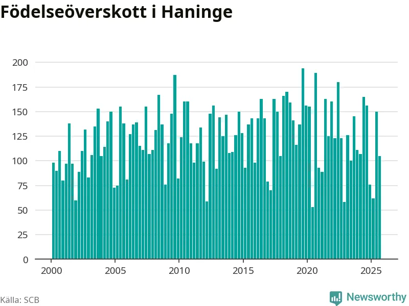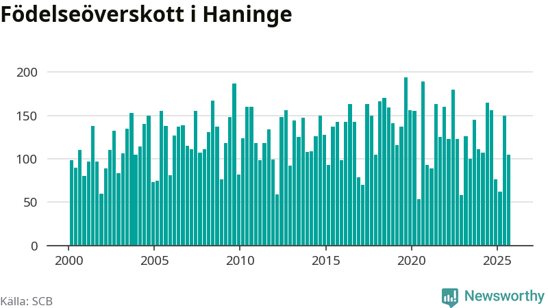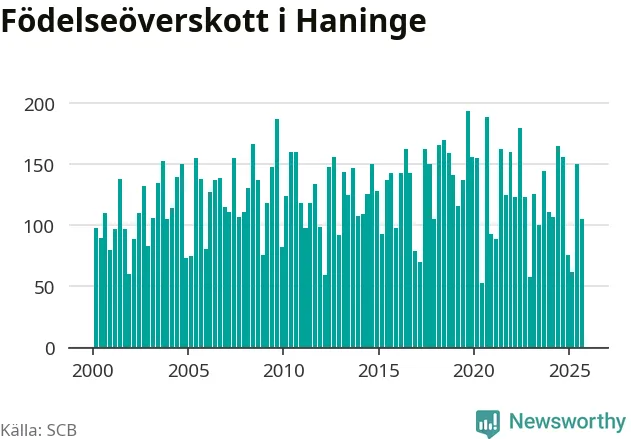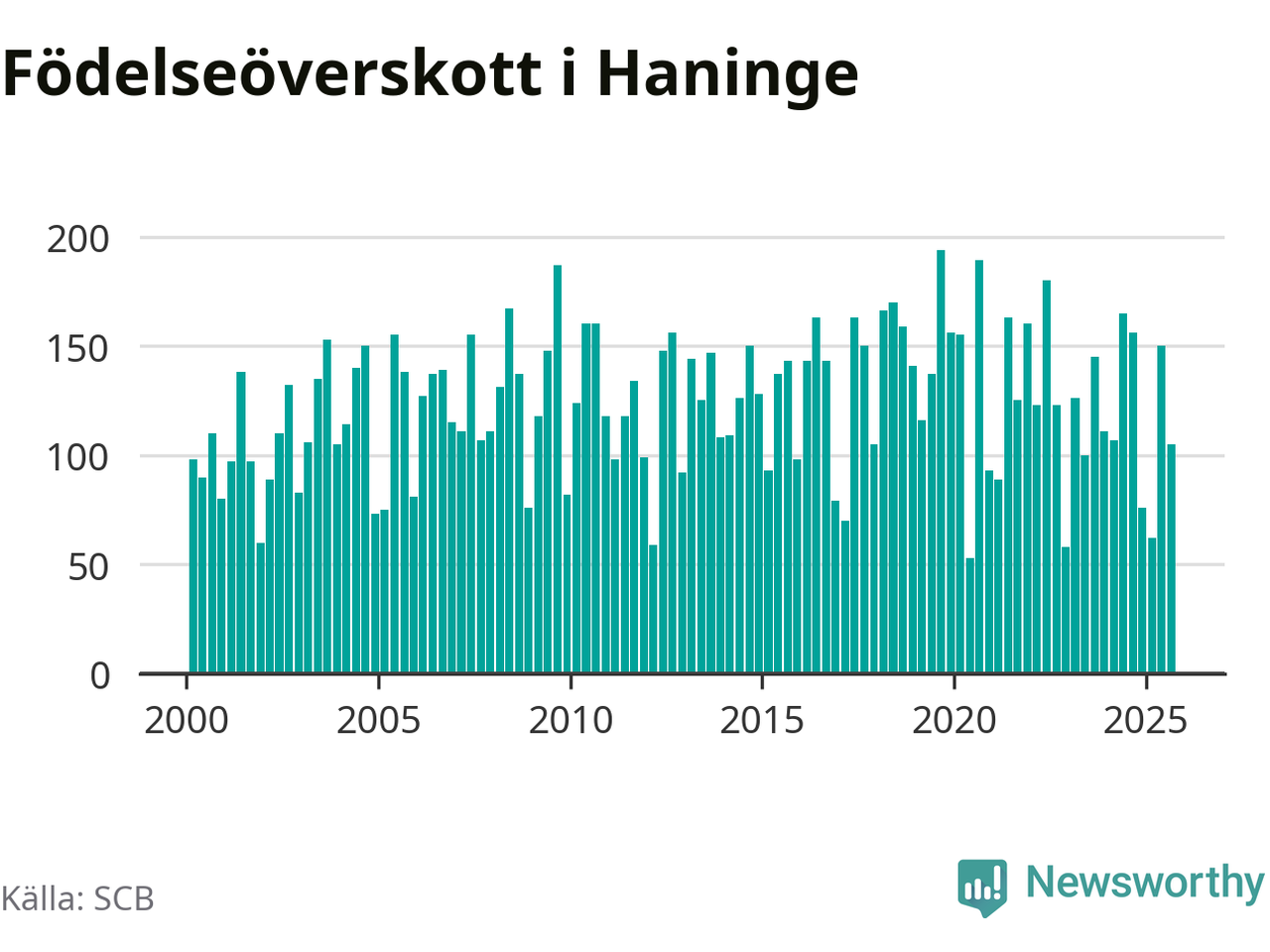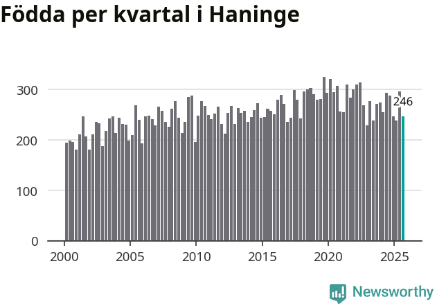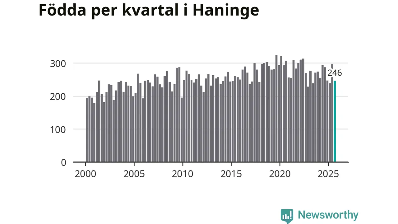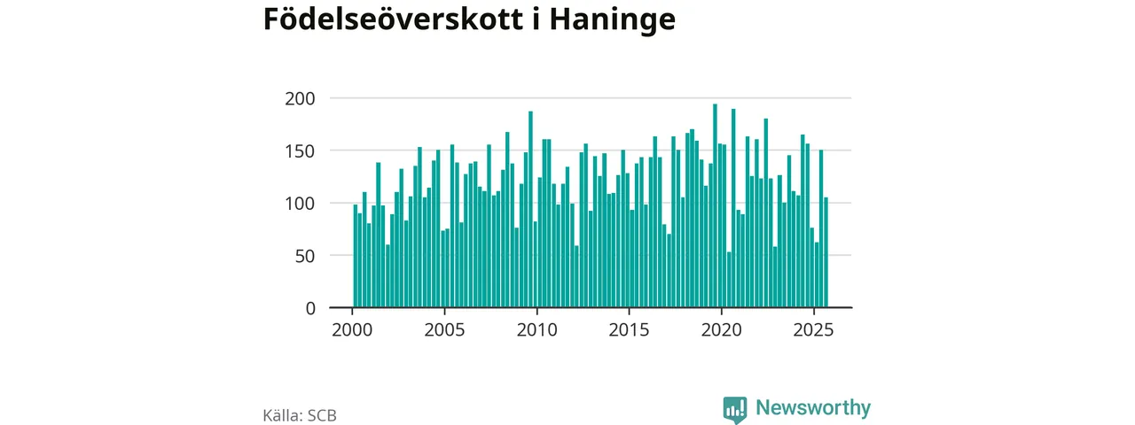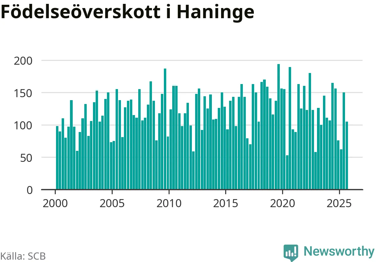 Enligt SCB:s siffror föddes 246 barn i Haninge under det senaste kvartalet. Samtidigt avled 141 personer. Haninge hade alltså ett positivt födelsenetto, vilket kommunen historiskt sett i princip alltid har haft.