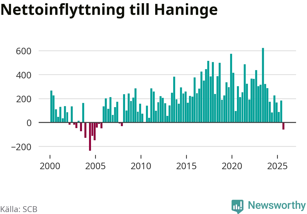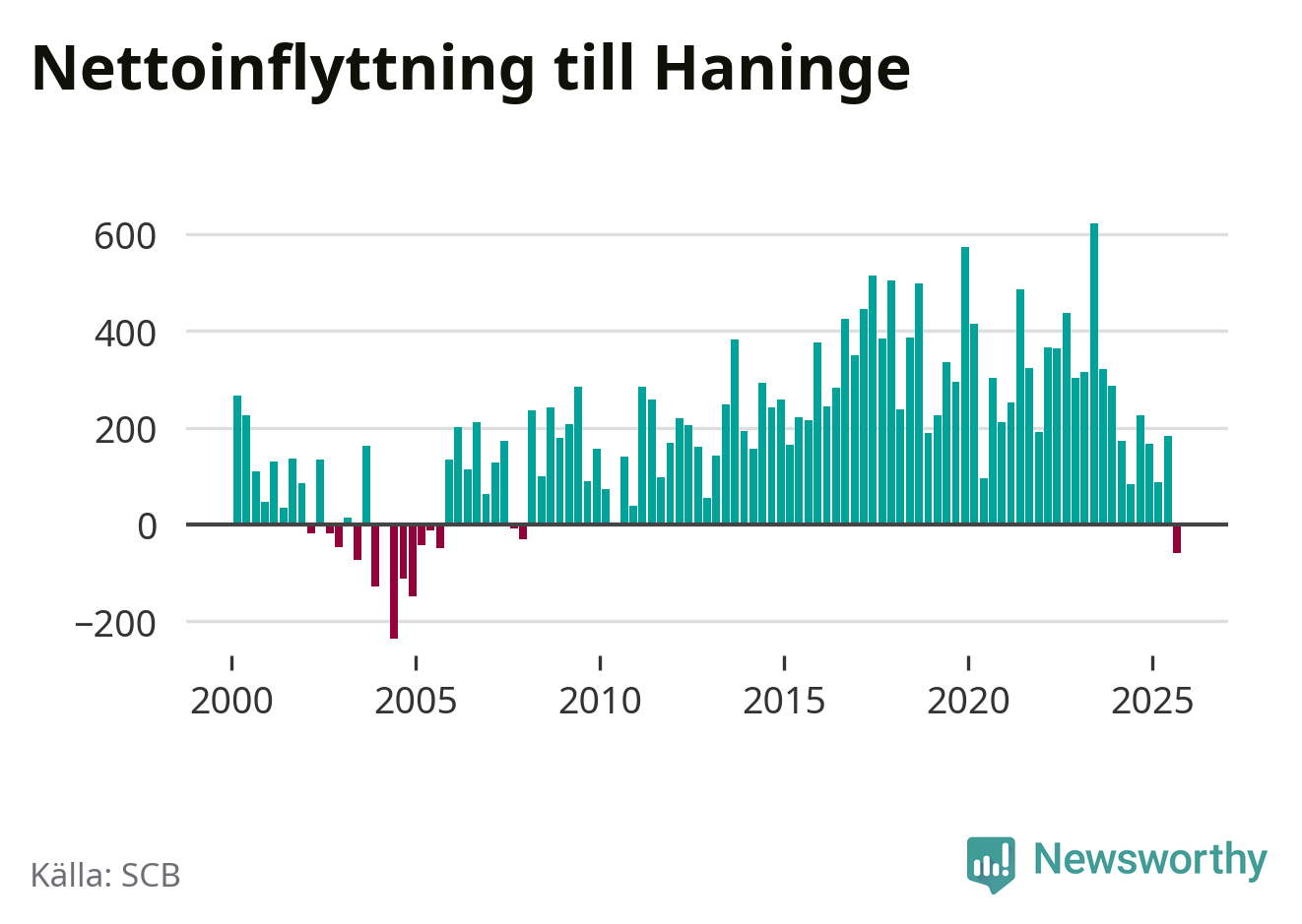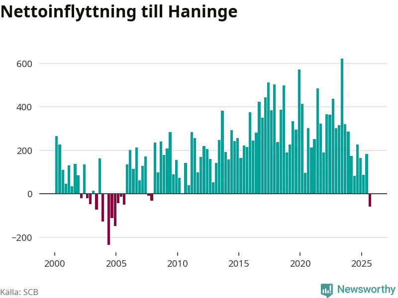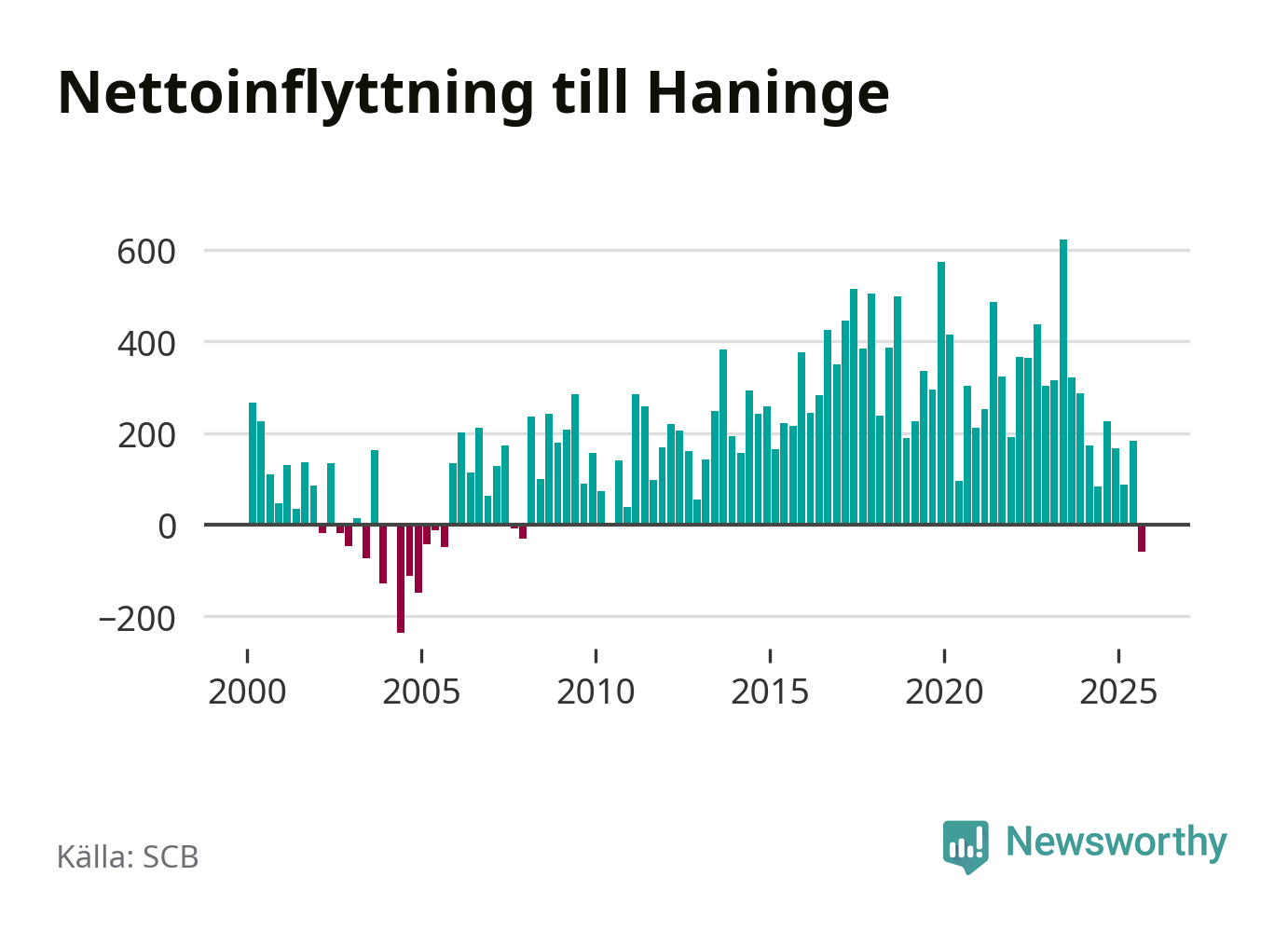Under tredje kvartalet 2025 flyttade 2 084 personer till kommunen medan 2 144 personer flyttade därifrån. Så många har inte flyttat från Haninge under något kvartal under det här seklet. Det är första gången sedan första kvartalet 2008 som fler flyttar från än till Haninge. Sedan seklets början har Haninge haft ett positivt flyttnetto under nästan alla kvartal.