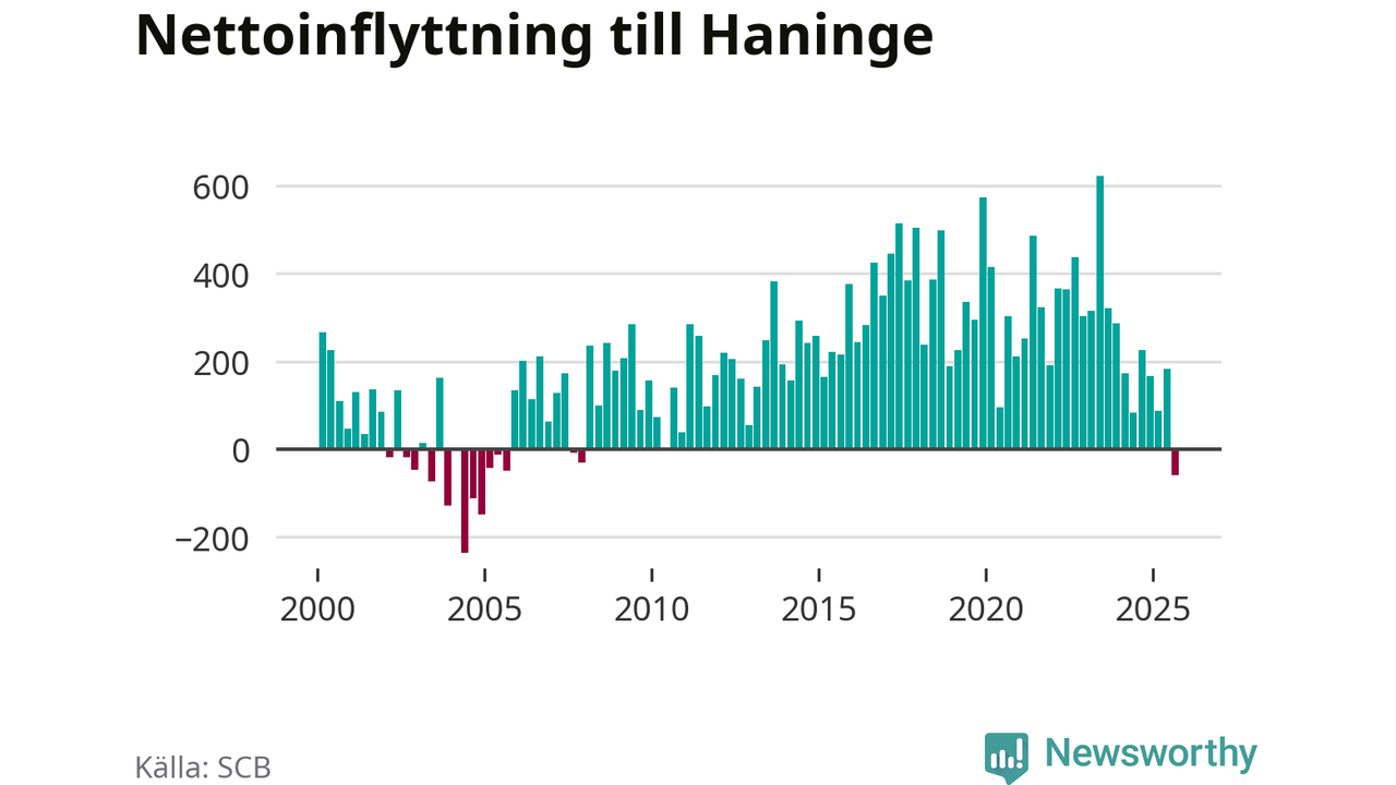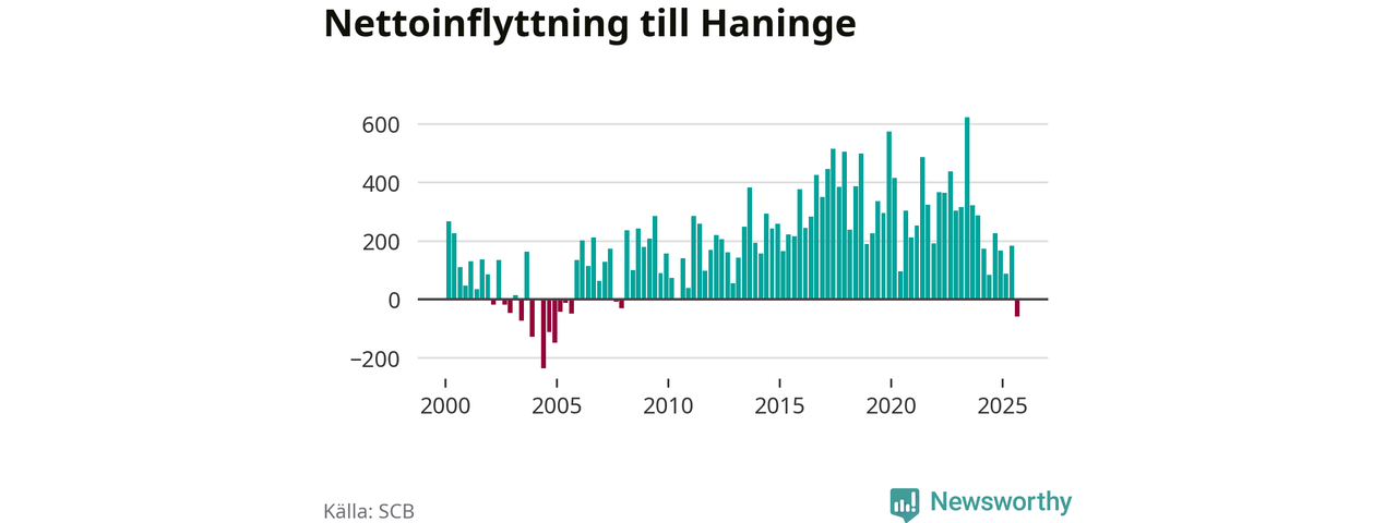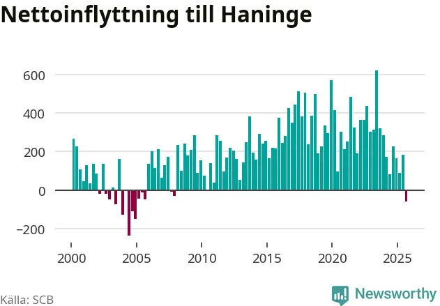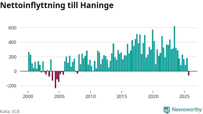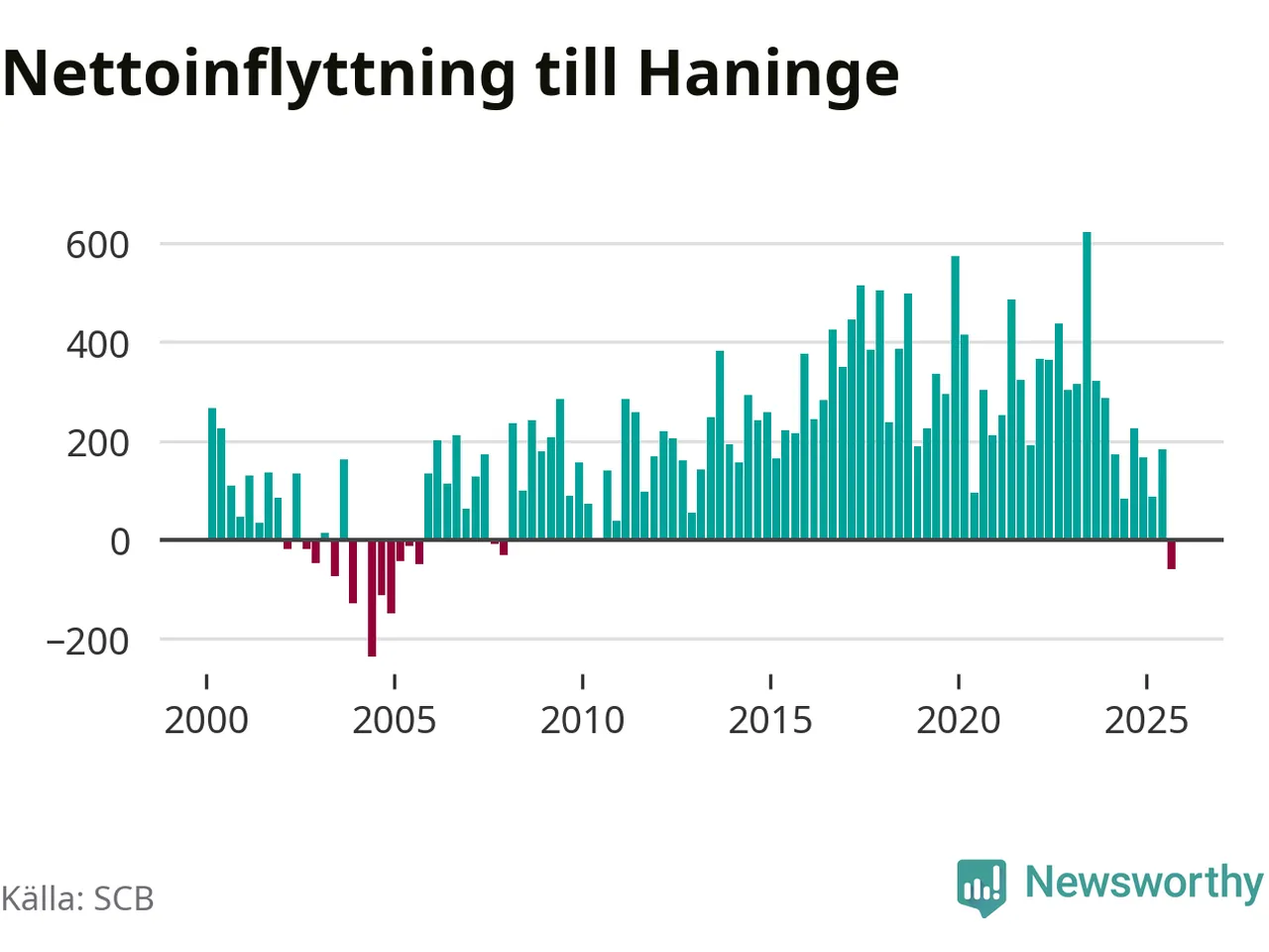 Under tredje kvartalet 2025 flyttade 2 084 personer till kommunen medan 2 144 personer flyttade därifrån. Så många har inte flyttat från Haninge under något kvartal under det här seklet. Det är första gången sedan första kvartalet 2008 som fler flyttar från än till Haninge. Sedan seklets början har Haninge haft ett positivt flyttnetto under nästan alla kvartal.