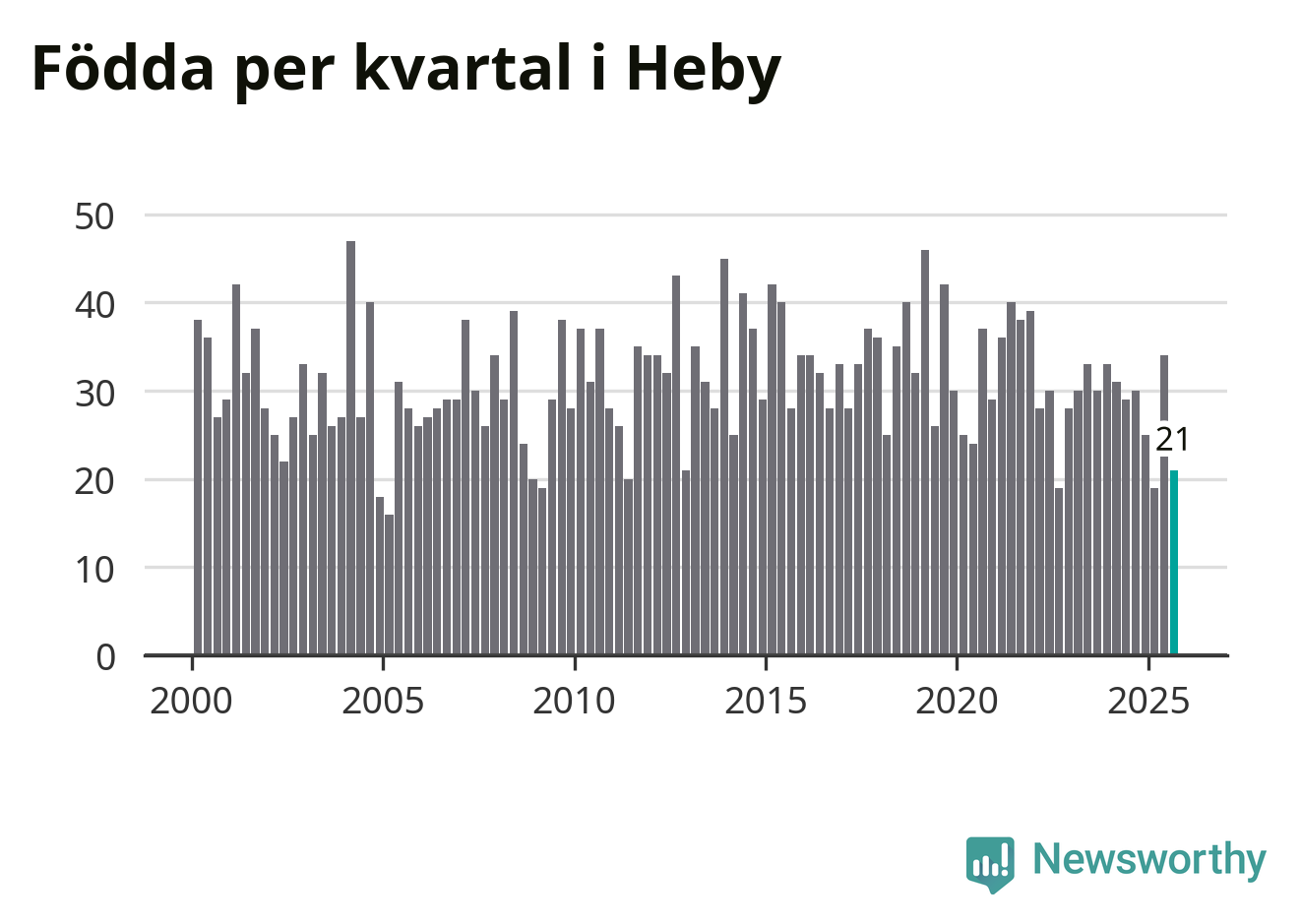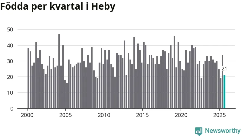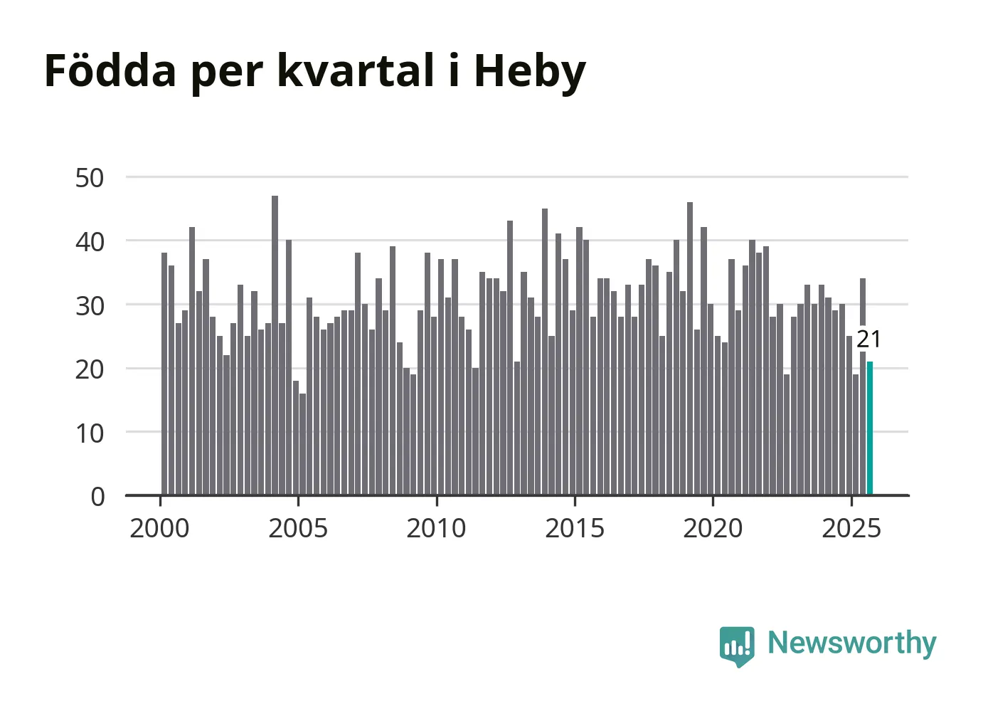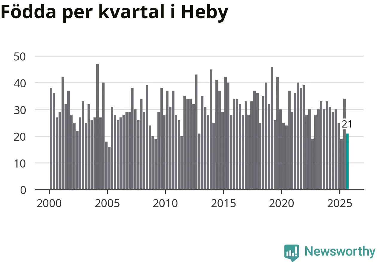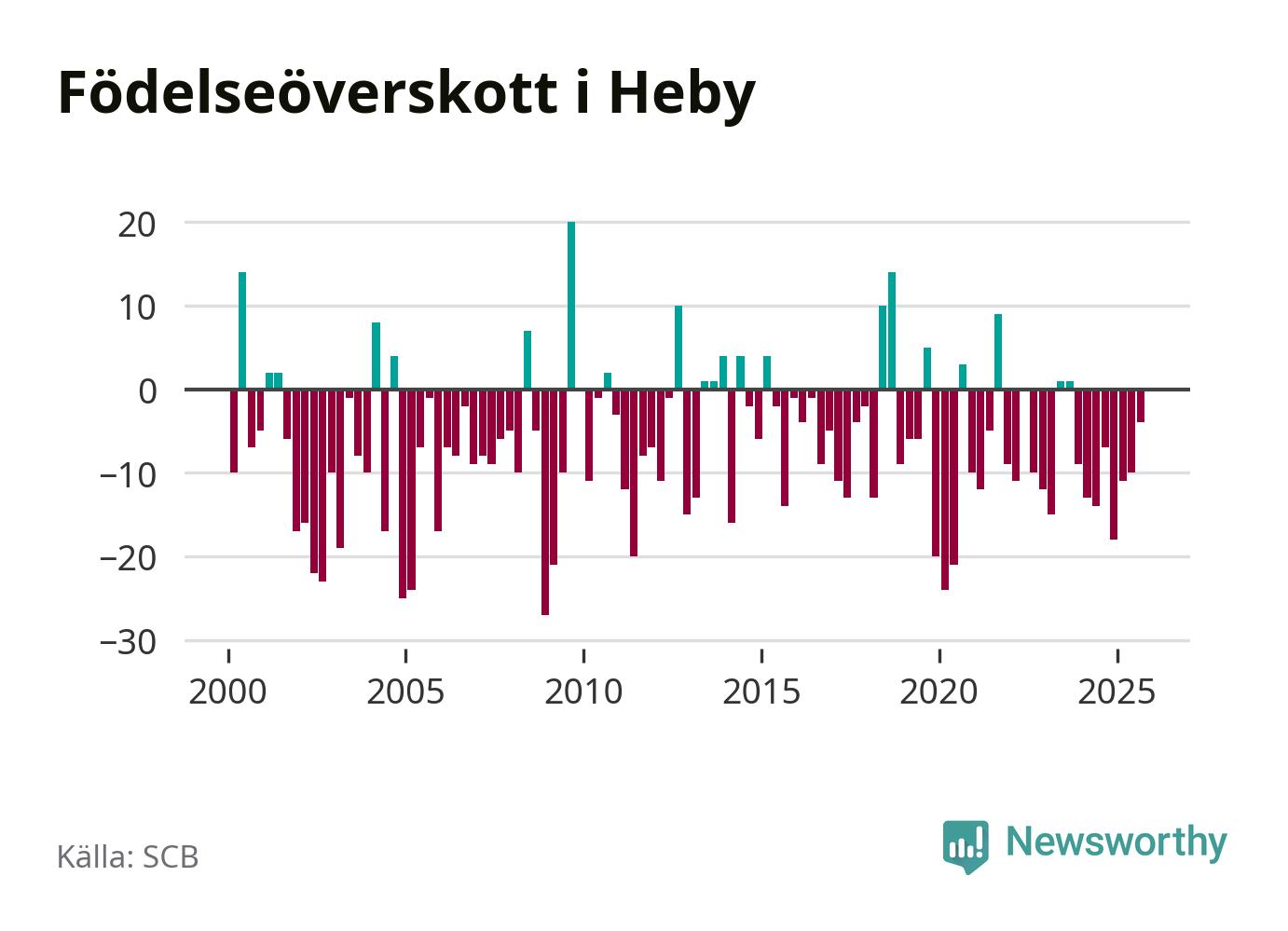 Enligt SCB:s siffror föddes 21 barn i Heby under det senaste kvartalet. Samtidigt avled 25 personer. Skillnaden mellan antal födda och döda är så liten att det inte går att säga om det beror på något annat än SCB:s röjandeskydd. Kommunen har oftast haft negativt födelsenetto tidigare.