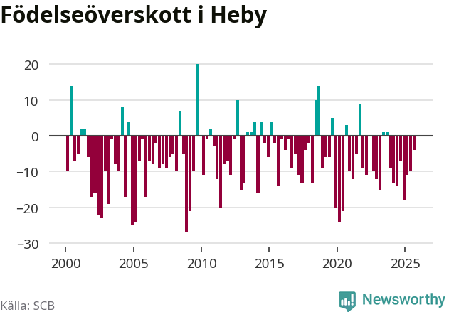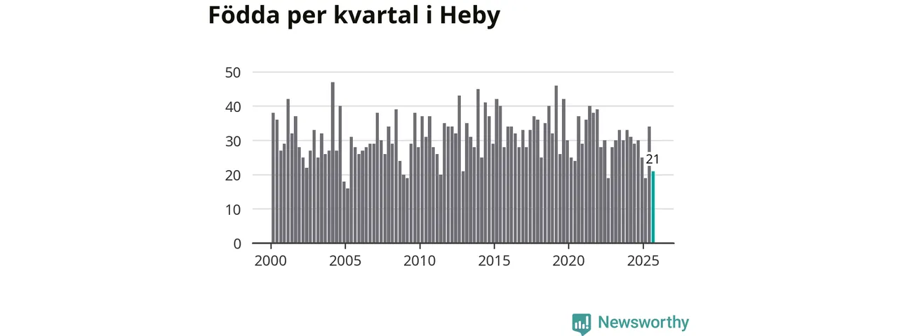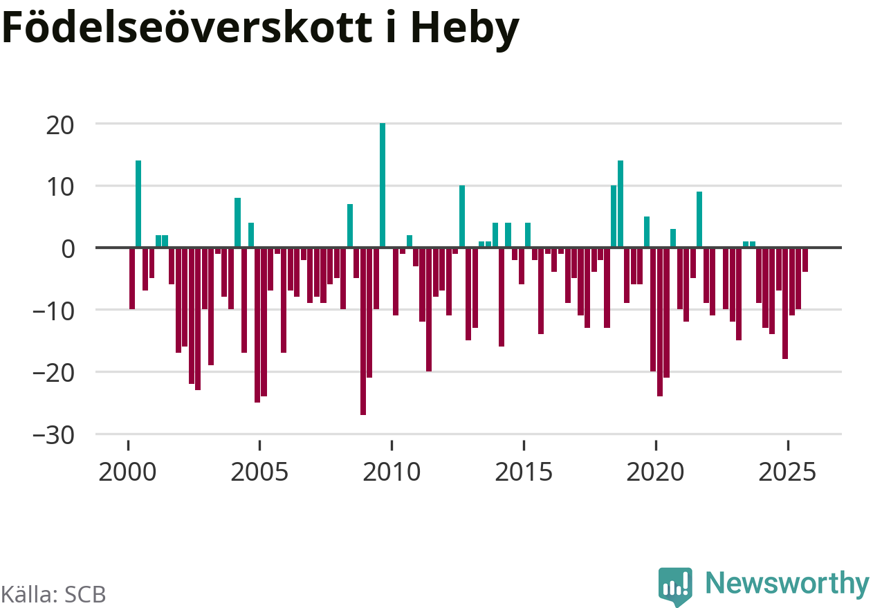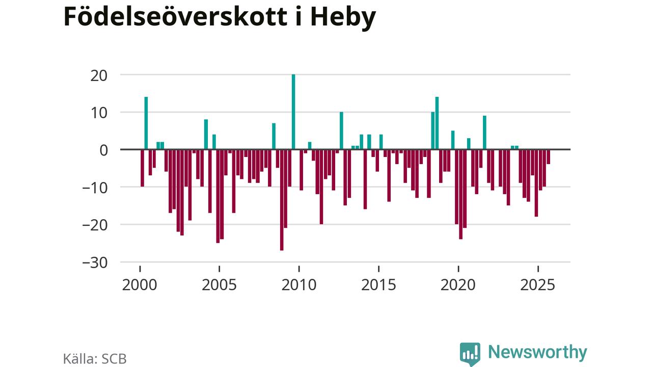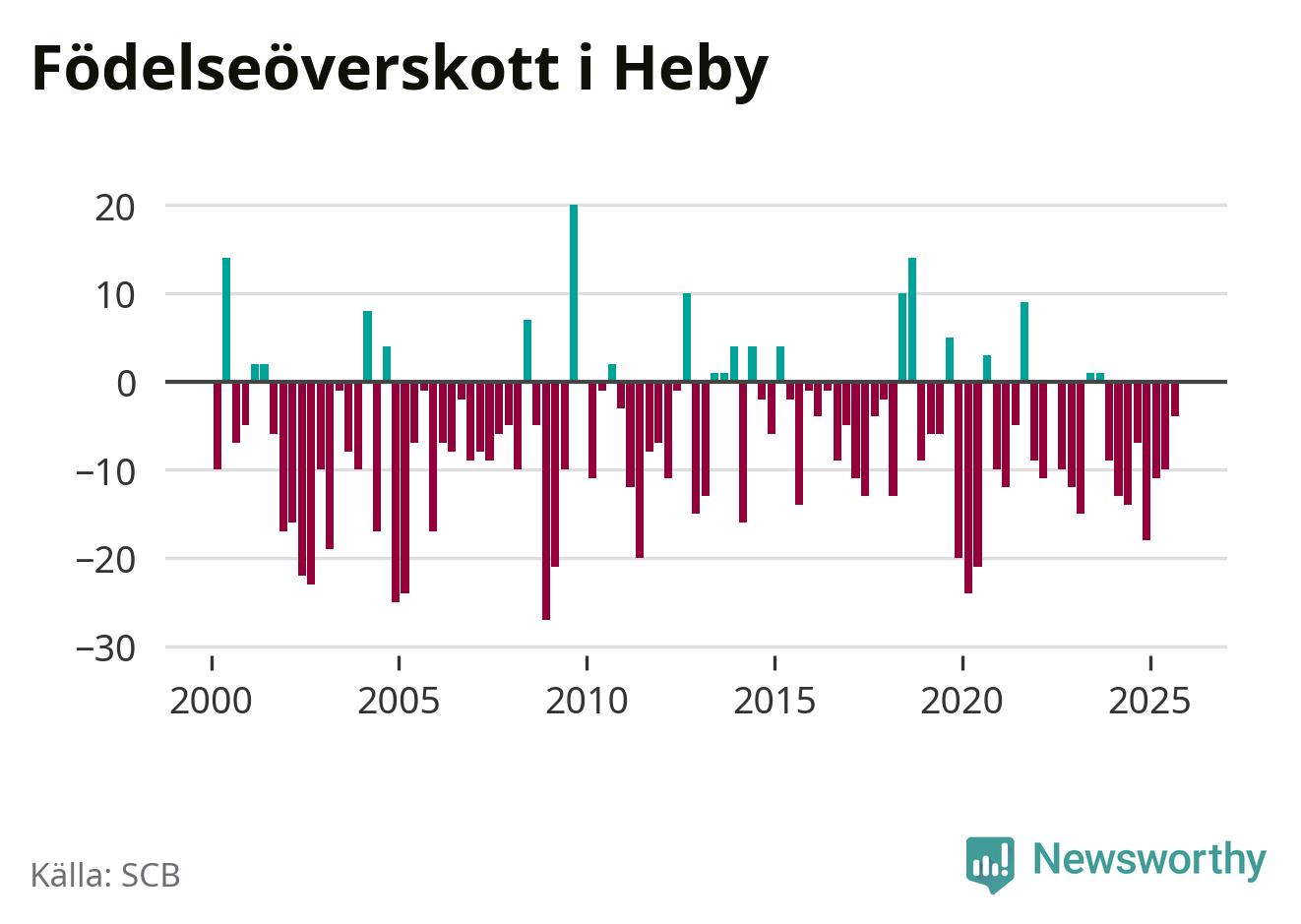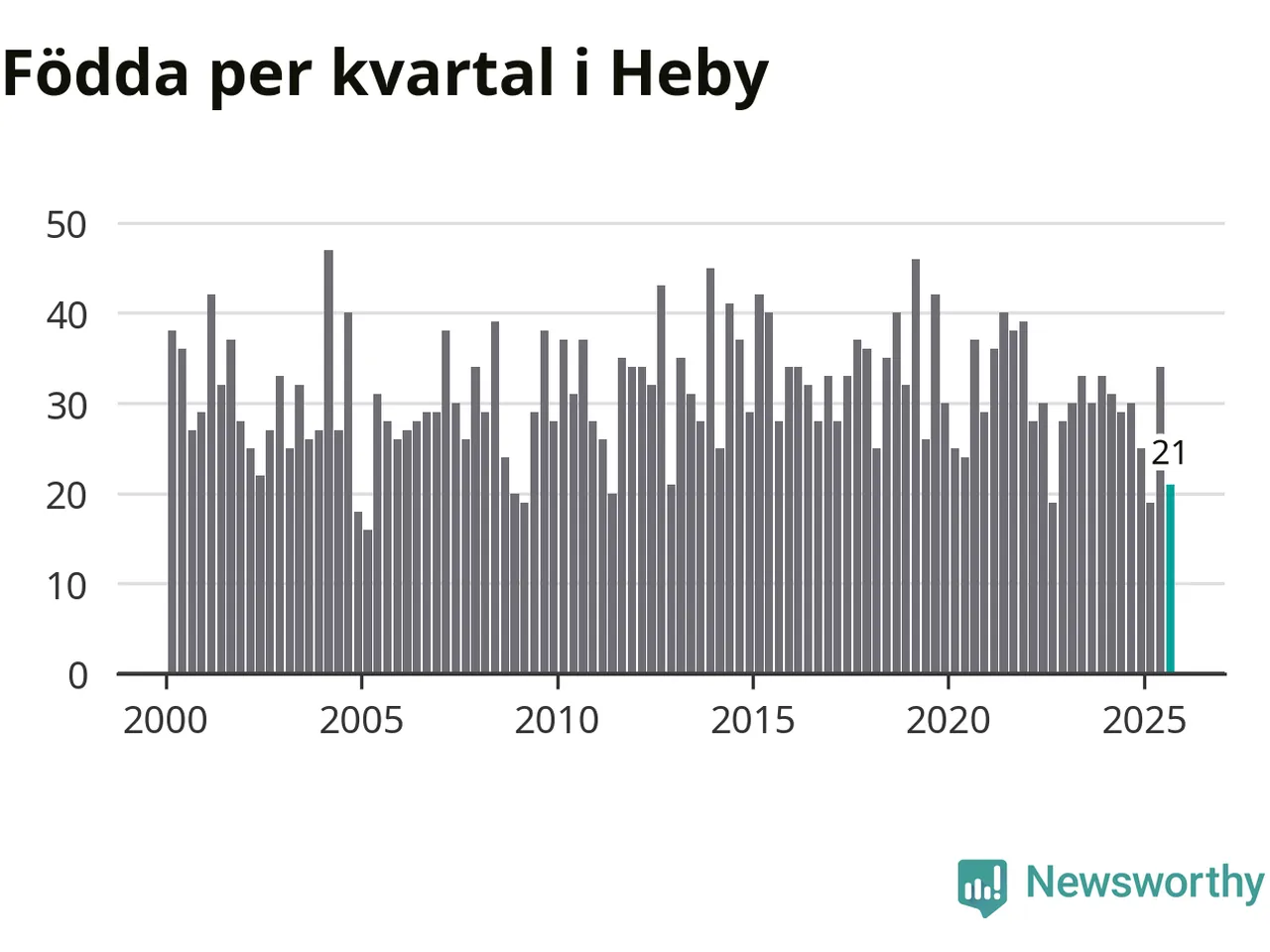 Enligt SCB:s siffror föddes 21 barn i Heby under det senaste kvartalet. Samtidigt avled 25 personer. Skillnaden mellan antal födda och döda är så liten att det inte går att säga om det beror på något annat än SCB:s röjandeskydd. Kommunen har oftast haft negativt födelsenetto tidigare.