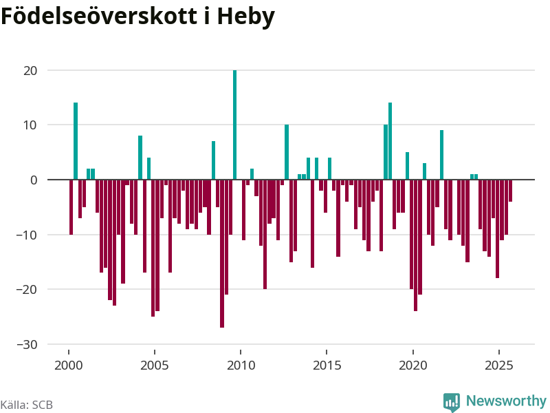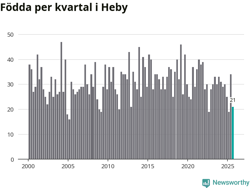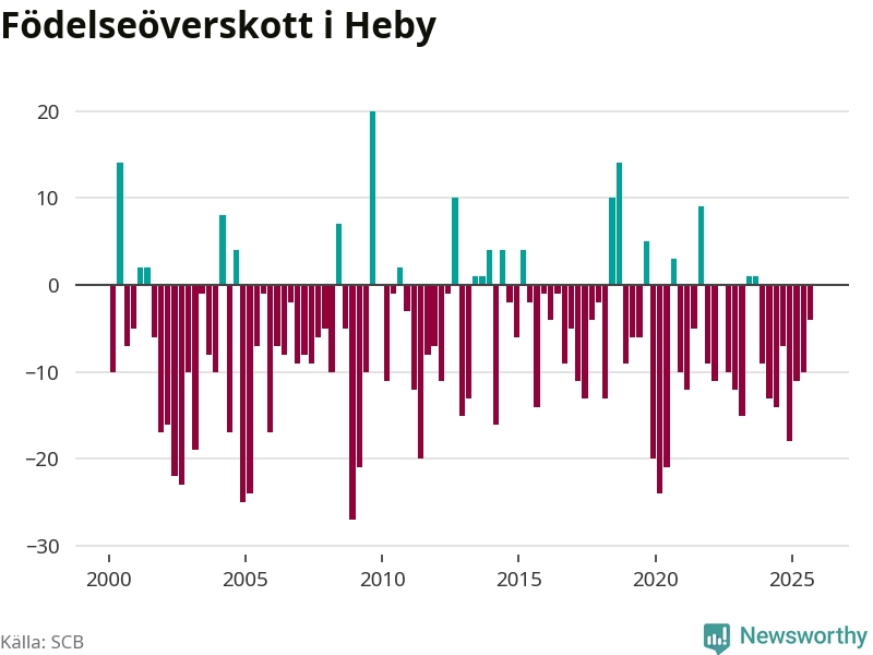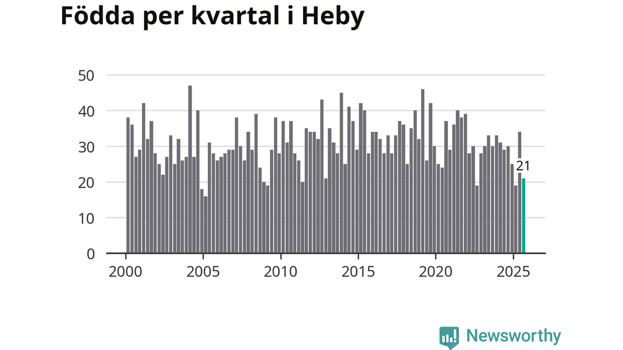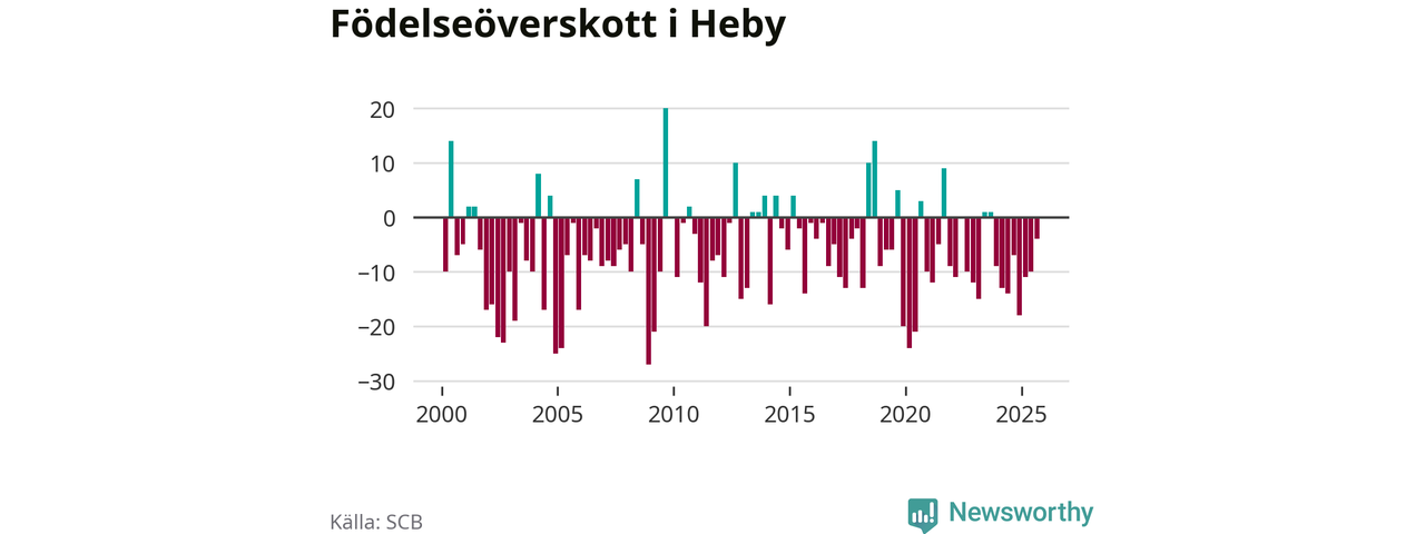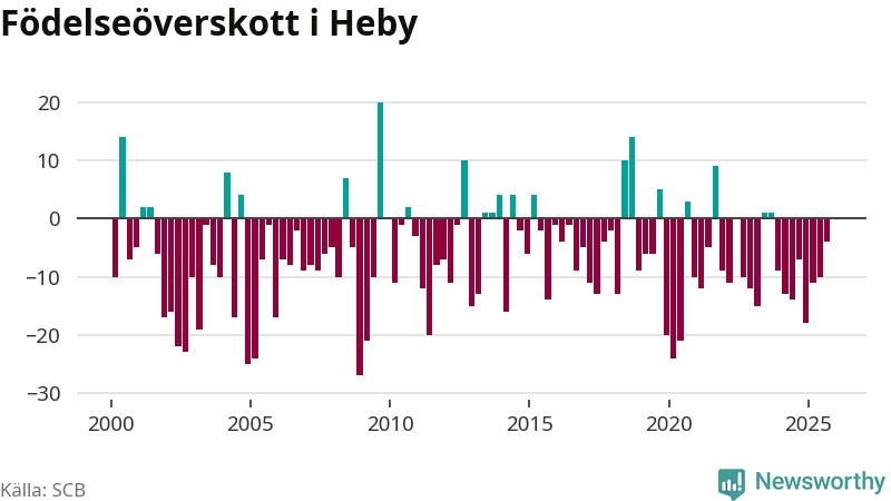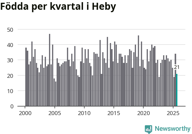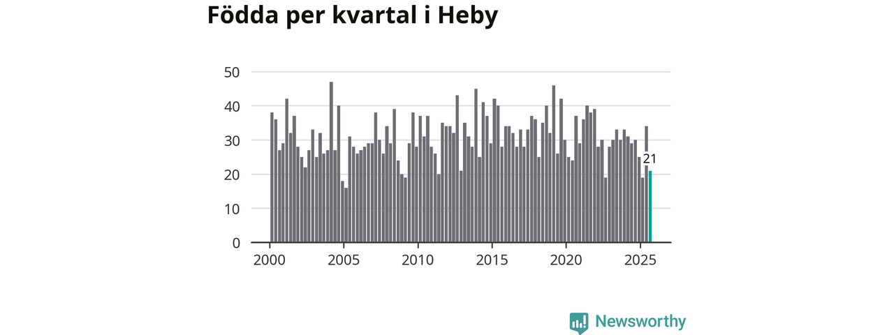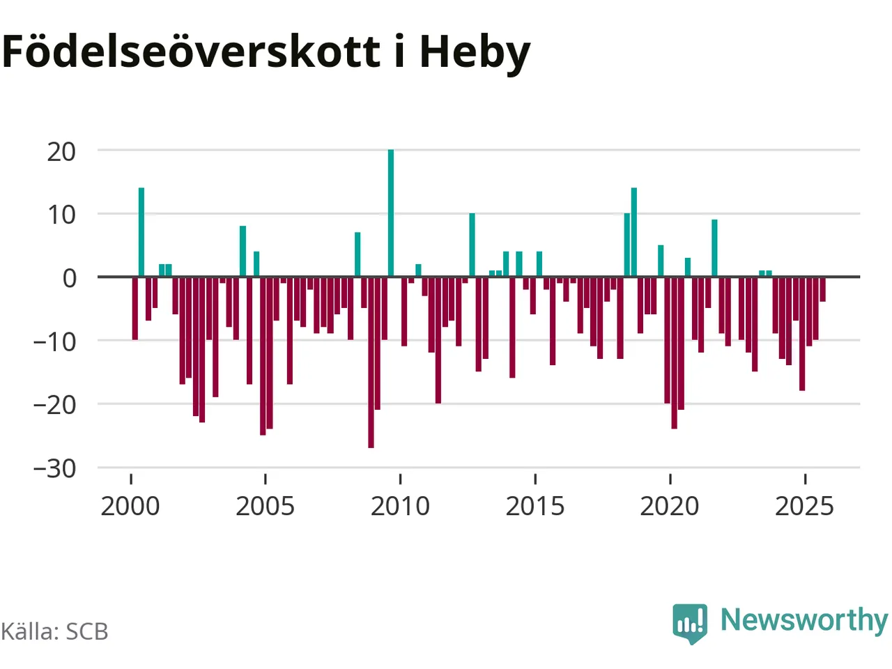 Enligt SCB:s siffror föddes 21 barn i Heby under det senaste kvartalet. Samtidigt avled 25 personer. Skillnaden mellan antal födda och döda är så liten att det inte går att säga om det beror på något annat än SCB:s röjandeskydd. Kommunen har oftast haft negativt födelsenetto tidigare.